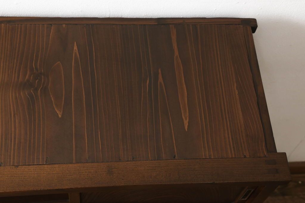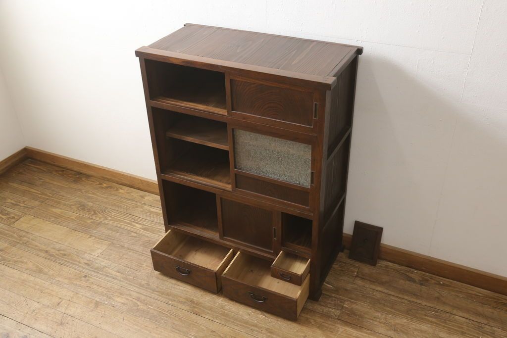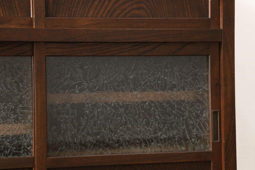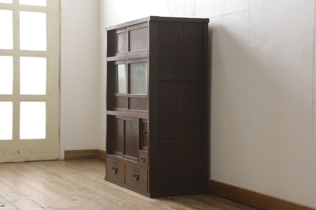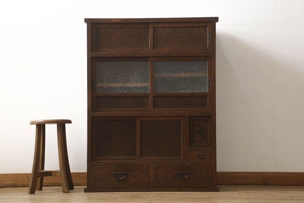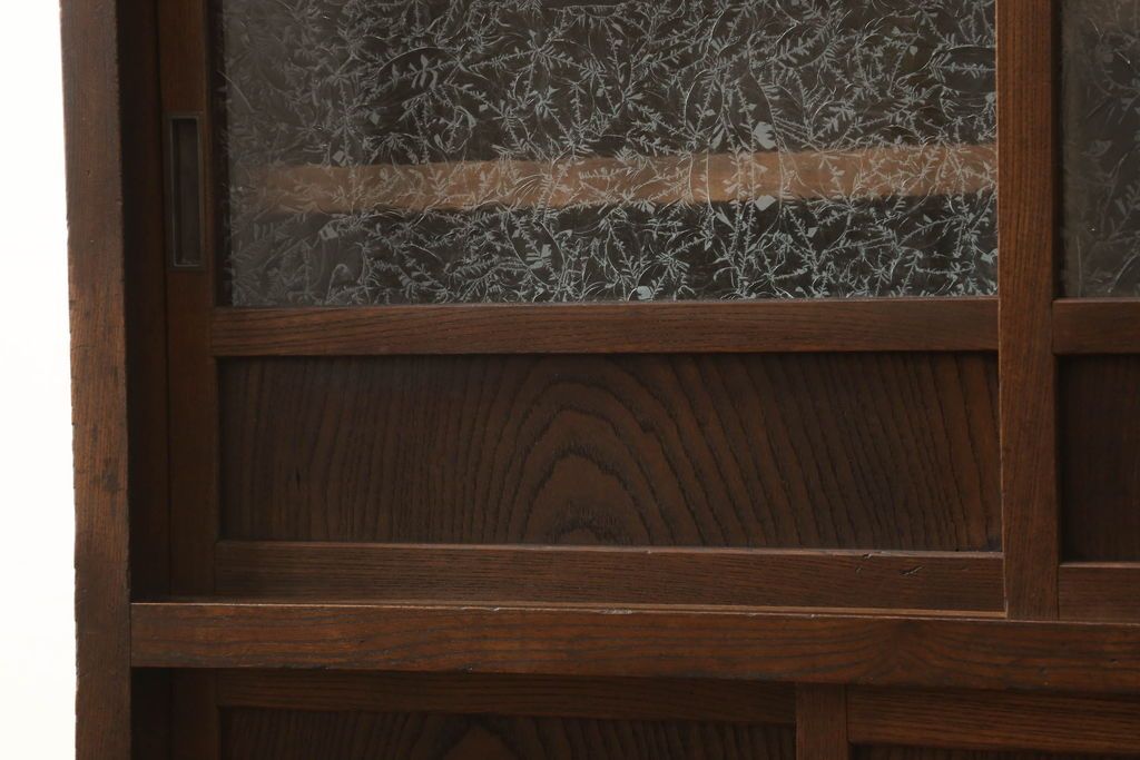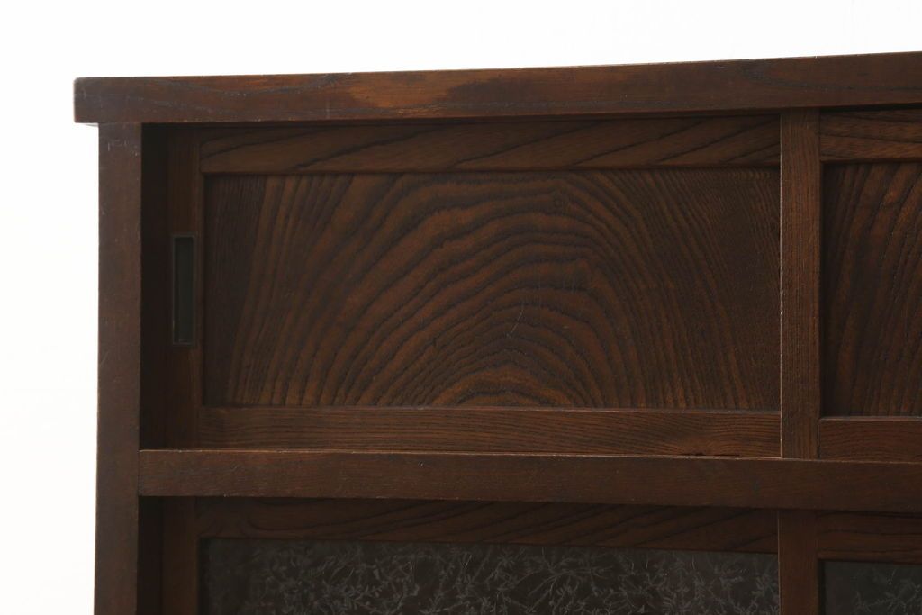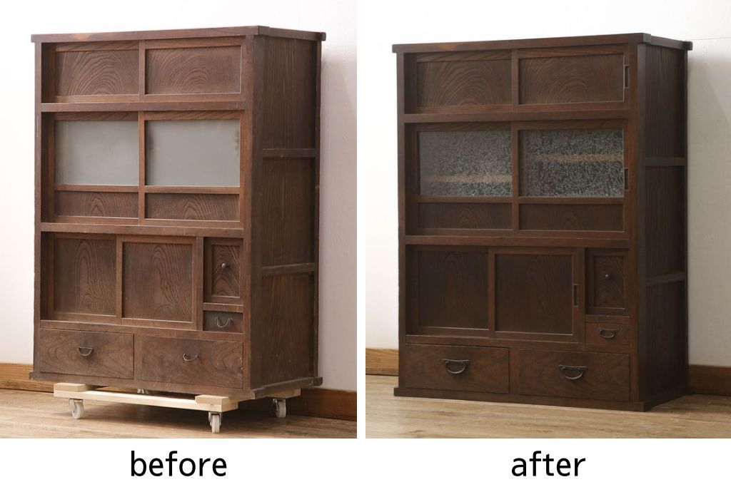 和箪笥> 水屋箪笥 > 関東水屋箪笥をリペア&カスタム!既存のガラスから結霜ガラスに取り替え、中段引き戸内を中央縦方向に左右を分割し、取り外し可能な棚板を取り付け、取っ手を交換。本体は現状のお品物に合わせて1トーン程落ち着いた色に着色し、修繕箇所は本体と馴染ませ仕上げ。(食器棚、キャビネット、収納棚)