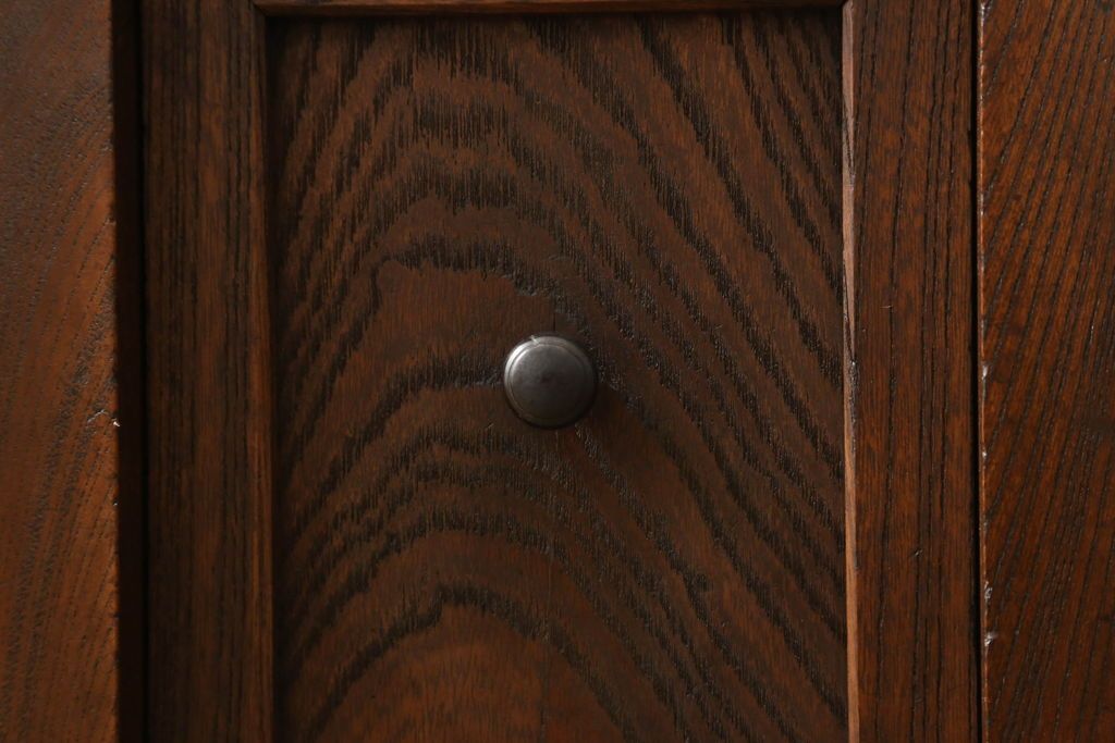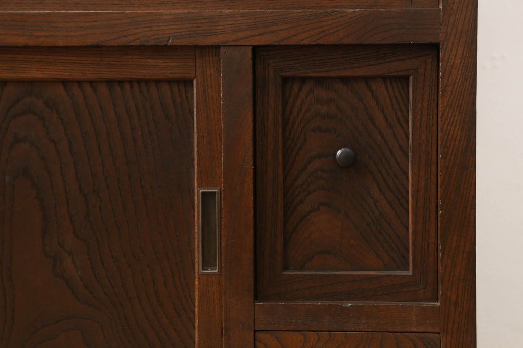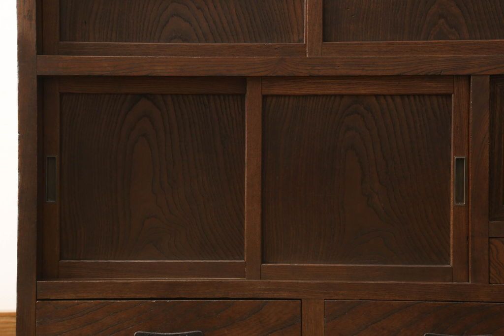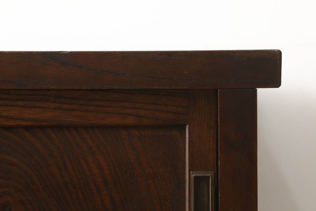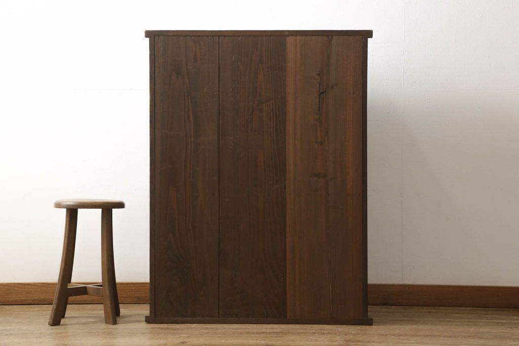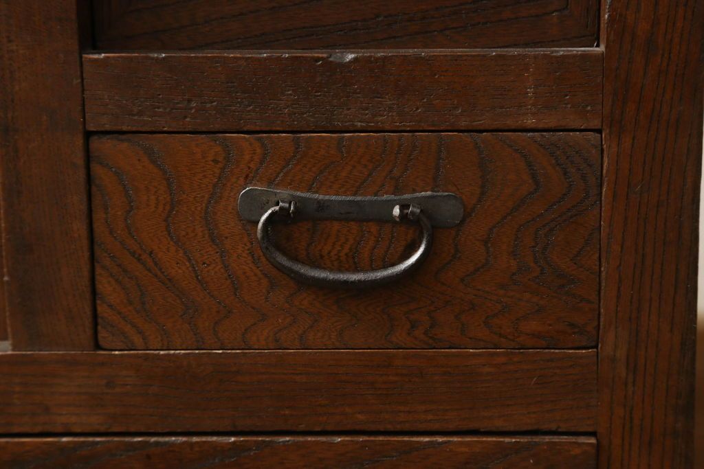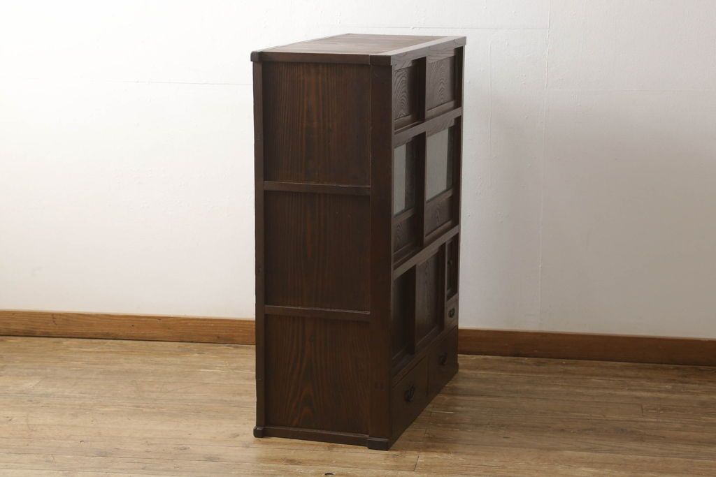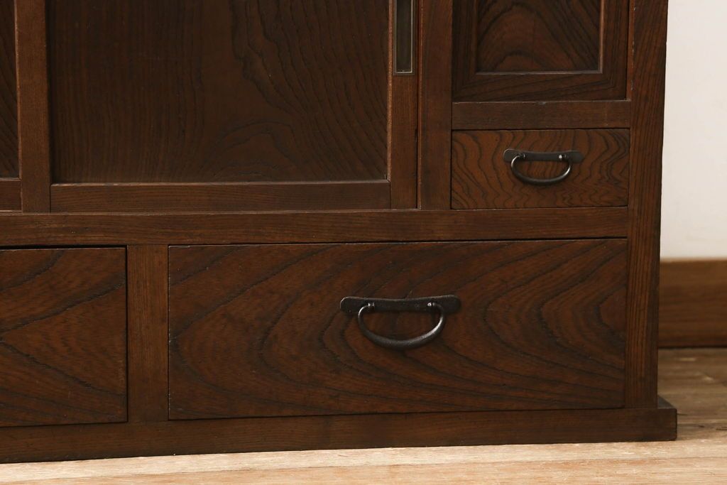 和箪笥> 水屋箪笥 > 関東水屋箪笥をリペア&カスタム!既存のガラスから結霜ガラスに取り替え、中段引き戸内を中央縦方向に左右を分割し、取り外し可能な棚板を取り付け、取っ手を交換。本体は現状のお品物に合わせて1トーン程落ち着いた色に着色し、修繕箇所は本体と馴染ませ仕上げ。(食器棚、キャビネット、収納棚)