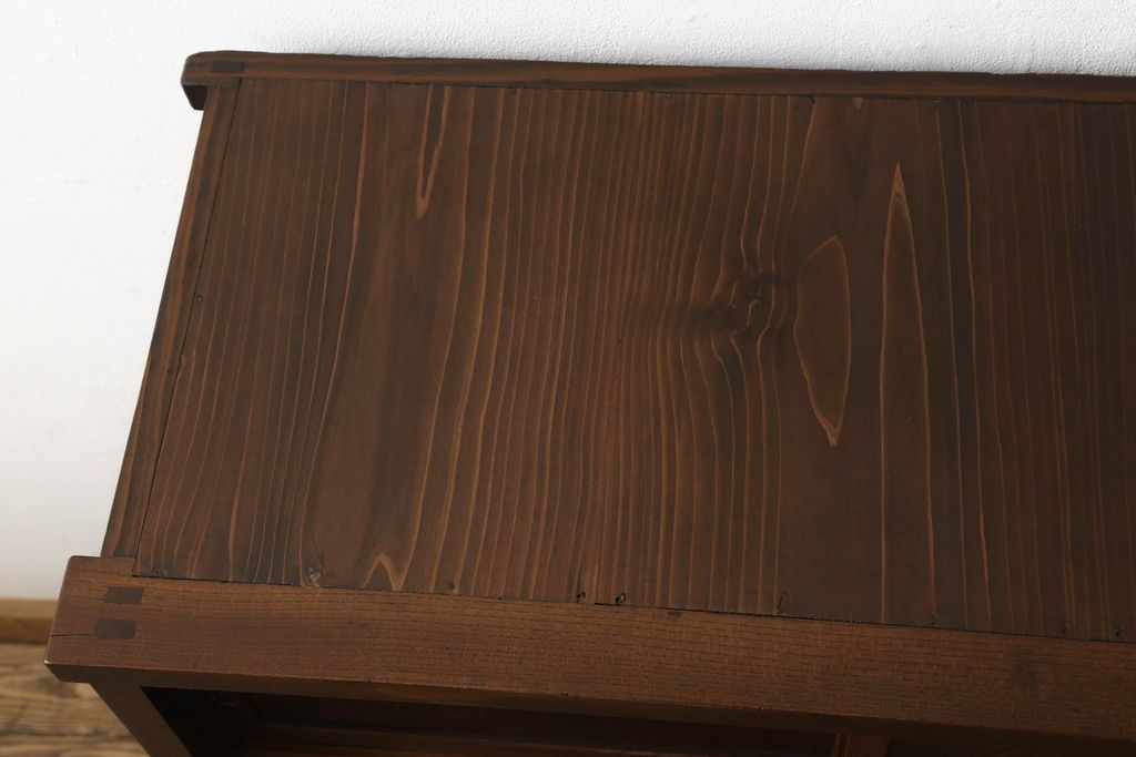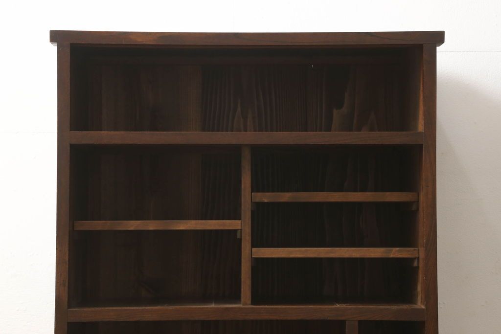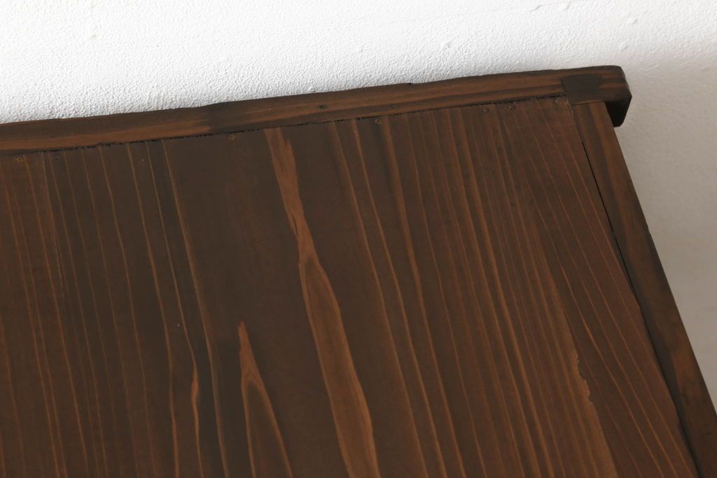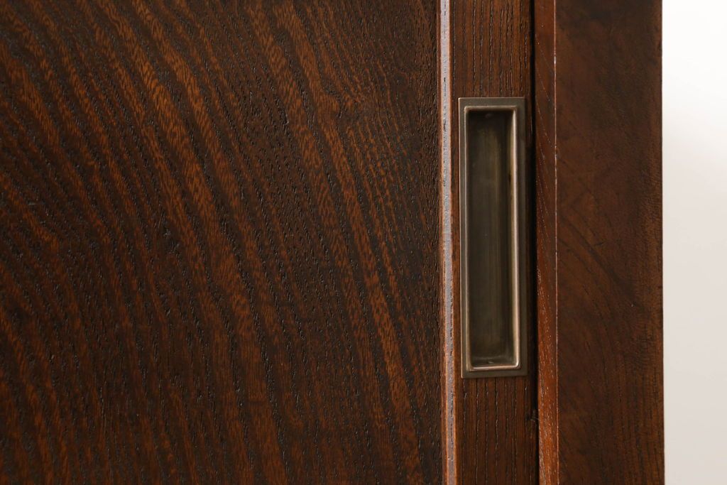 セミオーダー家具実績 > 関東水屋箪笥をリペア&カスタム!既存のガラスから結霜ガラスに取り替え、中段引き戸内を中央縦方向に左右を分割し、取り外し可能な棚板を取り付け、取っ手を交換。本体は現状のお品物に合わせて1トーン程落ち着いた色に着色し、修繕箇所は本体と馴染ませ仕上げ。(食器棚、キャビネット、収納棚)