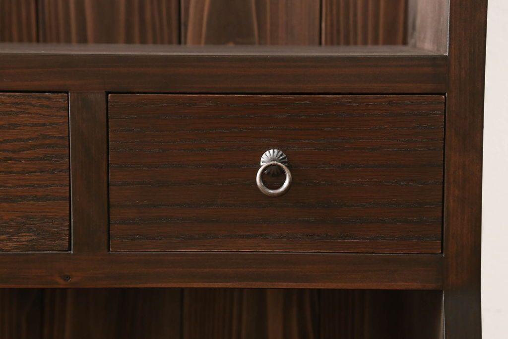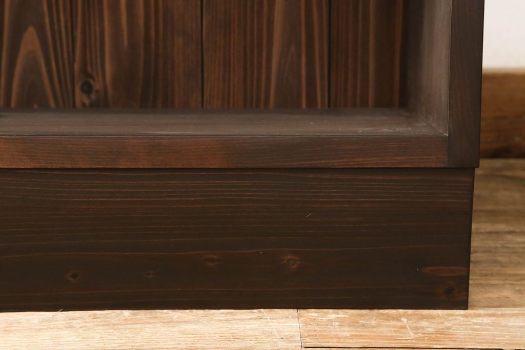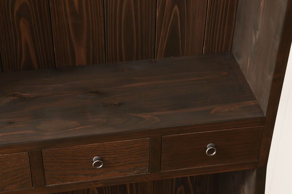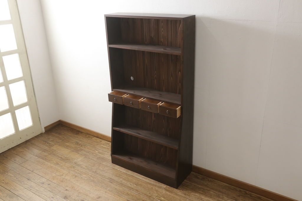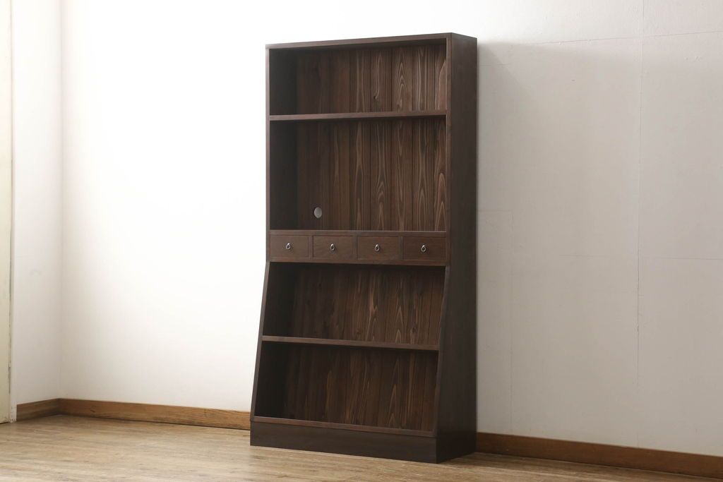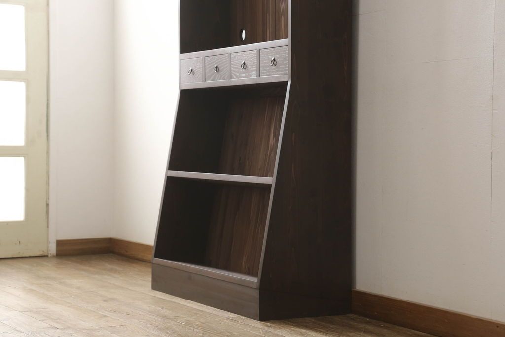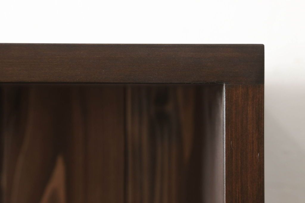 オープンラック・シェルフ > ブックシェルフを新規製作!当店の商品を参考にしたデザイン・希望のサイズにて。配線穴開け加工をし、色味は茶色1色に着色。(収納棚、本棚、ウッドシェルフ)