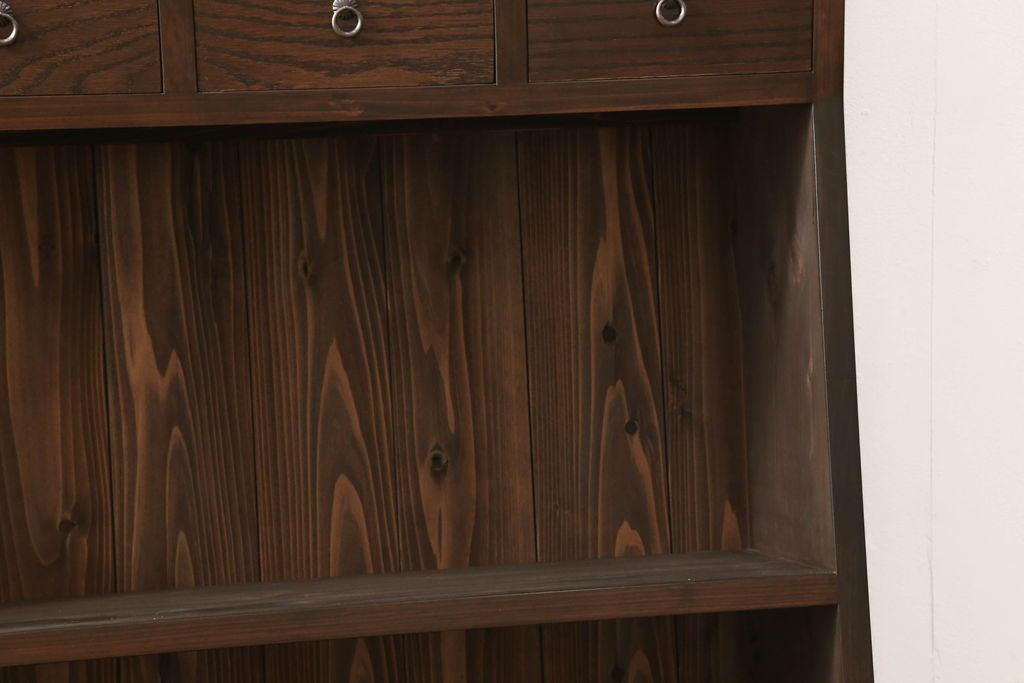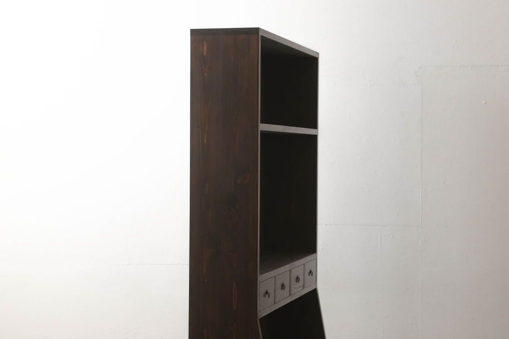 ブックシェルフを新規製作!当店の商品を参考にしたデザイン・希望のサイズにて。配線穴開け加工をし、色味は茶色1色に着色。(収納棚、本棚、ウッドシェルフ)