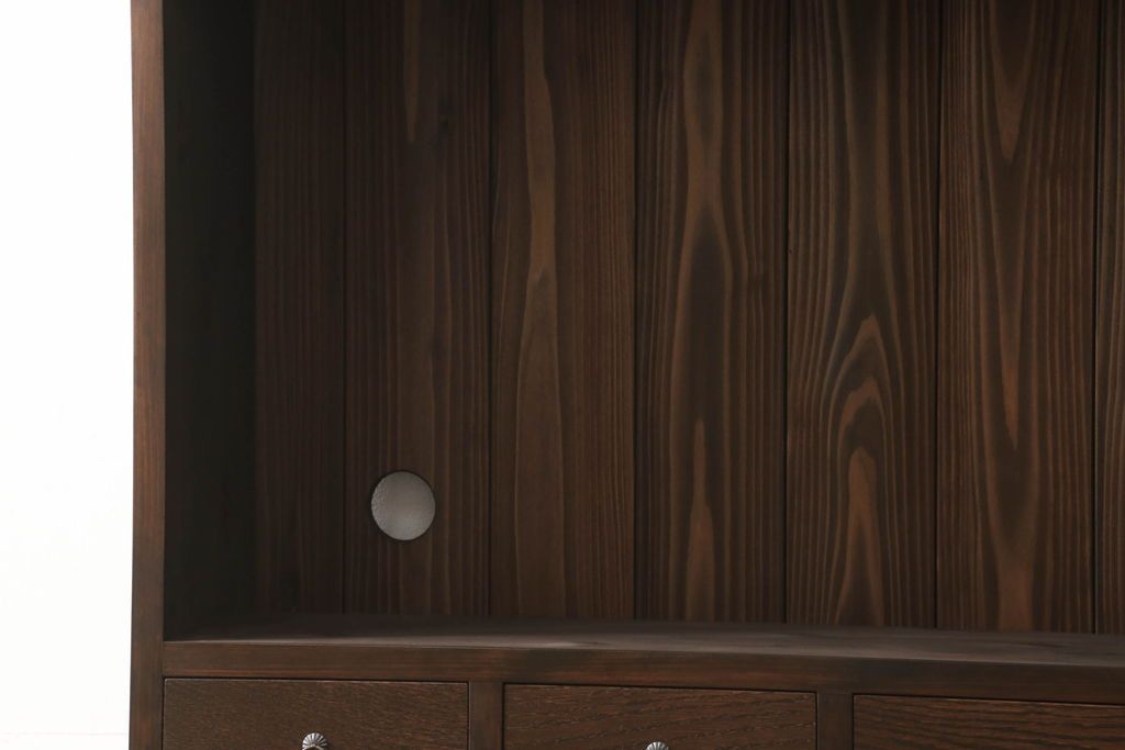 フルオーダー家具実績 > ブックシェルフを新規製作!当店の商品を参考にしたデザイン・希望のサイズにて。配線穴開け加工をし、色味は茶色1色に着色。(収納棚、本棚、ウッドシェルフ)