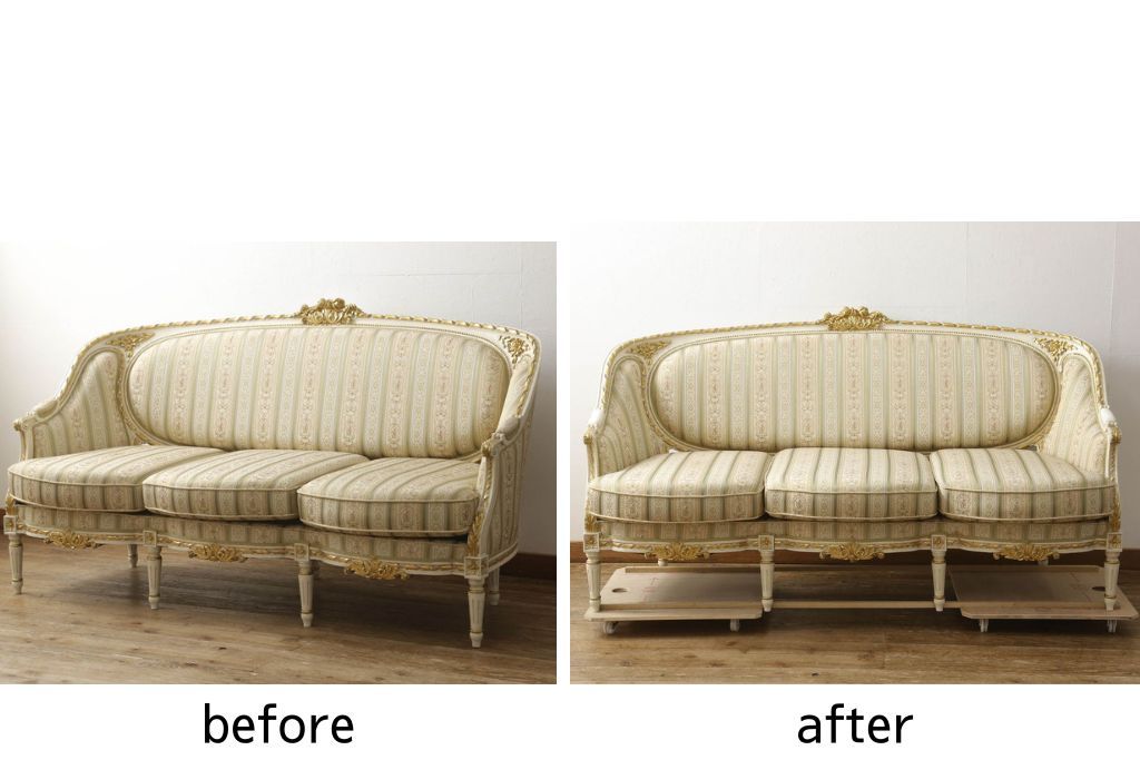 セミオーダー家具実績 > 3人掛けソファをリペア&カスタム!ご希望のフェイクレザーで左右アームの張地を張り替え、ブレードも取り付け。(三人掛け、3P)