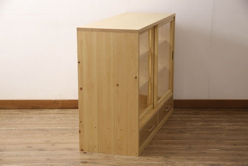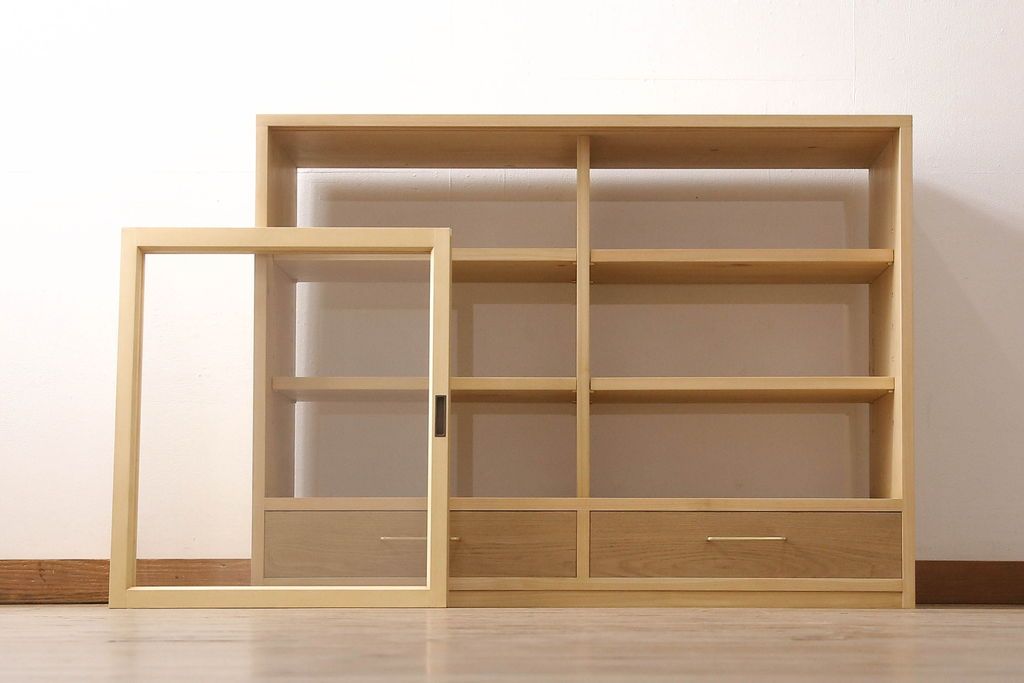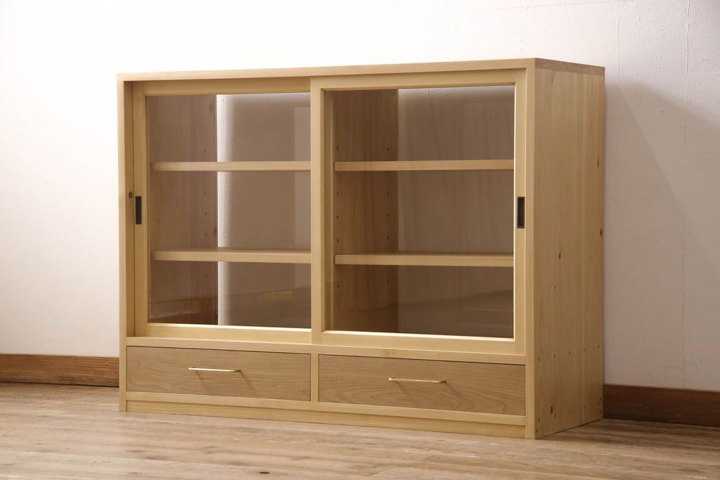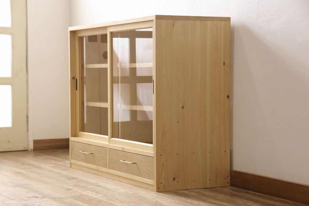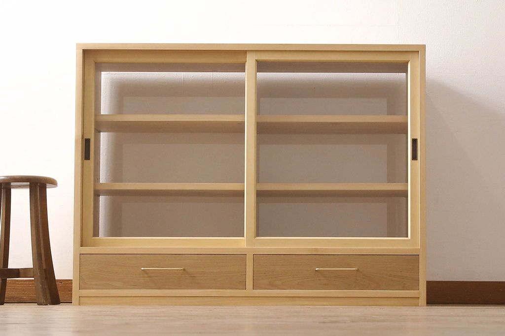 キャビネット・戸棚> 食器棚・カップボード > 戸棚を新規製作!当店商品を参考にご希望サイズで。棚板2枚、下段引き出し2杯仕様にて製作。持ち込みの金具を取付け、引き戸は十字に入っている支柱をなしにして木枠のみ。背面はクリアガラス仕様。全体はワックス、 天板は耐水性を上げるためウレタン塗料を使用して仕上げ。(収納棚、戸棚、キャビネット、サイドボード、食器棚)