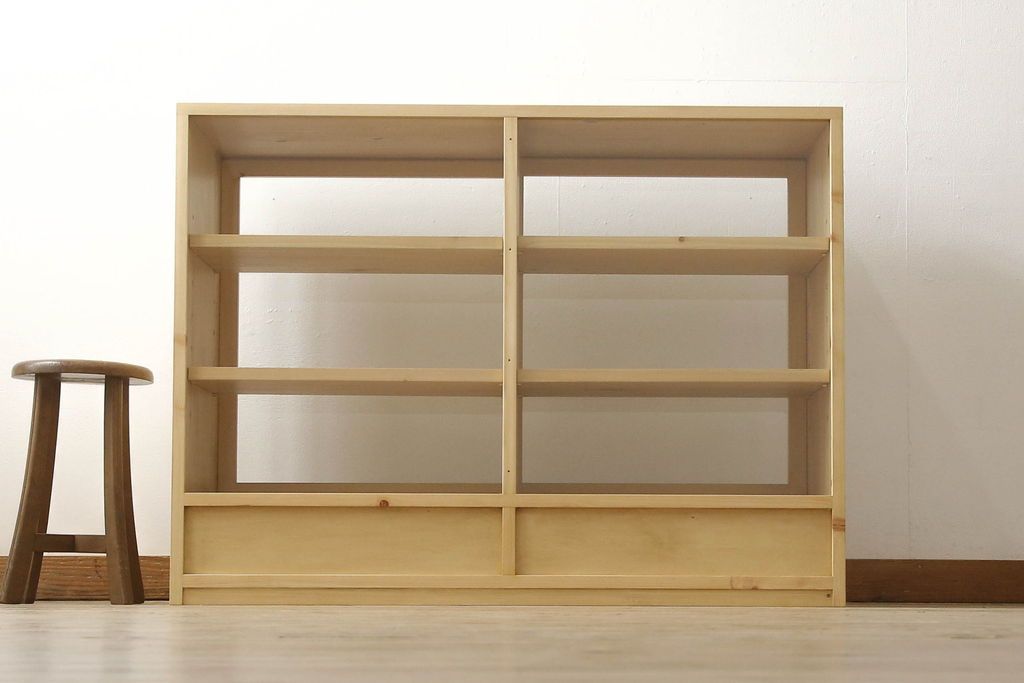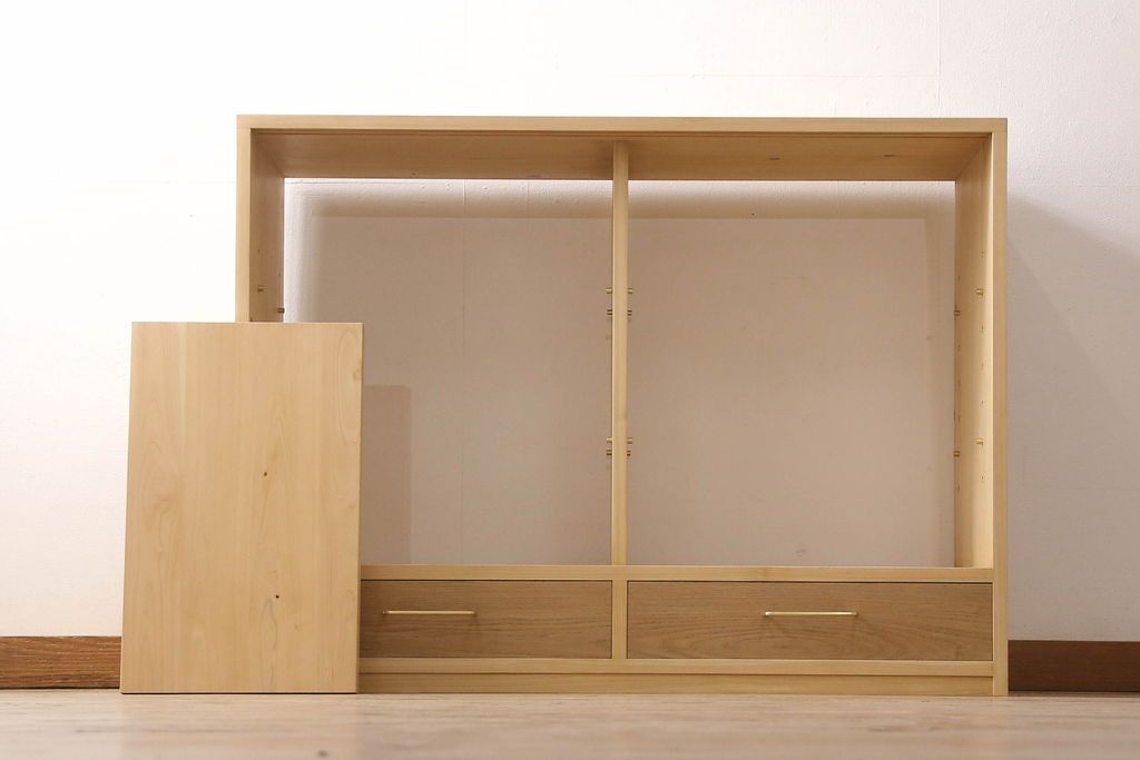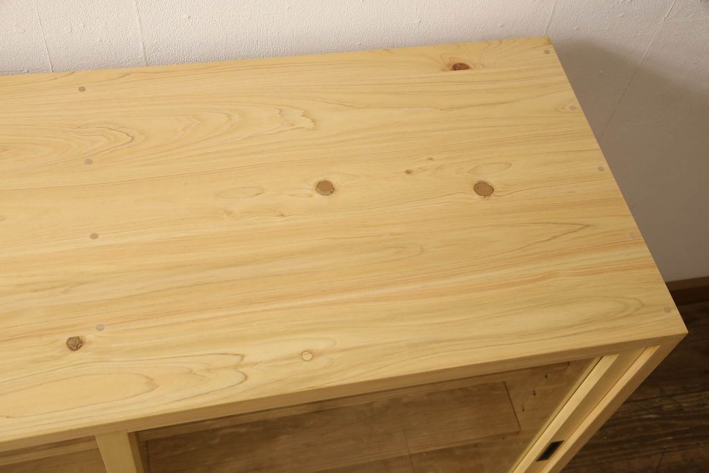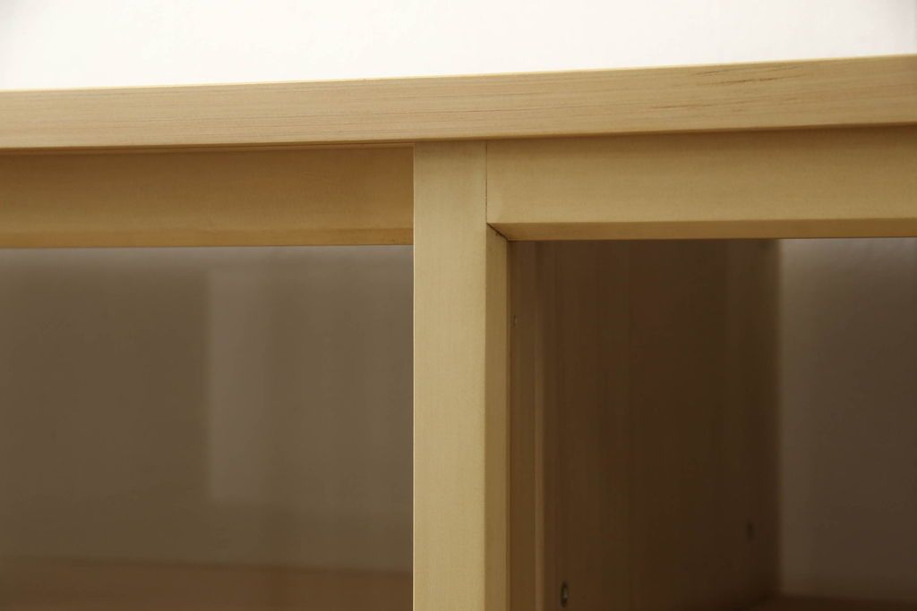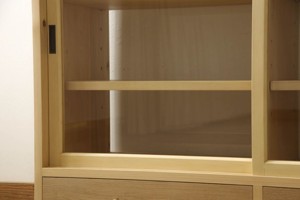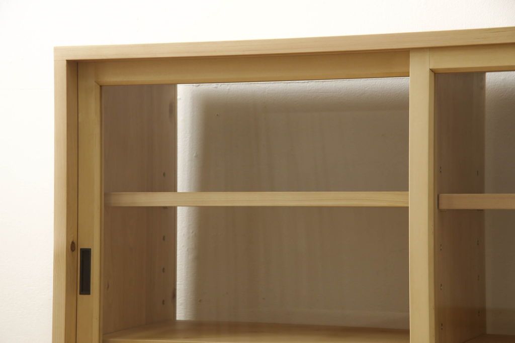 キャビネット・戸棚> 食器棚・カップボード > 戸棚を新規製作!当店商品を参考にご希望サイズで。棚板2枚、下段引き出し2杯仕様にて製作。持ち込みの金具を取付け、引き戸は十字に入っている支柱をなしにして木枠のみ。背面はクリアガラス仕様。全体はワックス、 天板は耐水性を上げるためウレタン塗料を使用して仕上げ。(収納棚、戸棚、キャビネット、サイドボード、食器棚)