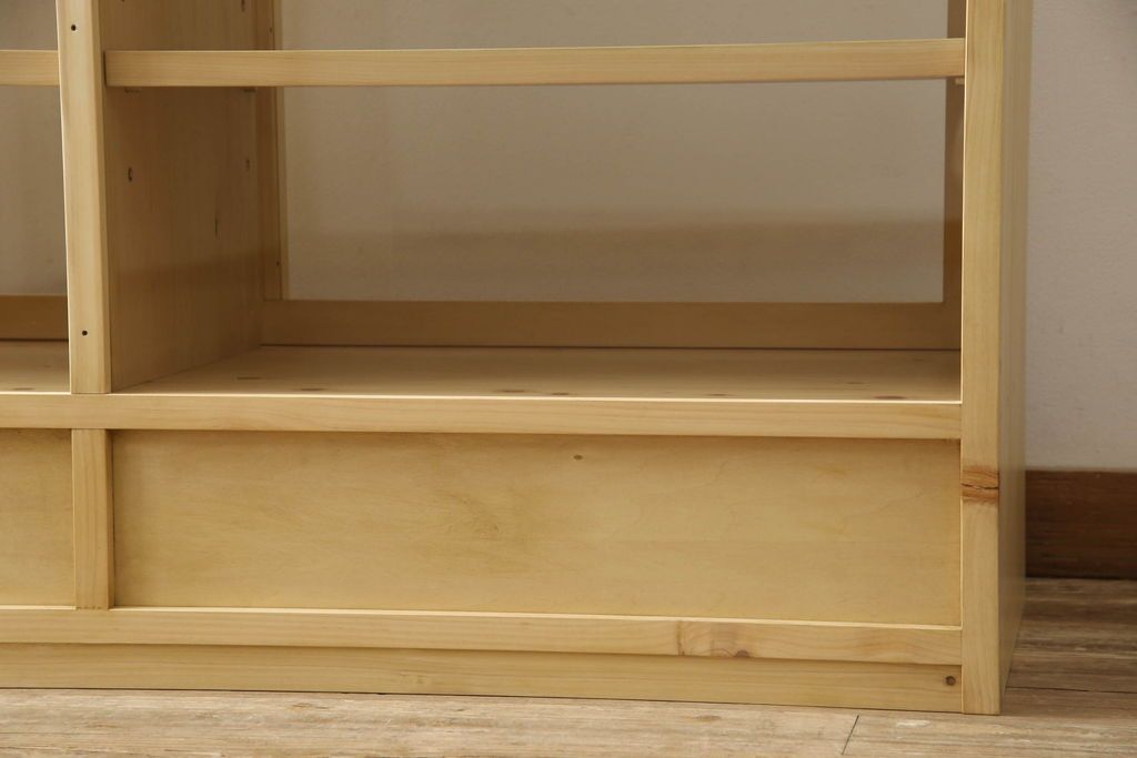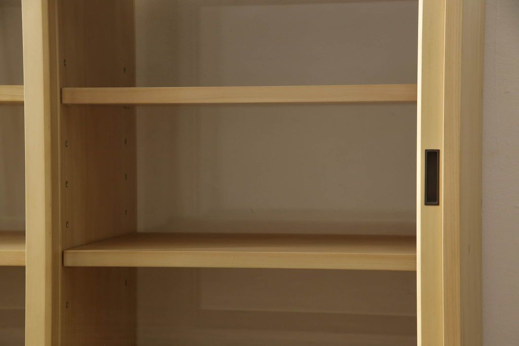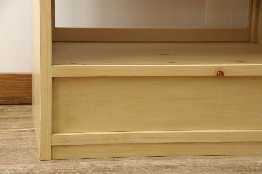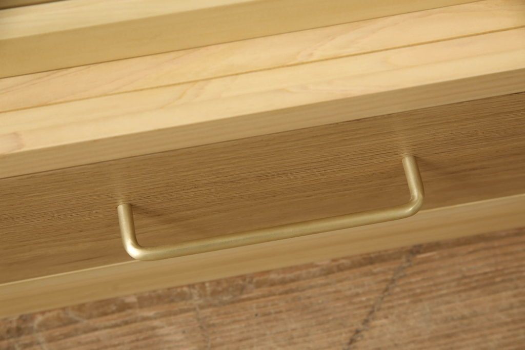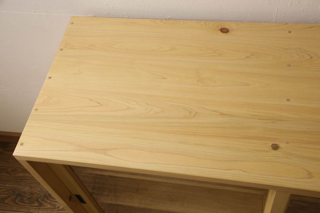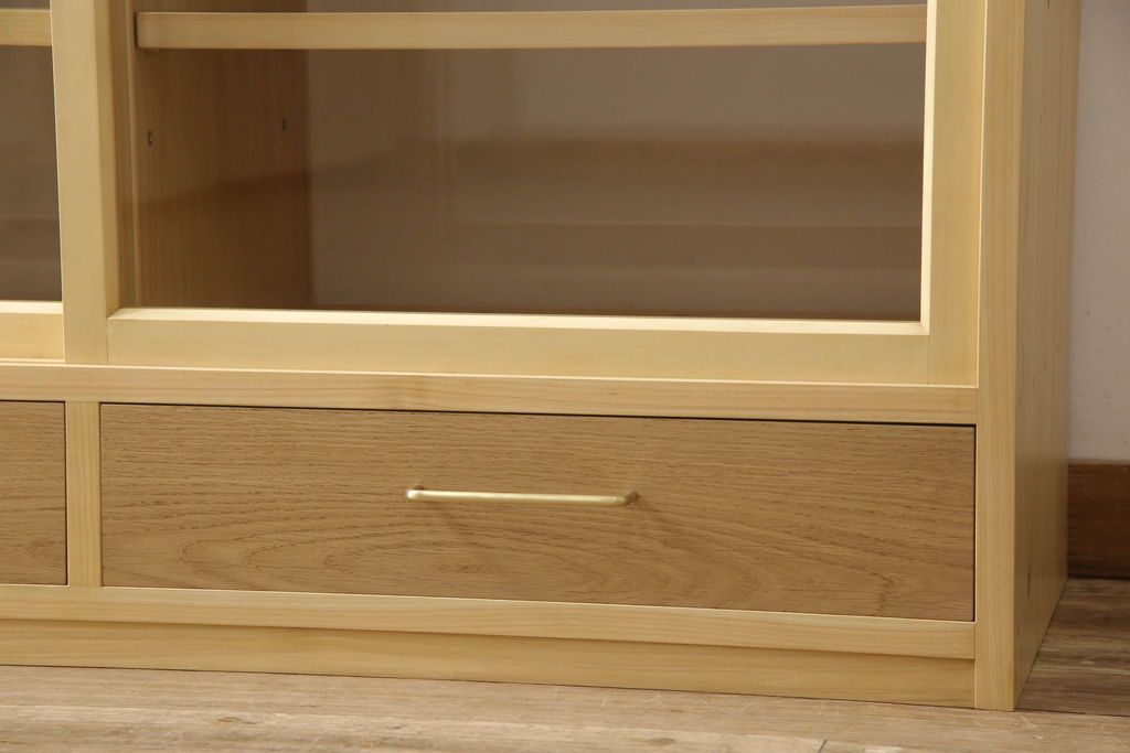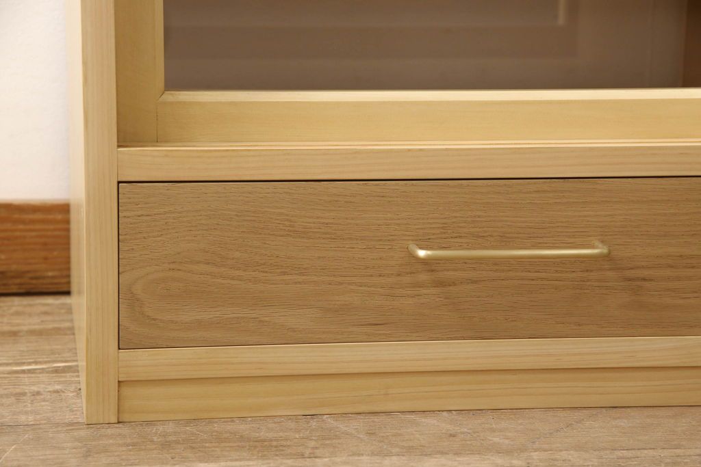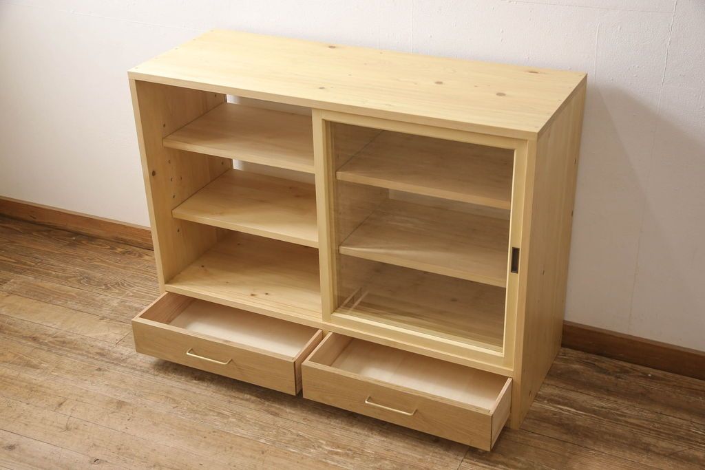 キャビネット・戸棚> サイドキャビネット > 戸棚を新規製作!当店商品を参考にご希望サイズで。棚板2枚、下段引き出し2杯仕様にて製作。持ち込みの金具を取付け、引き戸は十字に入っている支柱をなしにして木枠のみ。背面はクリアガラス仕様。全体はワックス、 天板は耐水性を上げるためウレタン塗料を使用して仕上げ。(収納棚、戸棚、キャビネット、サイドボード、食器棚)