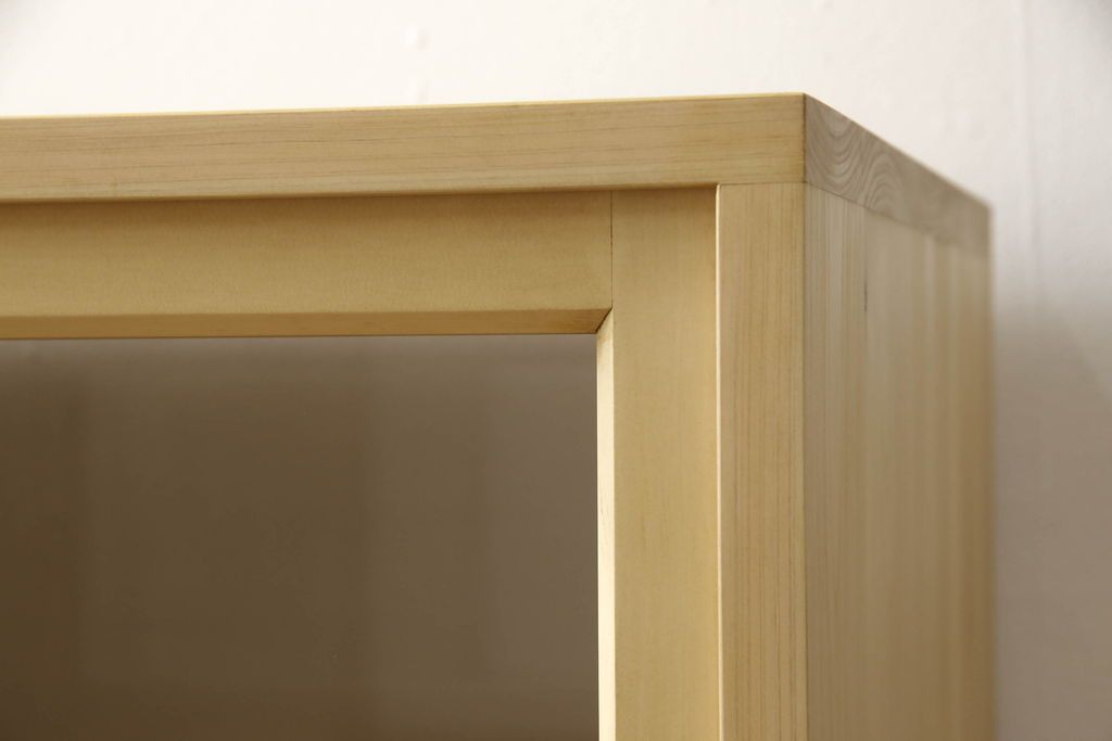 フルオーダー家具実績 > 戸棚を新規製作!当店商品を参考にご希望サイズで。棚板2枚、下段引き出し2杯仕様にて製作。持ち込みの金具を取付け、引き戸は十字に入っている支柱をなしにして木枠のみ。背面はクリアガラス仕様。全体はワックス、 天板は耐水性を上げるためウレタン塗料を使用して仕上げ。(収納棚、戸棚、キャビネット、サイドボード、食器棚)