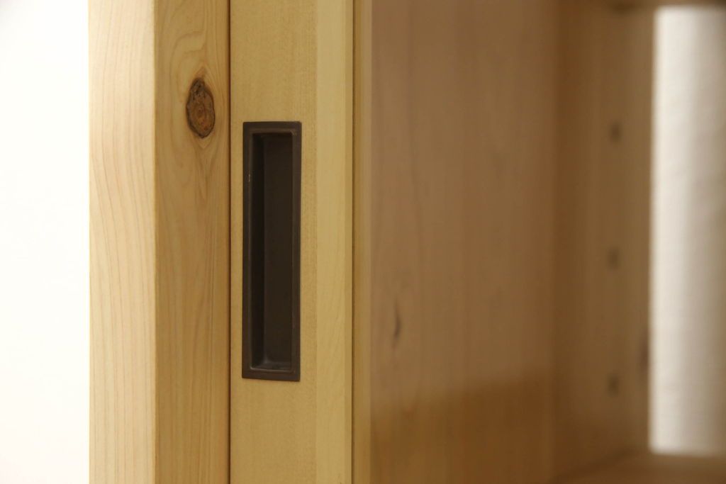 戸棚を新規製作!当店商品を参考にご希望サイズで。棚板2枚、下段引き出し2杯仕様にて製作。持ち込みの金具を取付け、引き戸は十字に入っている支柱をなしにして木枠のみ。背面はクリアガラス仕様。全体はワックス、 天板は耐水性を上げるためウレタン塗料を使用して仕上げ。(収納棚、戸棚、キャビネット、サイドボード、食器棚)