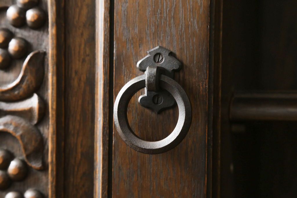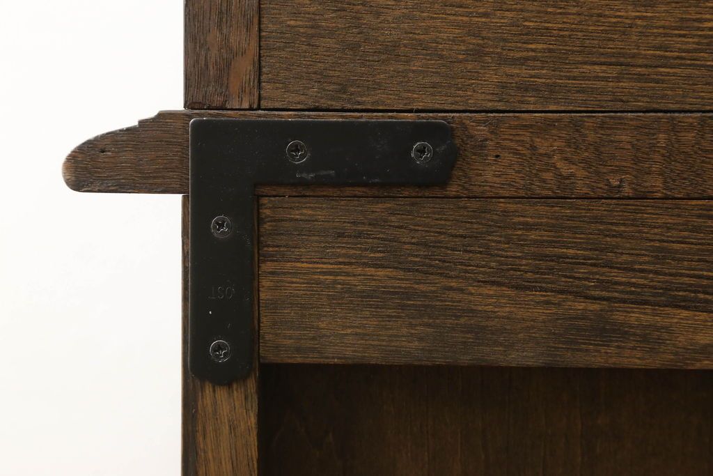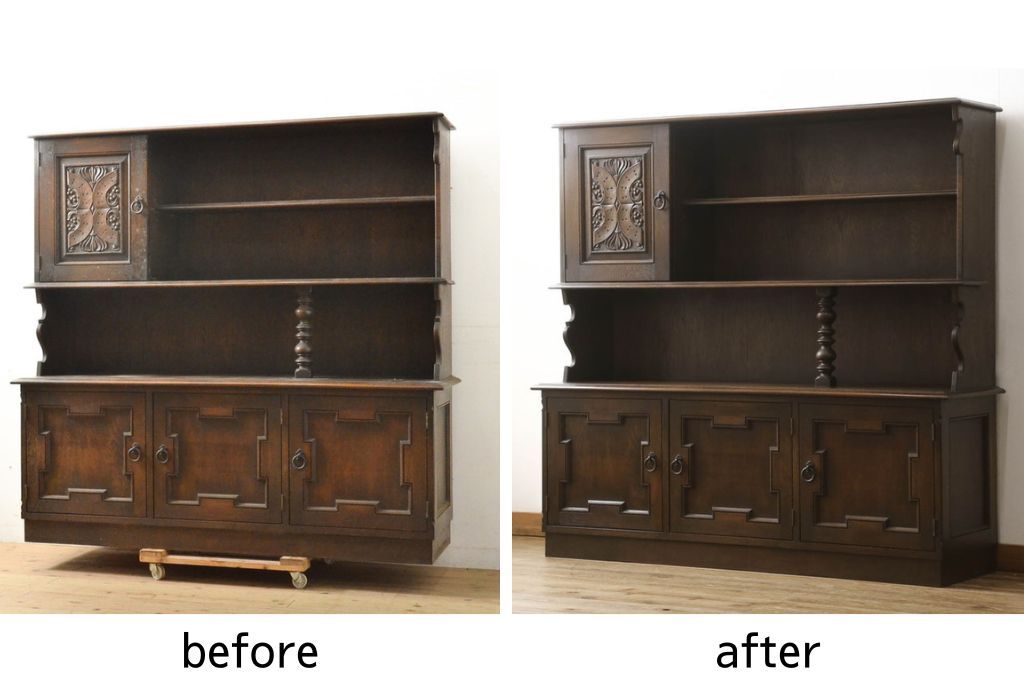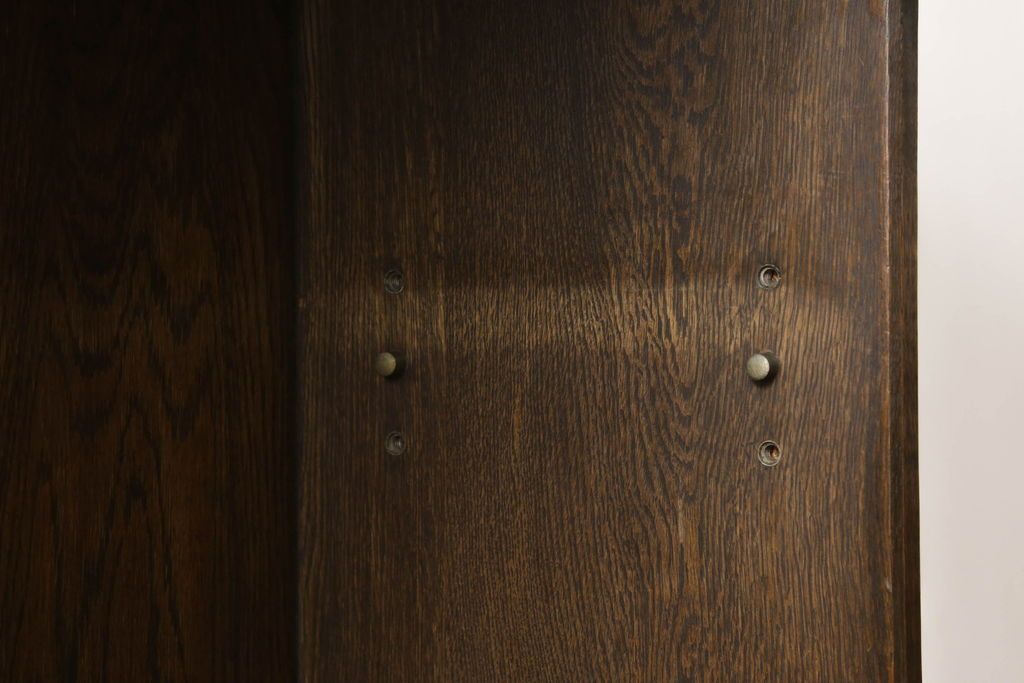 セミオーダー家具実績 > キャビネットをリペア&カスタム!中段右端下に配線用の穴あけ加工。修繕箇所は本体と馴染ませ、現状のお品物に合わせて1トーン程落ち着いた色に着色。(食器棚、カップボード、収納棚、飾り棚、ヴィンテージ)