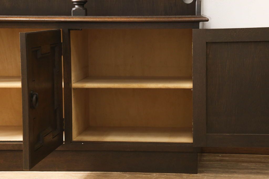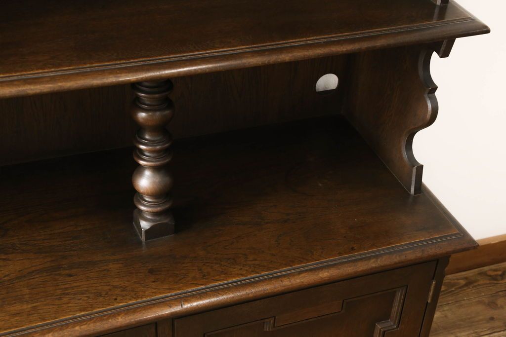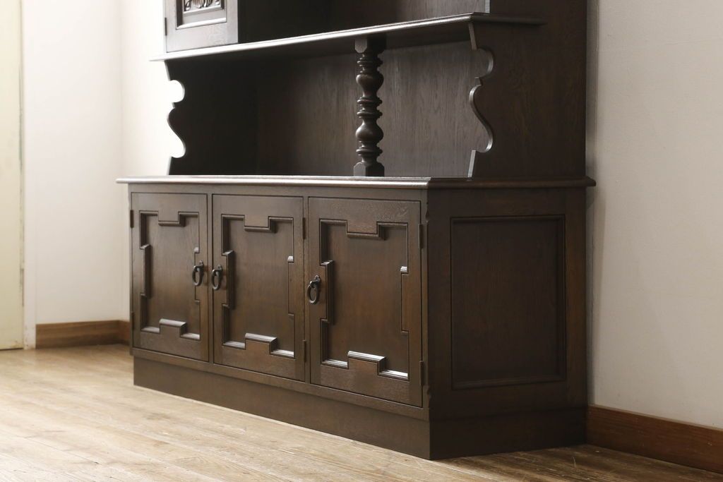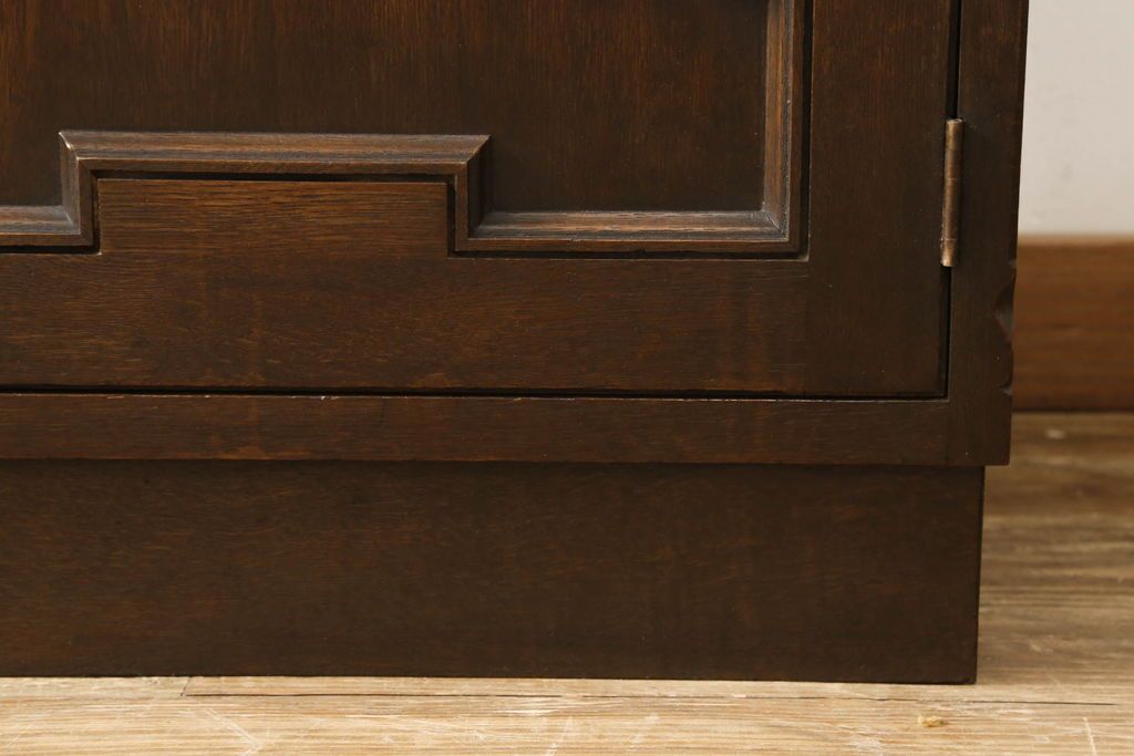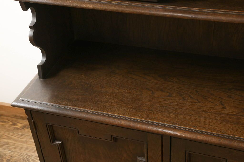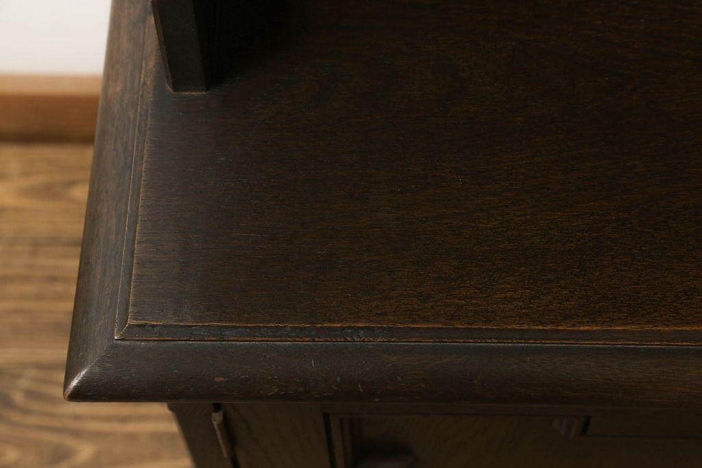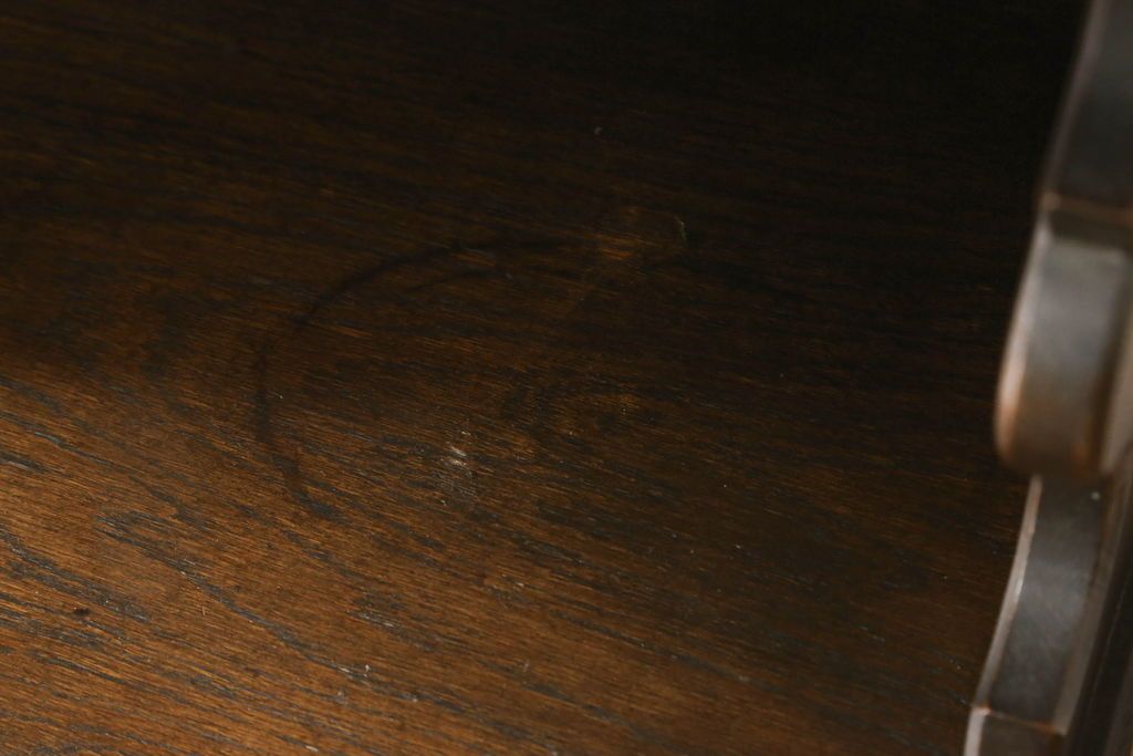 キャビネット・戸棚> 食器棚・カップボード > キャビネットをリペア&カスタム!中段右端下に配線用の穴あけ加工。修繕箇所は本体と馴染ませ、現状のお品物に合わせて1トーン程落ち着いた色に着色。(食器棚、カップボード、収納棚、飾り棚、ヴィンテージ)