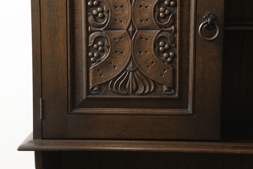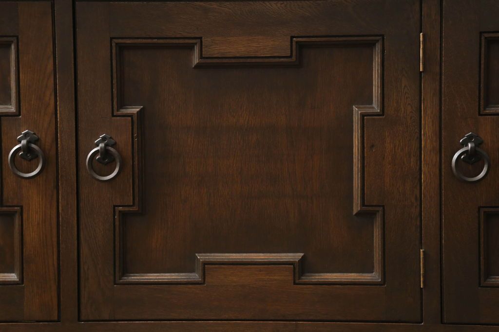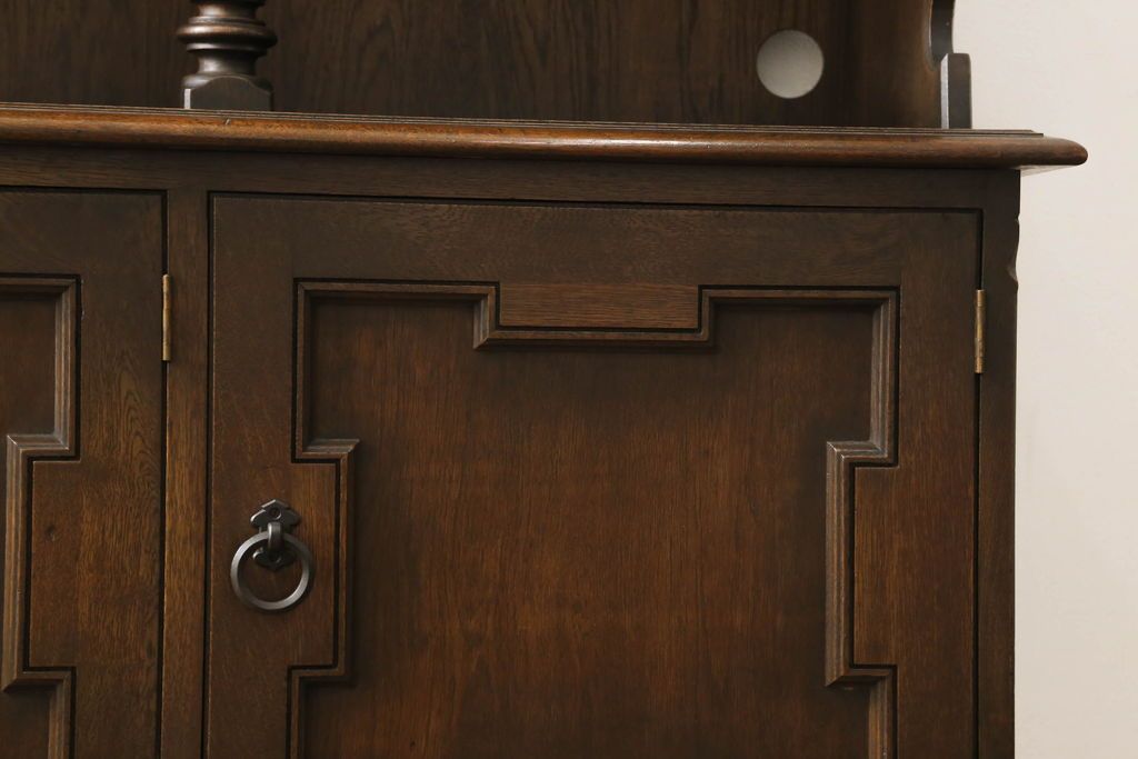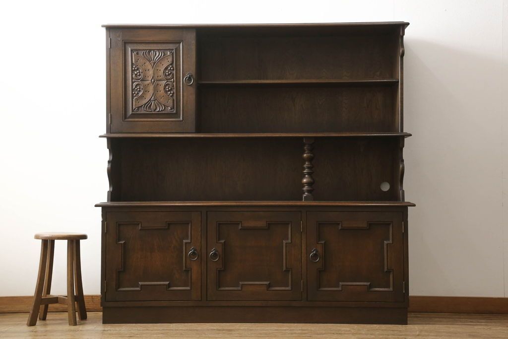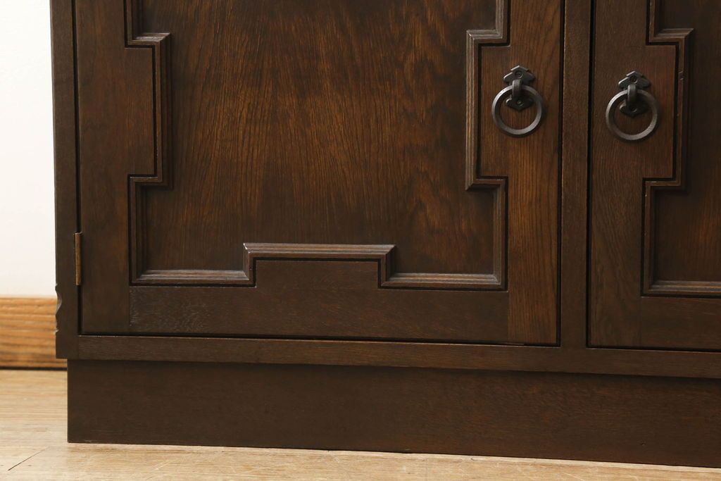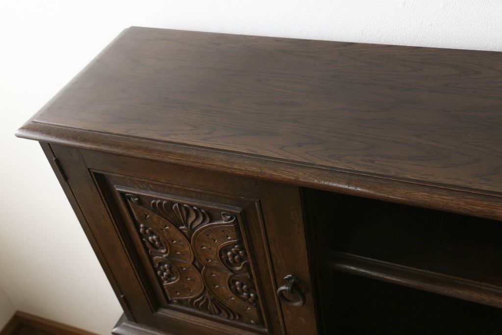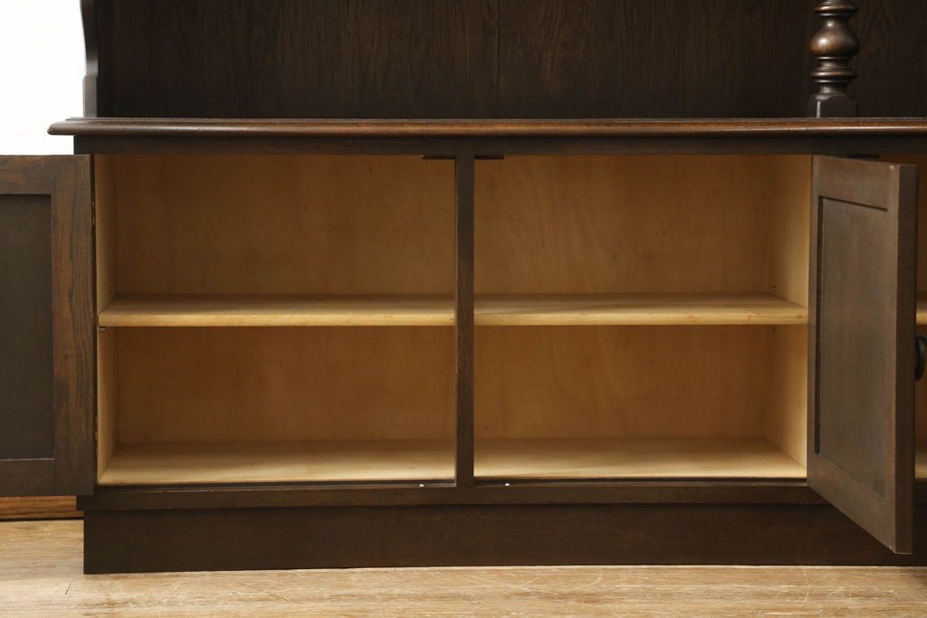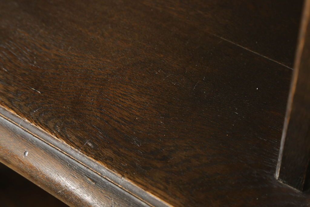 キャビネット・戸棚> 食器棚・カップボード > キャビネットをリペア&カスタム!中段右端下に配線用の穴あけ加工。修繕箇所は本体と馴染ませ、現状のお品物に合わせて1トーン程落ち着いた色に着色。(食器棚、カップボード、収納棚、飾り棚、ヴィンテージ)