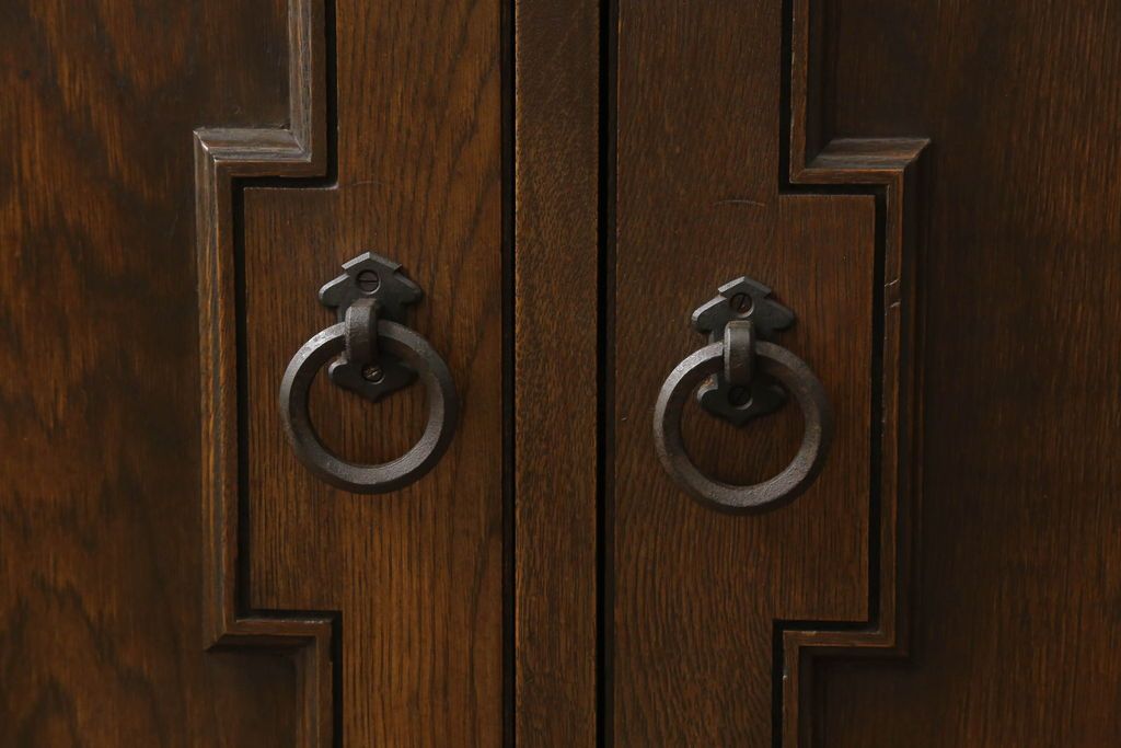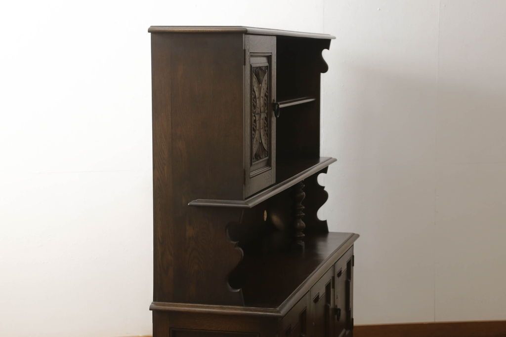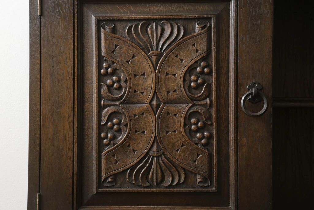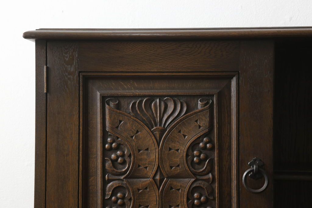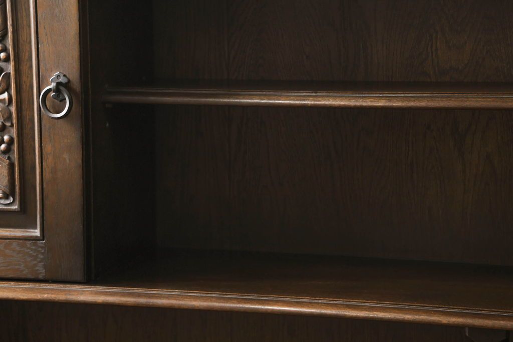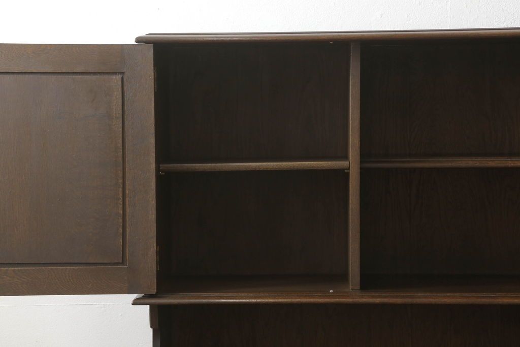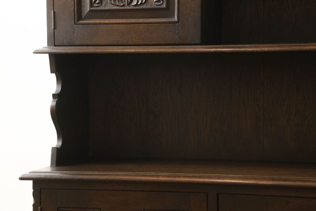 キャビネット・戸棚> 食器棚・カップボード > キャビネットをリペア&カスタム!中段右端下に配線用の穴あけ加工。修繕箇所は本体と馴染ませ、現状のお品物に合わせて1トーン程落ち着いた色に着色。(食器棚、カップボード、収納棚、飾り棚、ヴィンテージ)