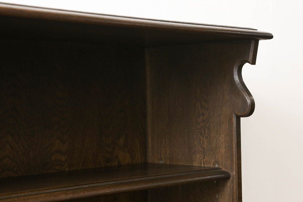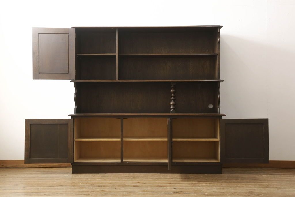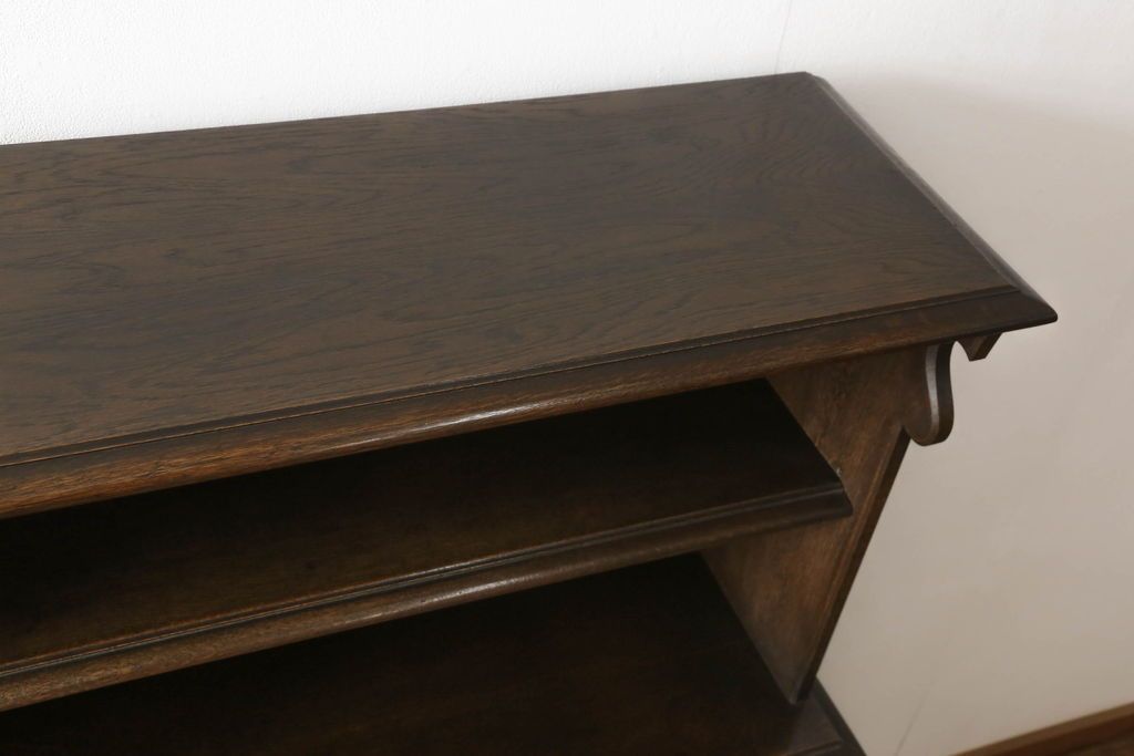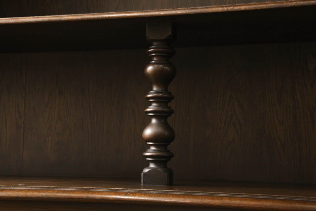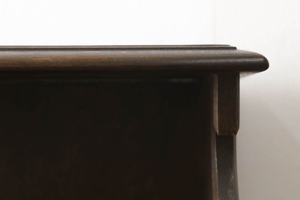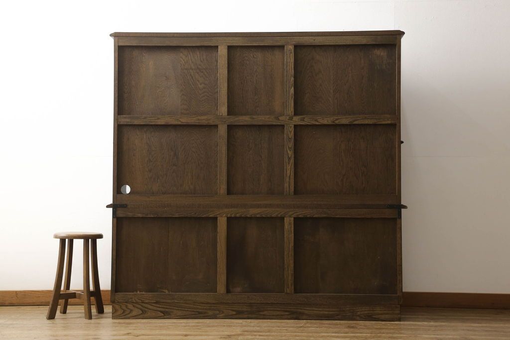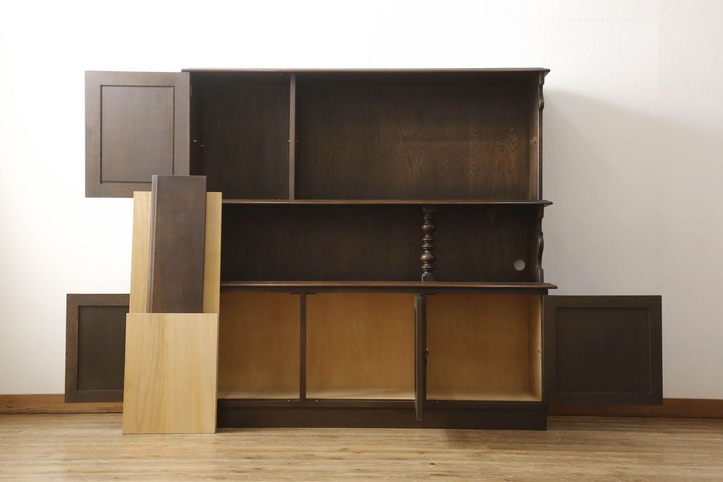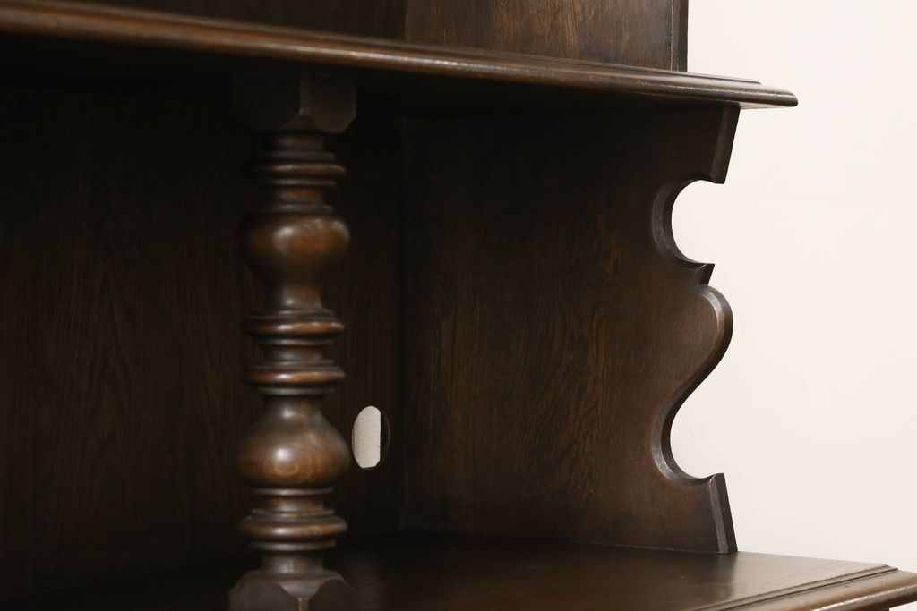 オープンラック・シェルフ> ディスプレイラック > キャビネットをリペア&カスタム!中段右端下に配線用の穴あけ加工。修繕箇所は本体と馴染ませ、現状のお品物に合わせて1トーン程落ち着いた色に着色。(食器棚、カップボード、収納棚、飾り棚、ヴィンテージ)