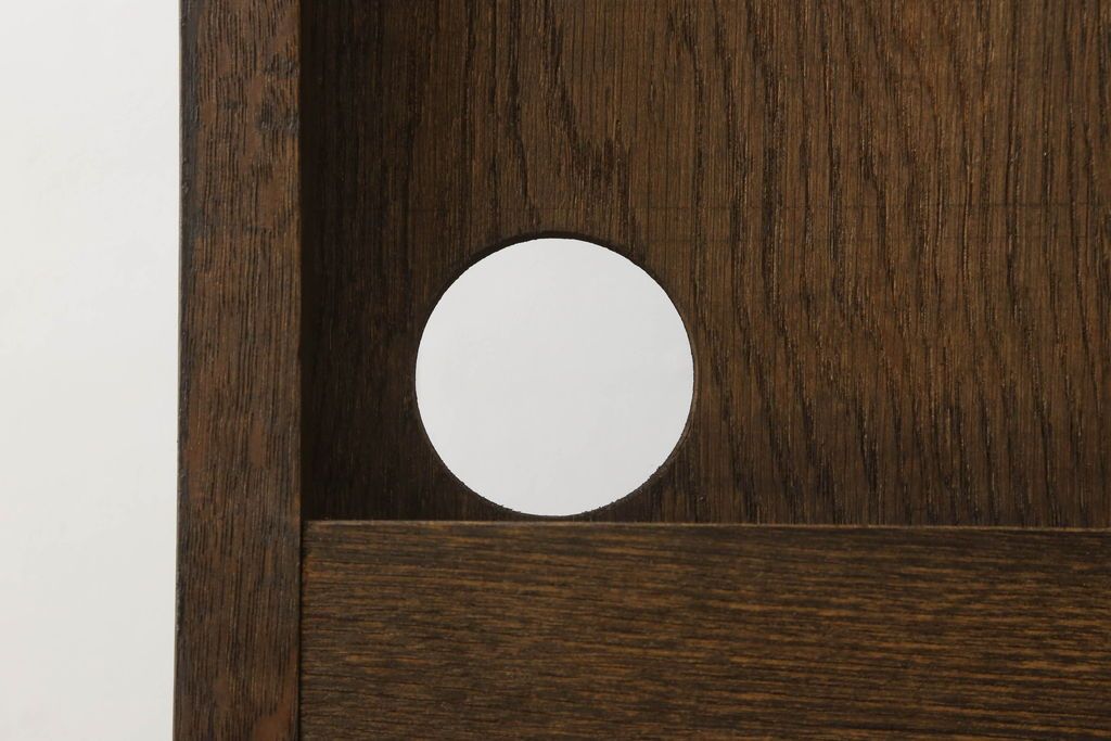 キャビネットをリペア&カスタム!中段右端下に配線用の穴あけ加工。修繕箇所は本体と馴染ませ、現状のお品物に合わせて1トーン程落ち着いた色に着色。(食器棚、カップボード、収納棚、飾り棚、ヴィンテージ)