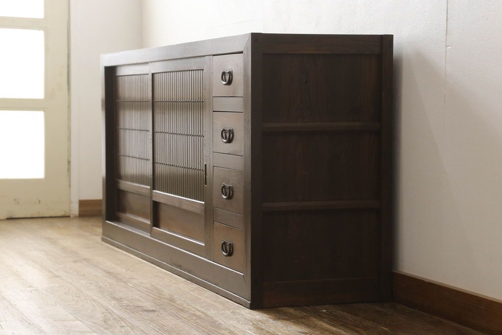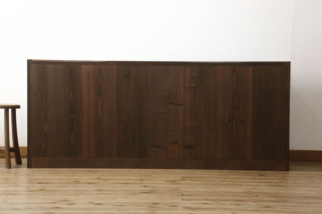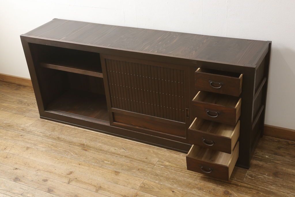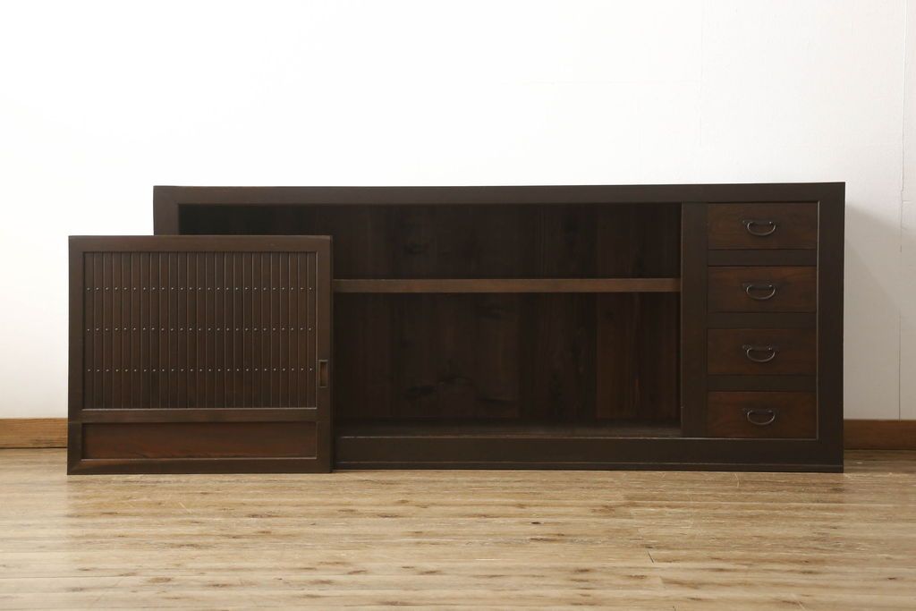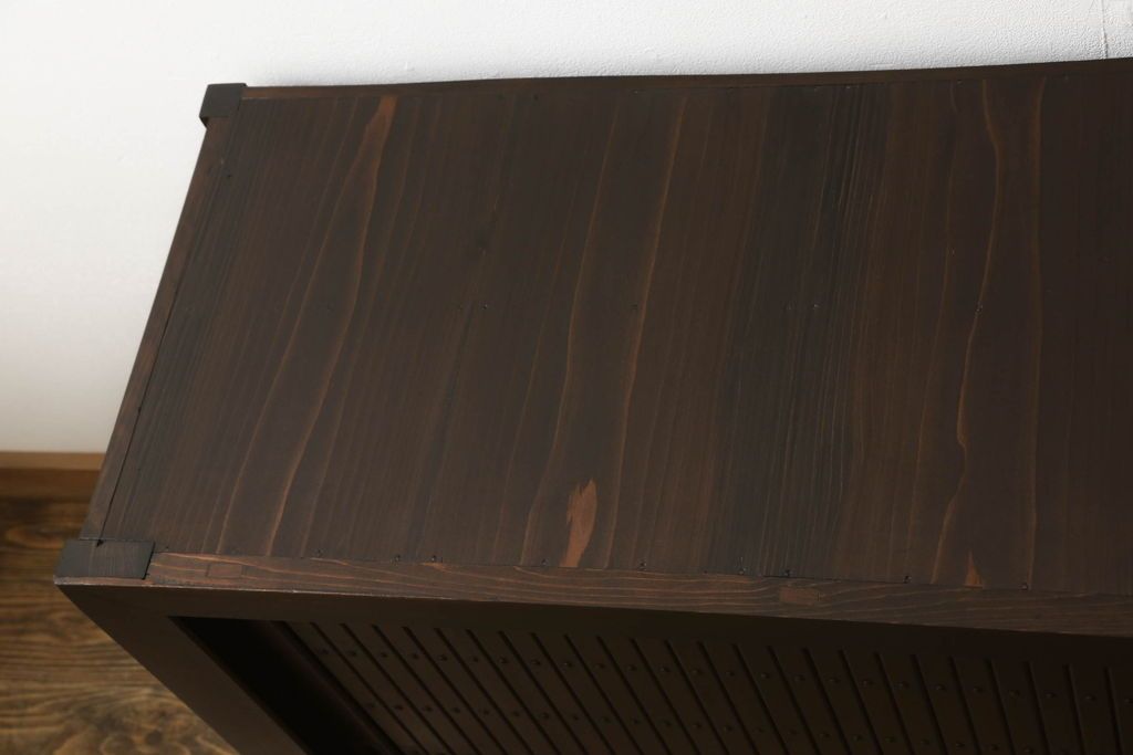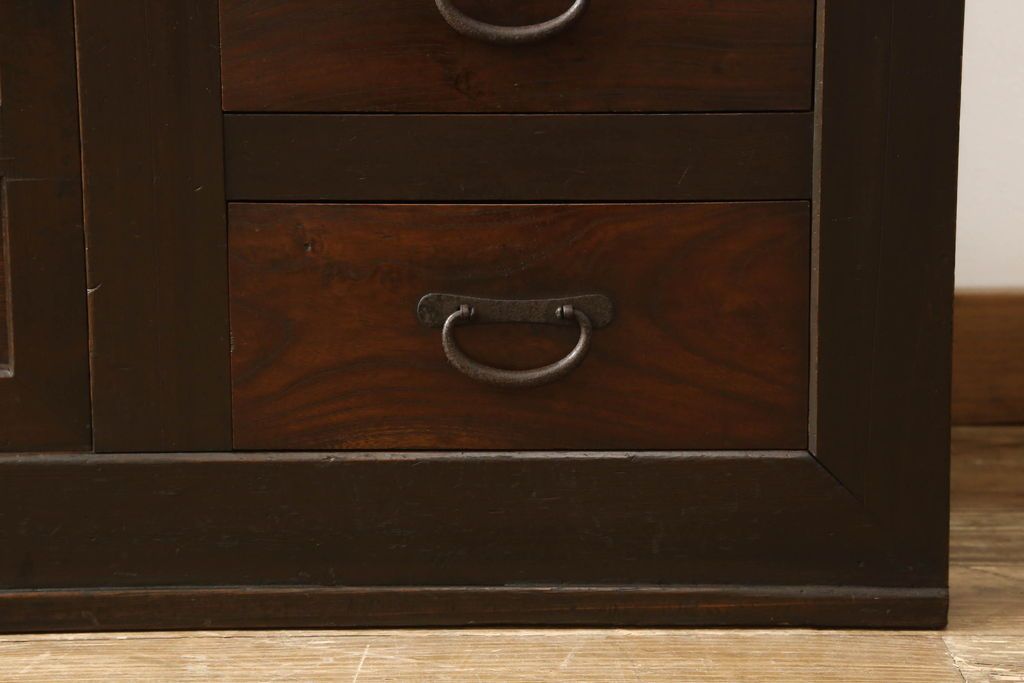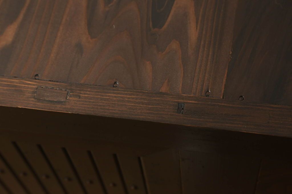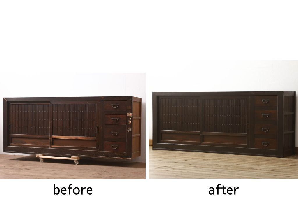 和箪笥> 水屋箪笥 > 近江水屋箪笥テレビ台をリペア&カスタム!奥行をリサイズし、既存の棚板は取り外しできる仕様に加工。修繕箇所は本体と馴染ませ、現状のお品物に合わせて1トーン程落ち着いた色に着色。(キャビネット、戸棚)