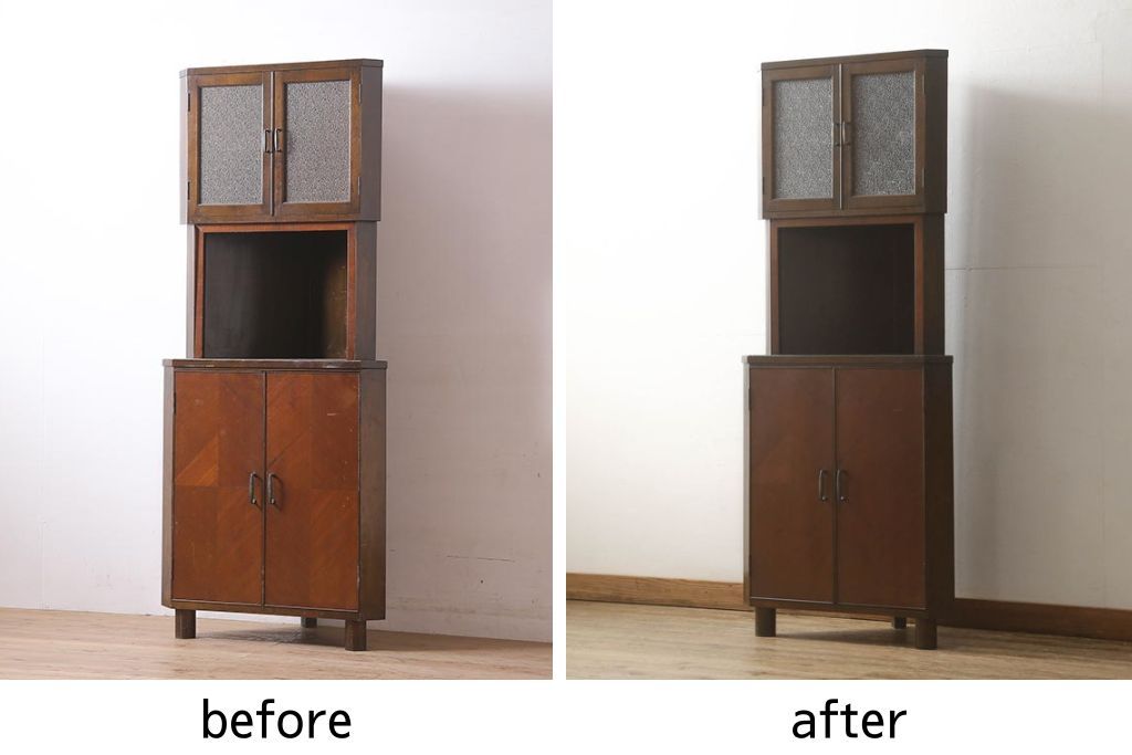 コーナーキャビネットの見た目を変えずに綺麗にリペア!修繕箇所は本体と馴染ませ、現状の品物に合わせて1トーン程落ち着いた色に着色。(コーナーシェルフ、戸棚、収納棚)