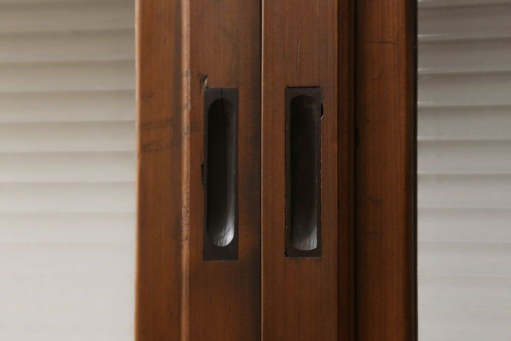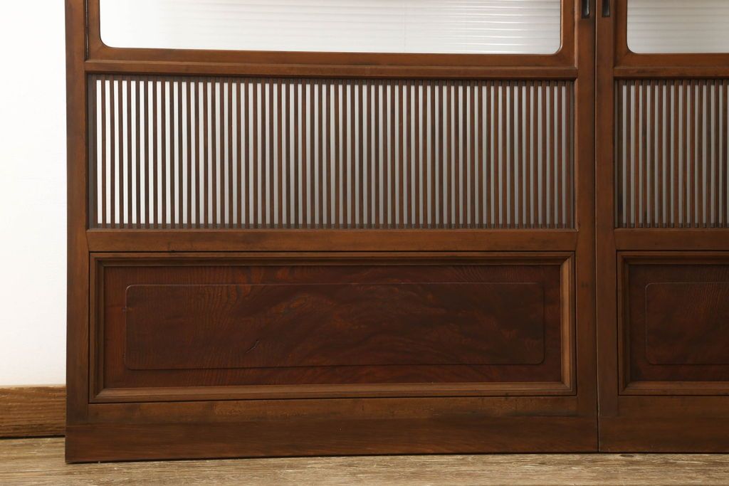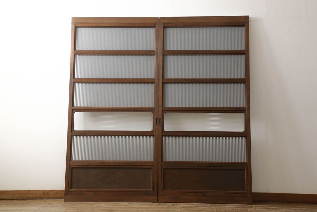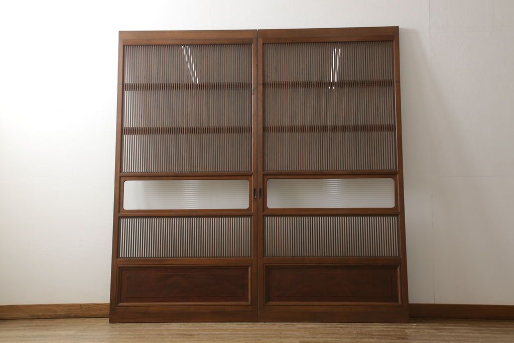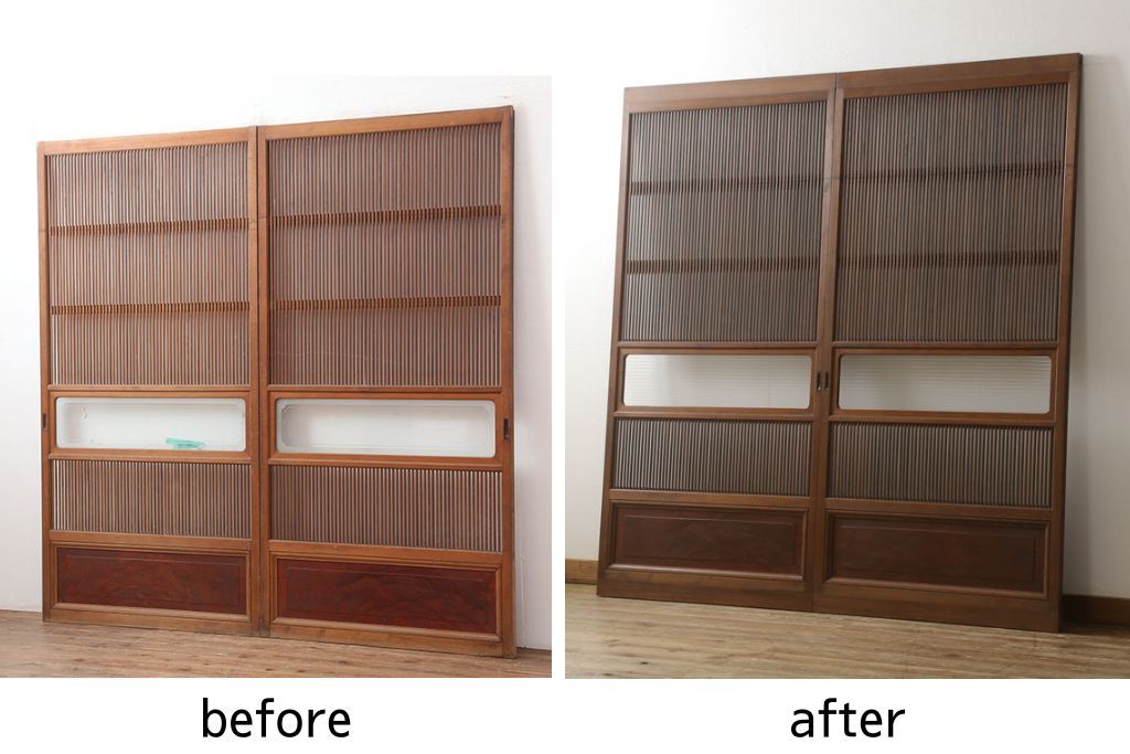 ドア・建具> 引き戸 > 格子戸2枚をリペア&カスタム!高さをリサイズし、木瓜ガラスからモールガラス、格子裏はすりガラスへ変更。上吊り式仕様に加工し、本体は現状の色味を活かして仕上げ。(建具、引き戸)