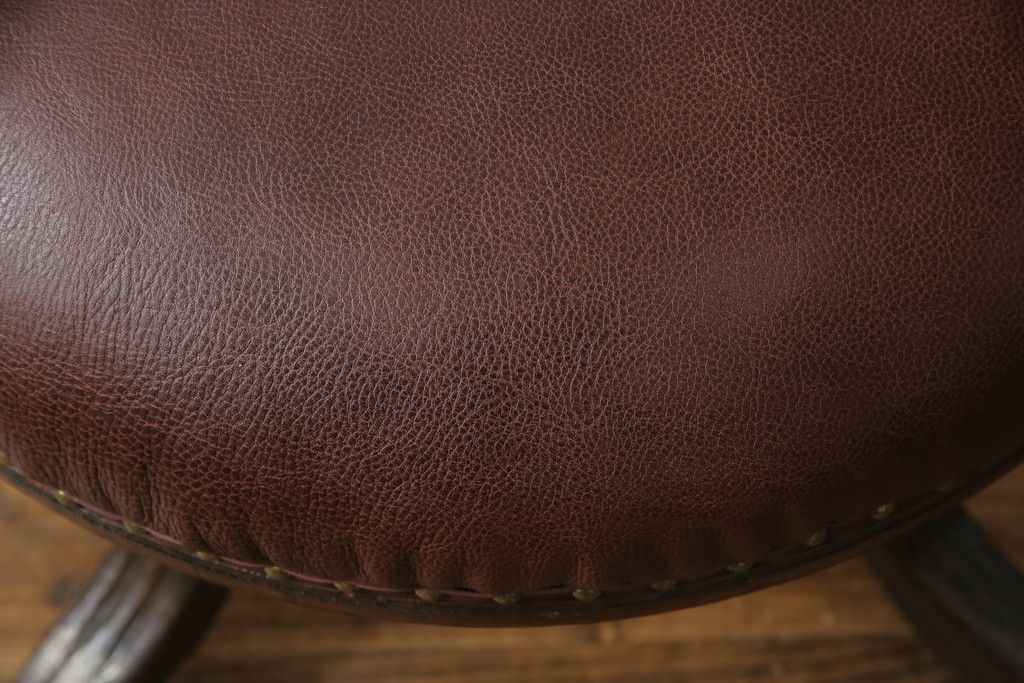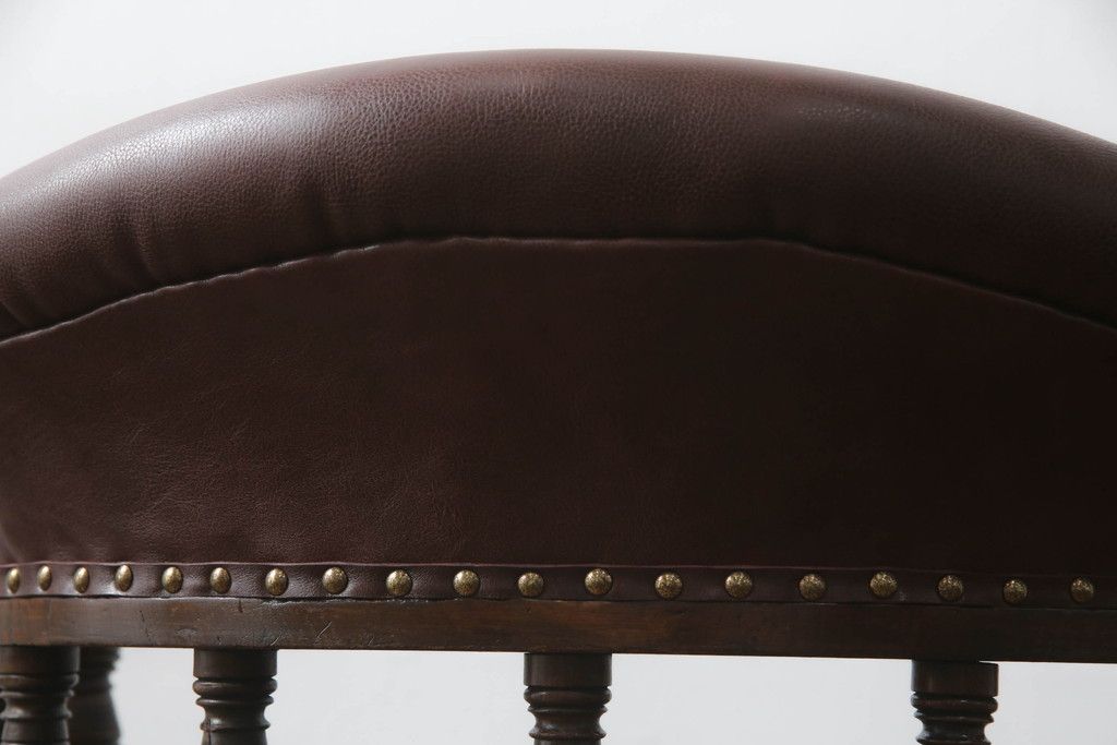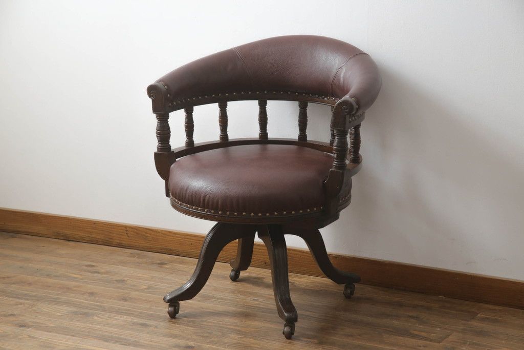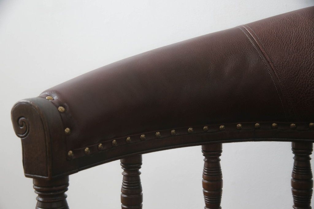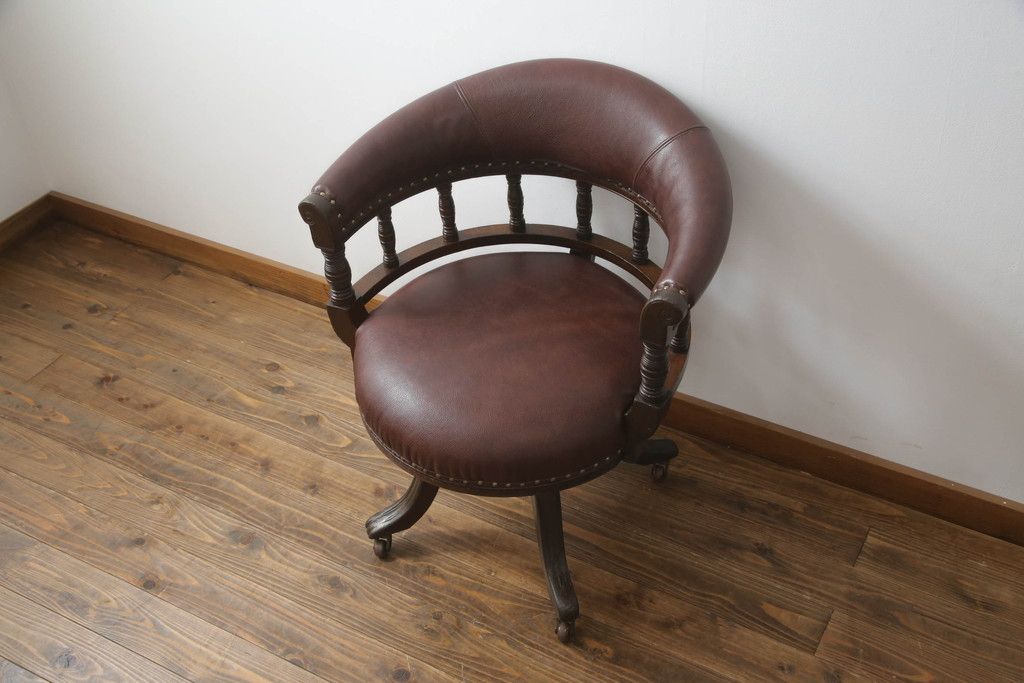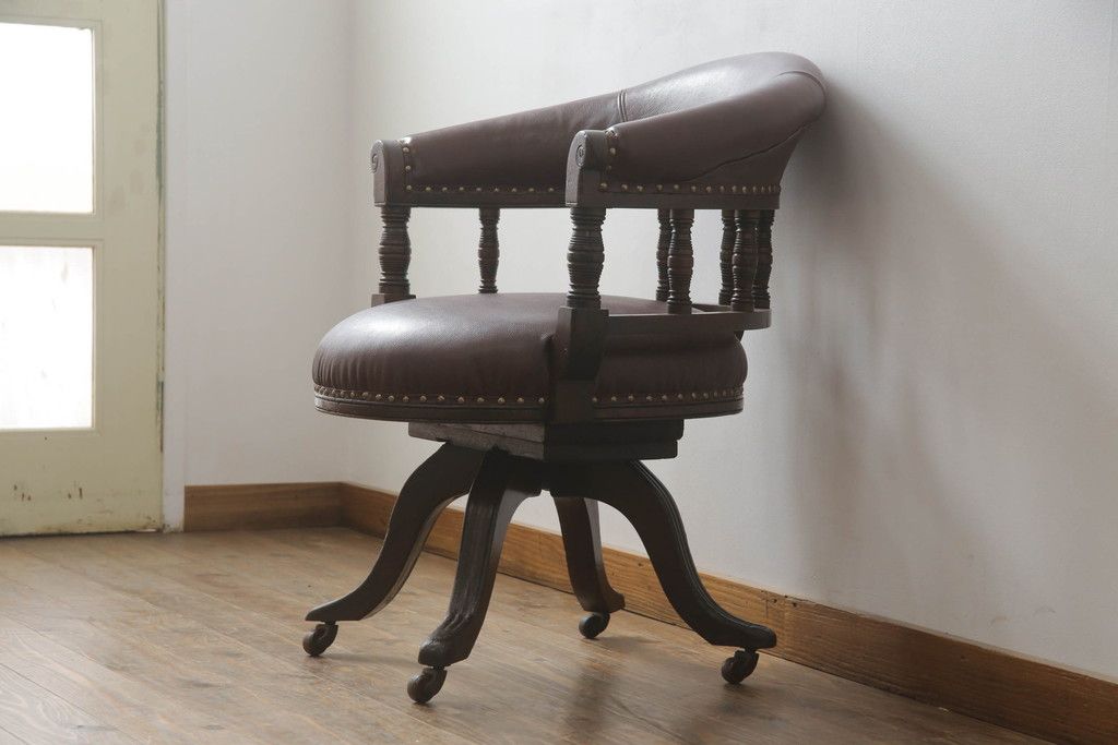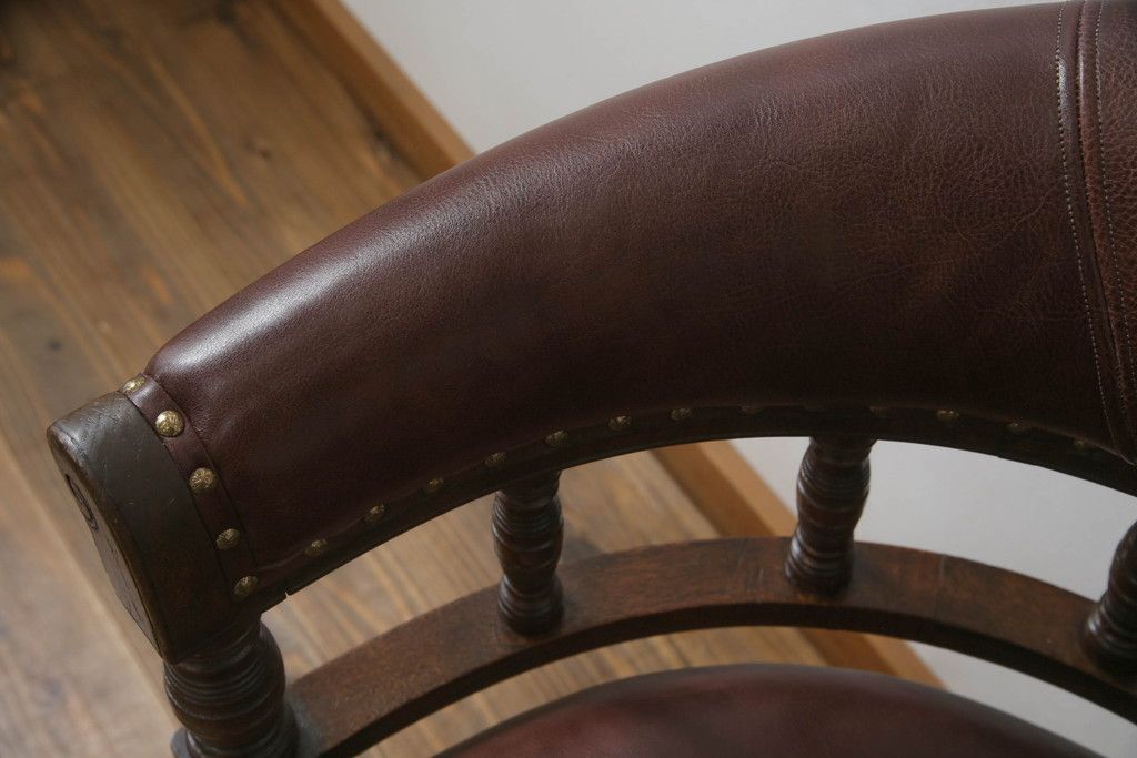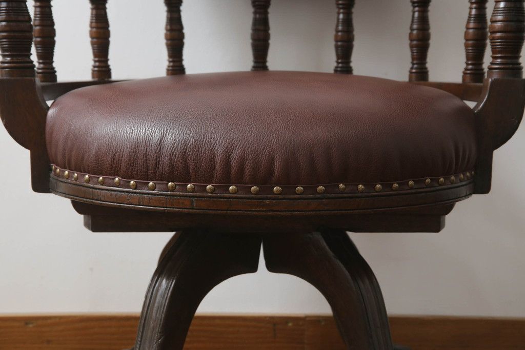 椅子・ベンチ> 				アームチェア				> キャスター付きチェアをリペア&カスタム!座面と背面を指定の本革に張り変え、硬さを調整。木部は1トーン落ち着いた色味に着色仕上げ。