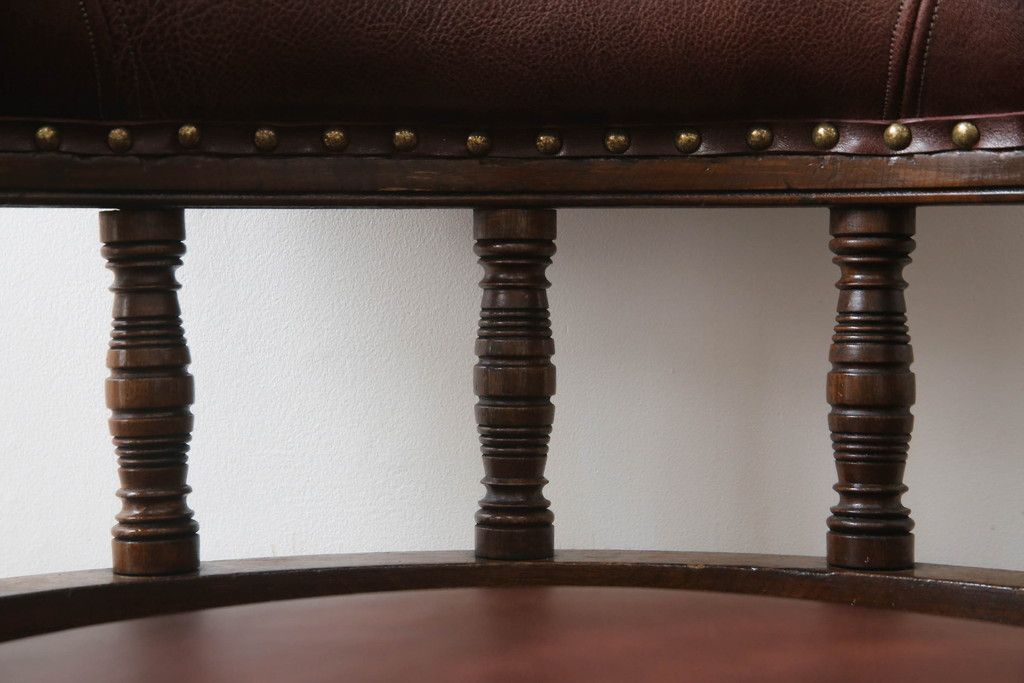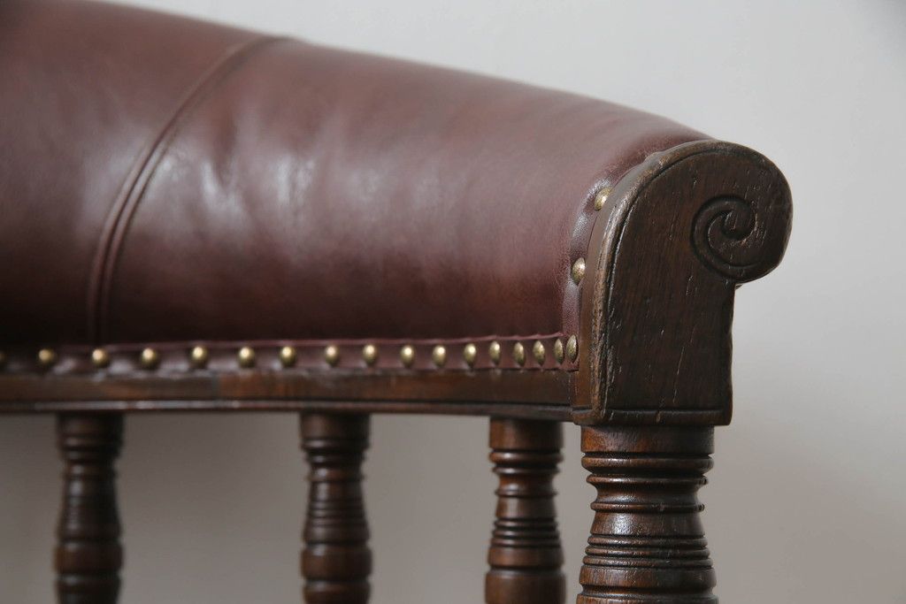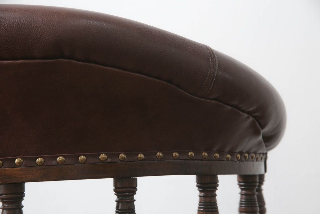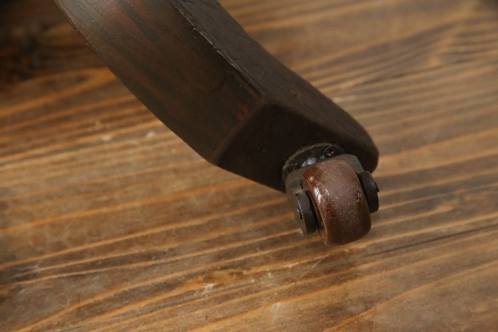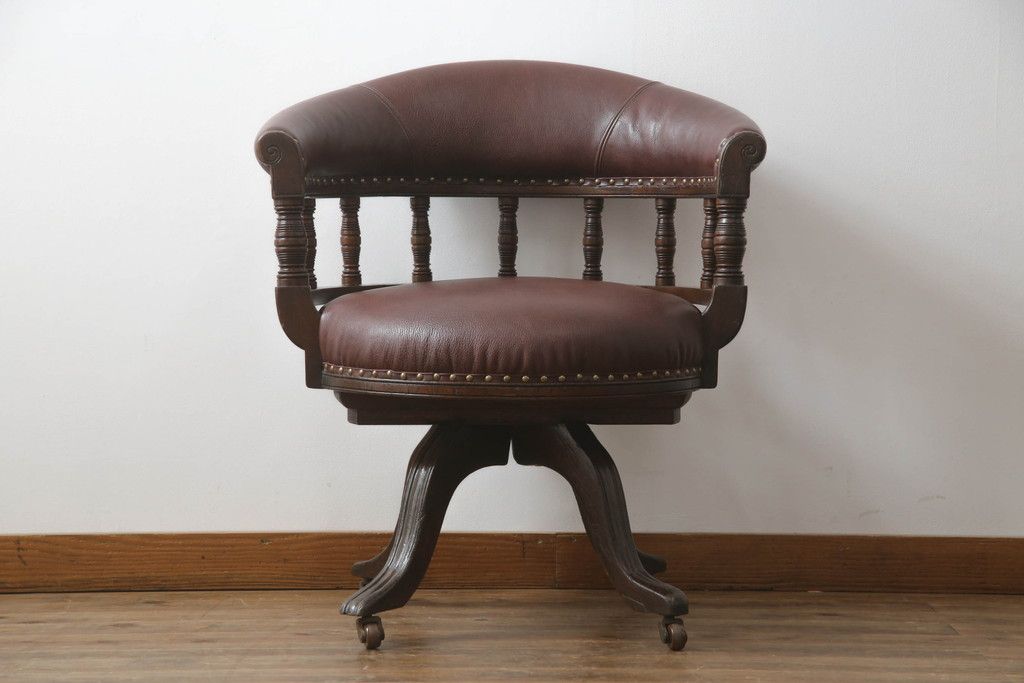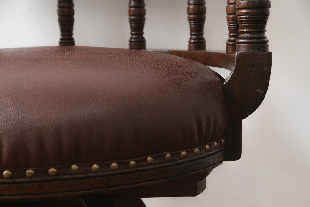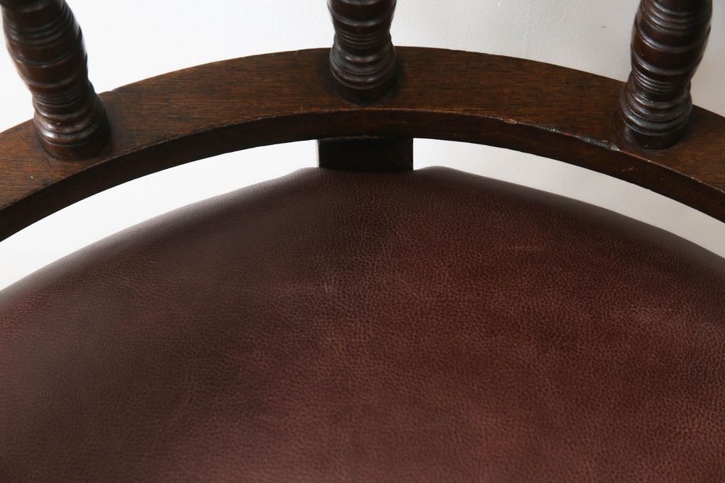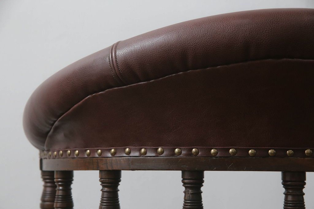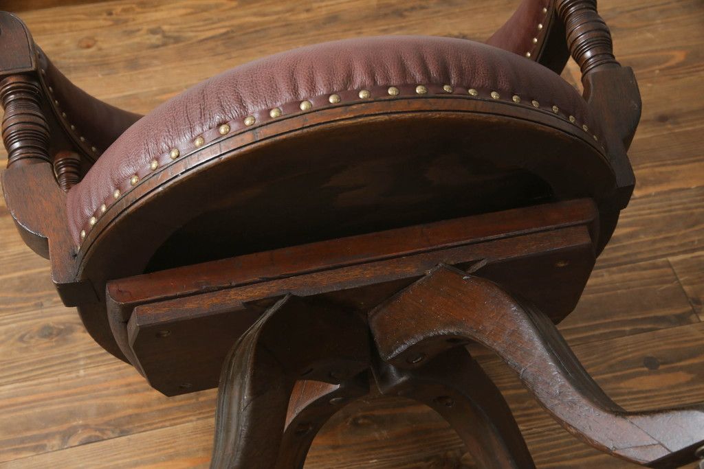 椅子・ベンチ> 				アームチェア				> キャスター付きチェアをリペア&カスタム!座面と背面を指定の本革に張り変え、硬さを調整。木部は1トーン落ち着いた色味に着色仕上げ。