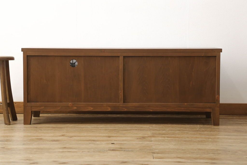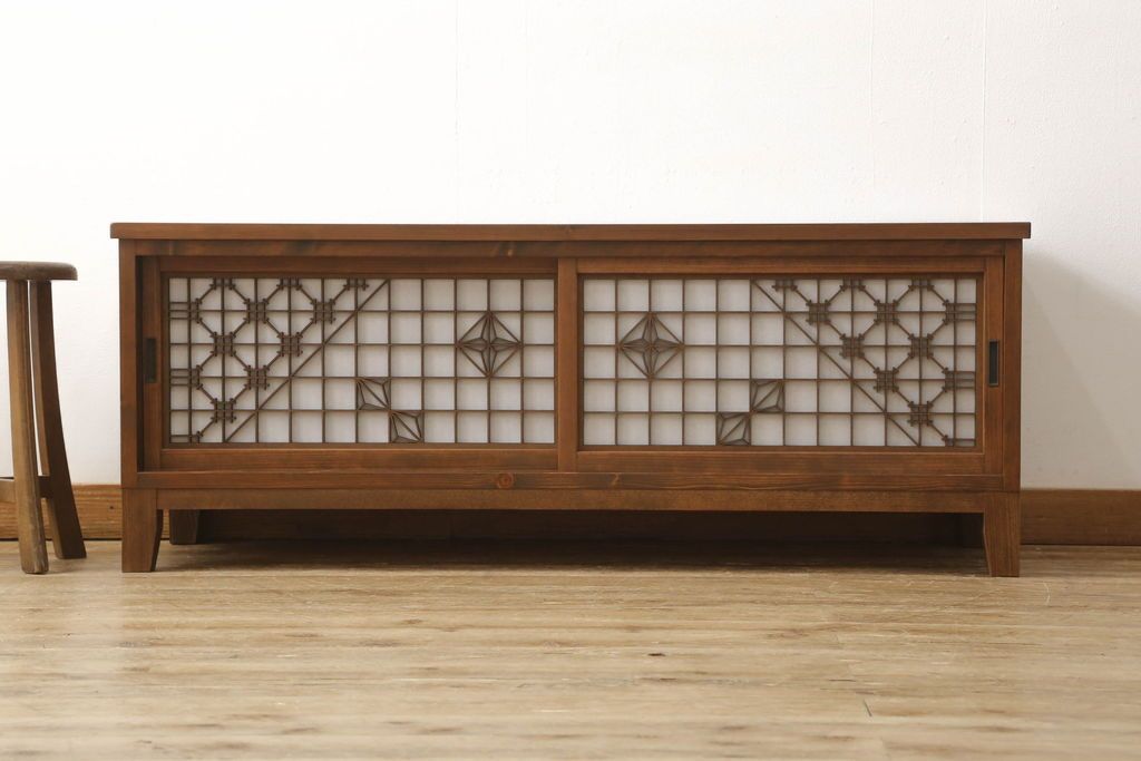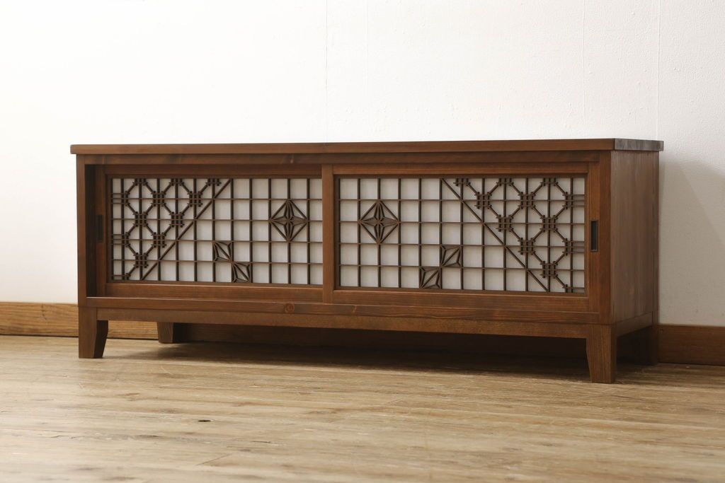 ローボードを新規製作!ラフジュ工房オリジナル商品のデザイン・色味を参考に製作。引き戸には組子をはめ込み、厚さ24mmの天板を取り付け、収納内部中央に仕切り、木製脚を取り付け。内部に配線用の穴開け加工。(テレビボード、テレビ台、サイドボード、収納棚、戸棚)