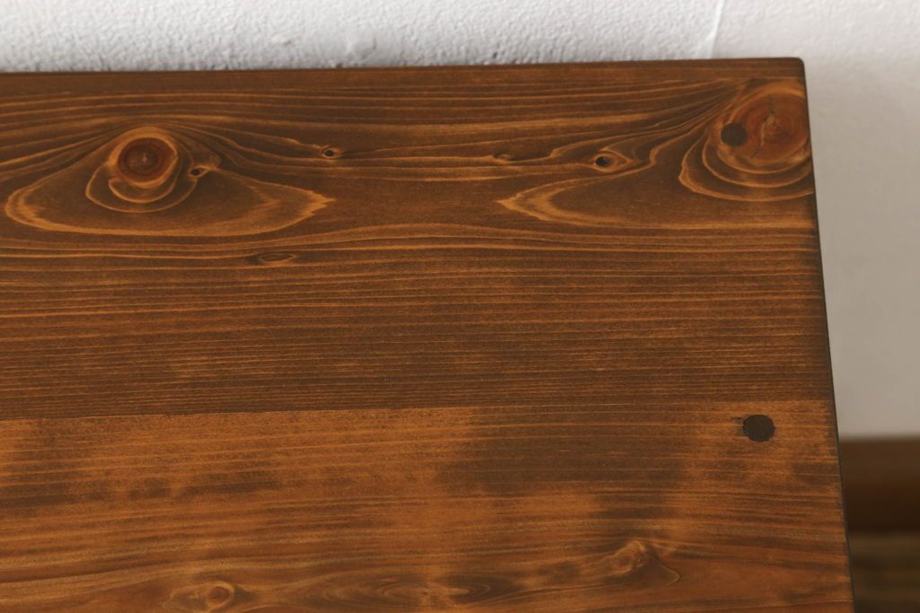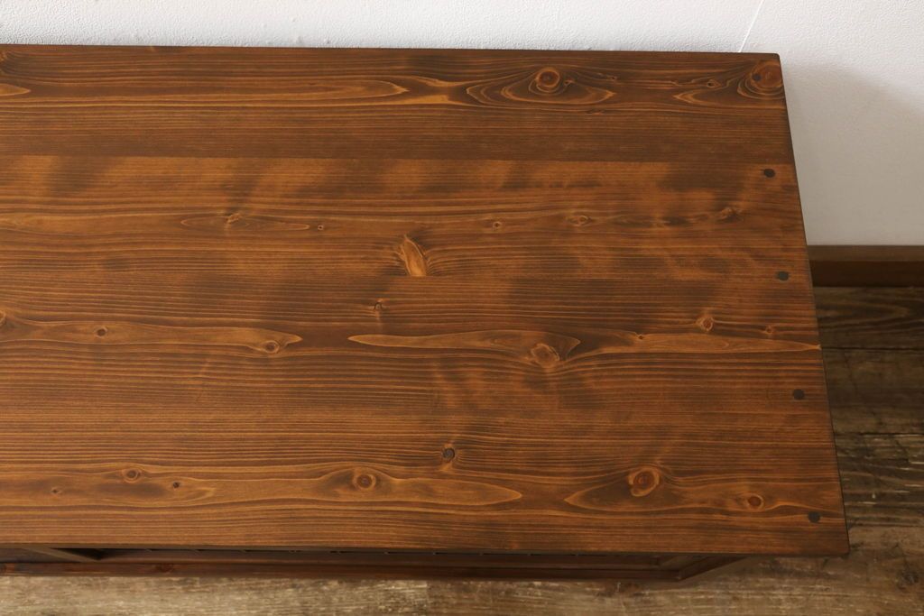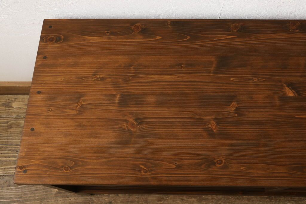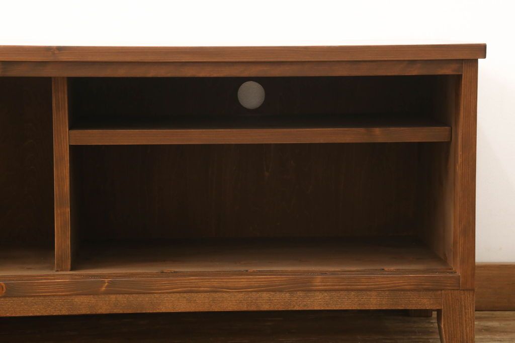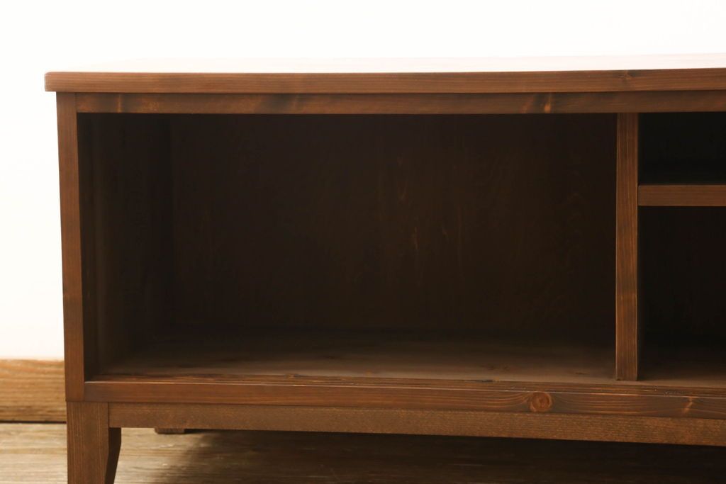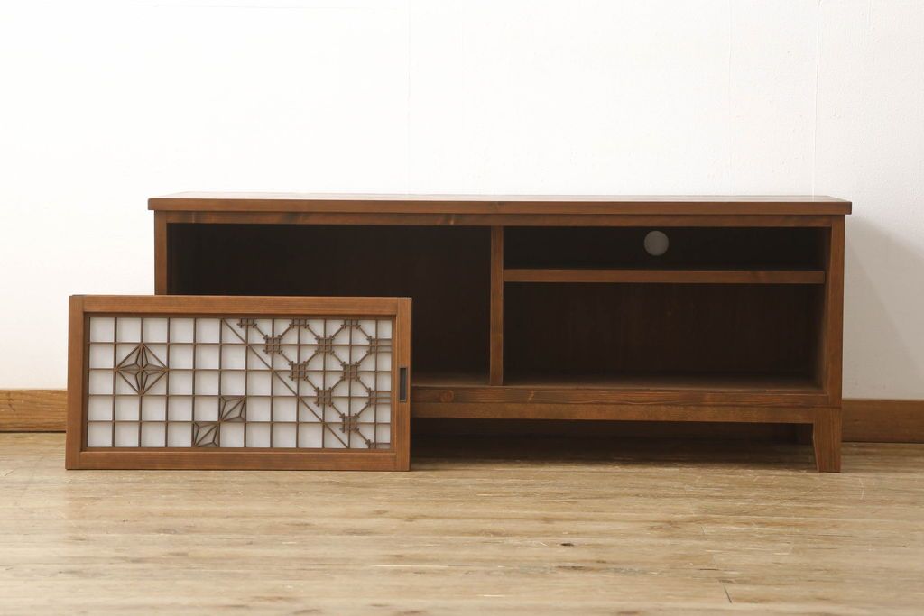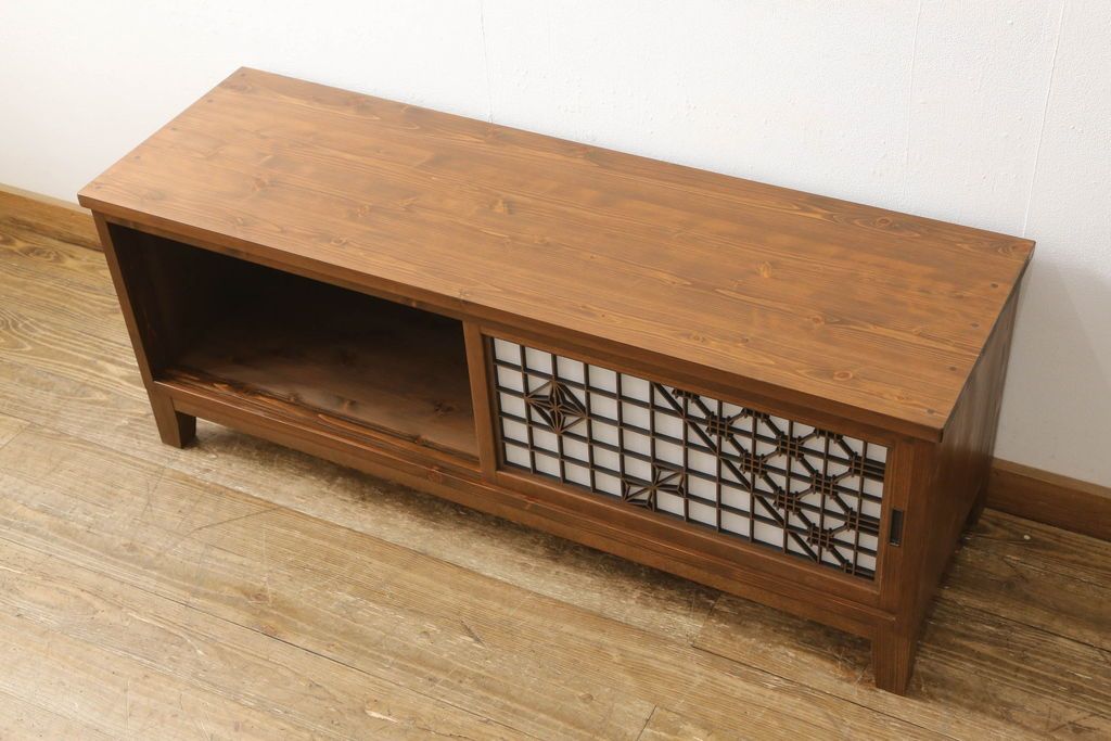キャビネット・戸棚> テレビ台・ローボード > ローボードを新規製作!ラフジュ工房オリジナル商品のデザイン・色味を参考に製作。引き戸には組子をはめ込み、厚さ24mmの天板を取り付け、収納内部中央に仕切り、木製脚を取り付け。内部に配線用の穴開け加工。(テレビボード、テレビ台、サイドボード、収納棚、戸棚)