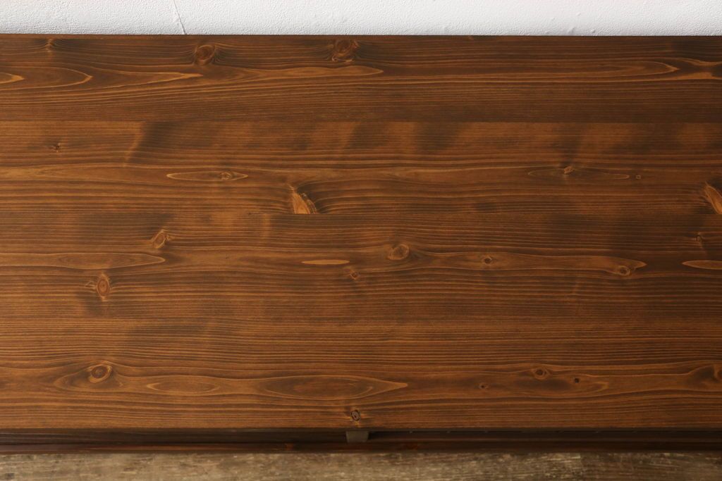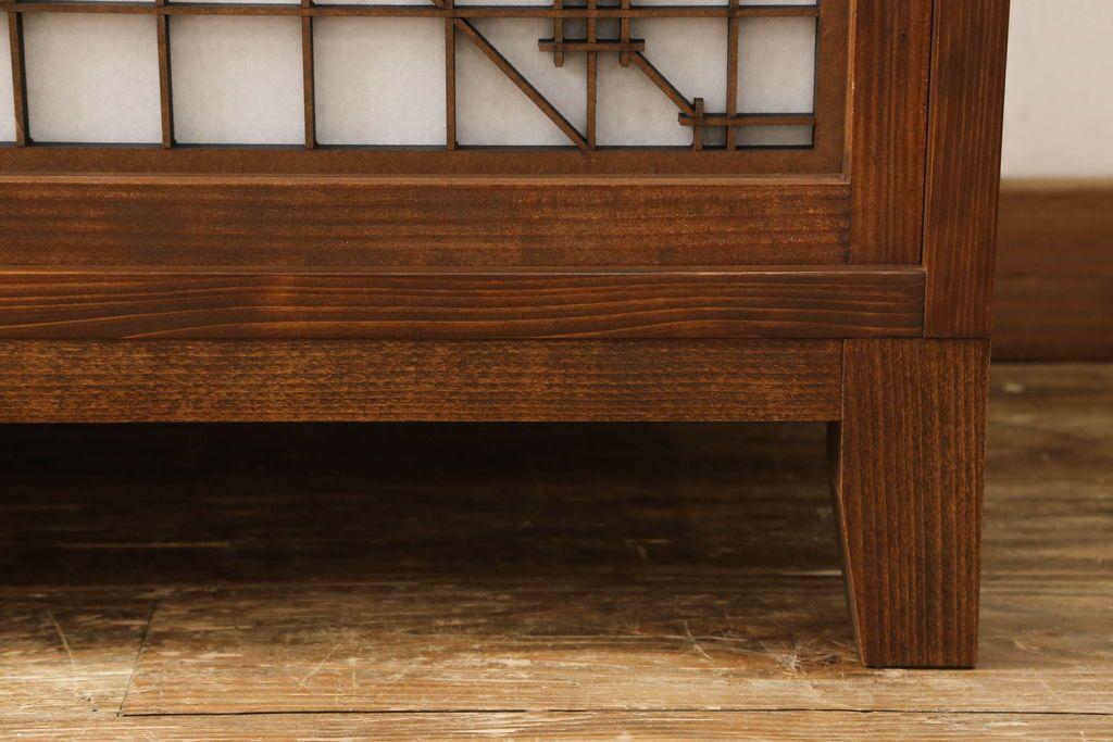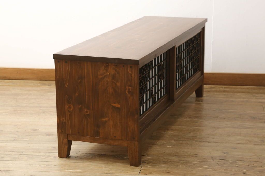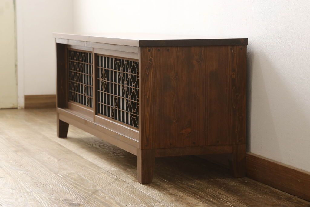 キャビネット・戸棚> サイドボード > ローボードを新規製作!ラフジュ工房オリジナル商品のデザイン・色味を参考に製作。引き戸には組子をはめ込み、厚さ24mmの天板を取り付け、収納内部中央に仕切り、木製脚を取り付け。内部に配線用の穴開け加工。(テレビボード、テレビ台、サイドボード、収納棚、戸棚)