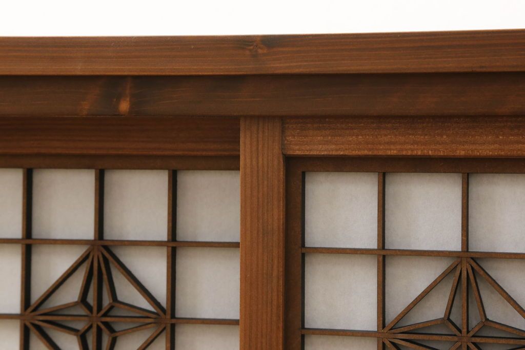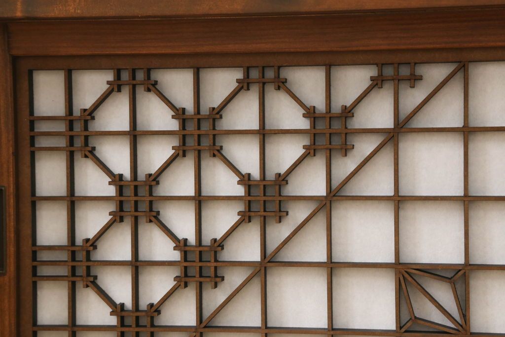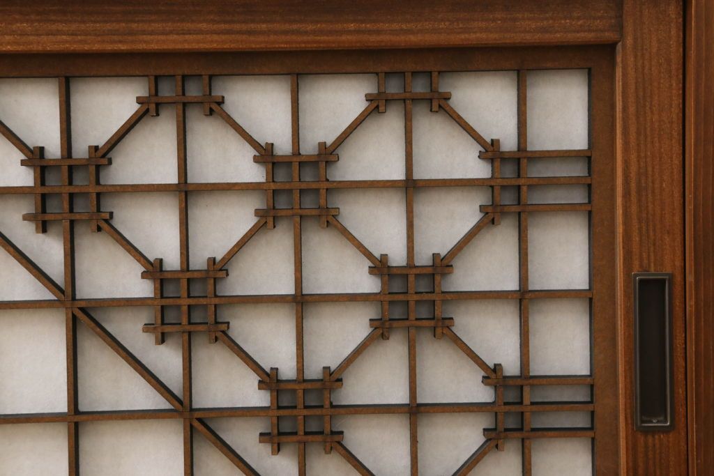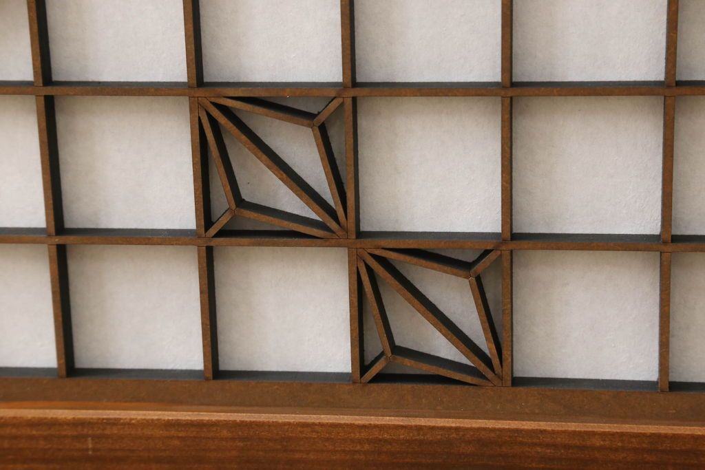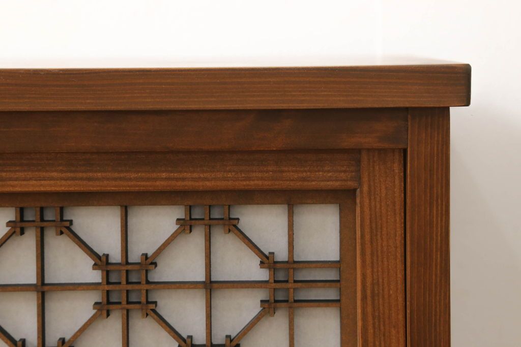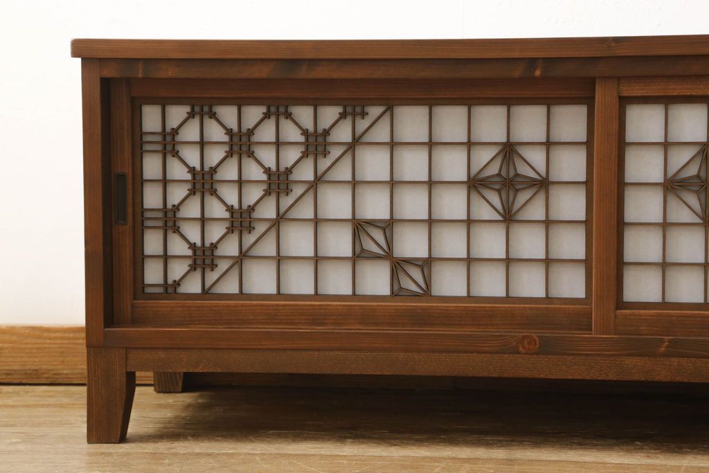 フルオーダー家具実績 > ローボードを新規製作!ラフジュ工房オリジナル商品のデザイン・色味を参考に製作。引き戸には組子をはめ込み、厚さ24mmの天板を取り付け、収納内部中央に仕切り、木製脚を取り付け。内部に配線用の穴開け加工。(テレビボード、テレビ台、サイドボード、収納棚、戸棚)
