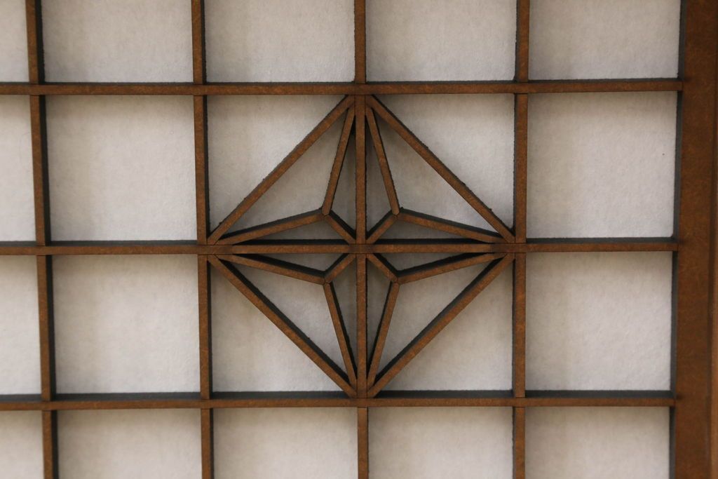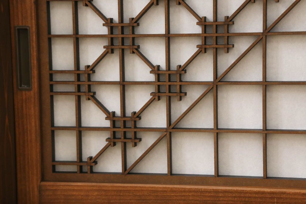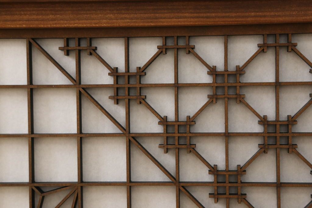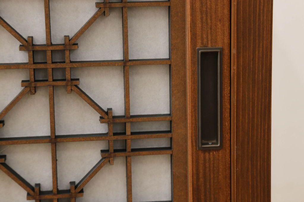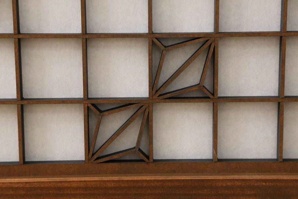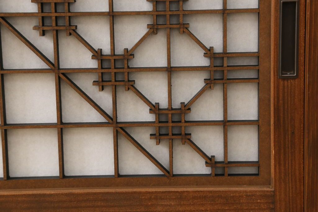 フルオーダー家具実績 > ローボードを新規製作!ラフジュ工房オリジナル商品のデザイン・色味を参考に製作。引き戸には組子をはめ込み、厚さ24mmの天板を取り付け、収納内部中央に仕切り、木製脚を取り付け。内部に配線用の穴開け加工。(テレビボード、テレビ台、サイドボード、収納棚、戸棚)