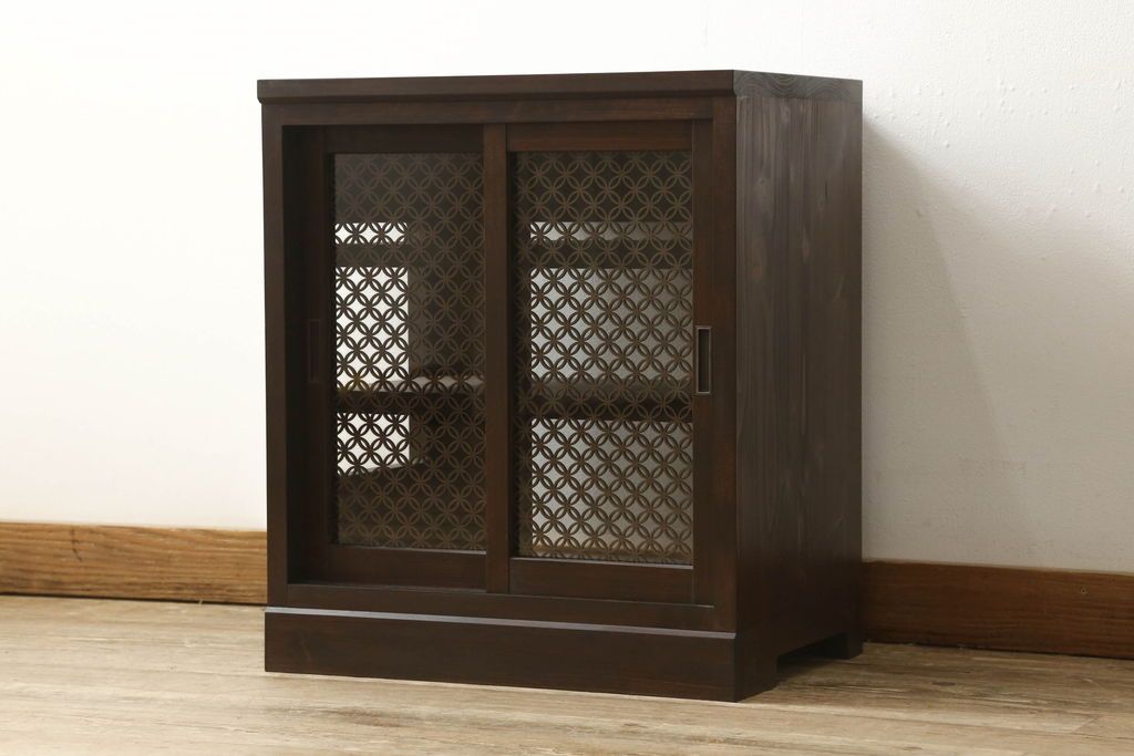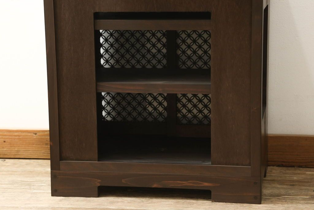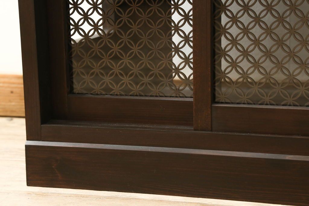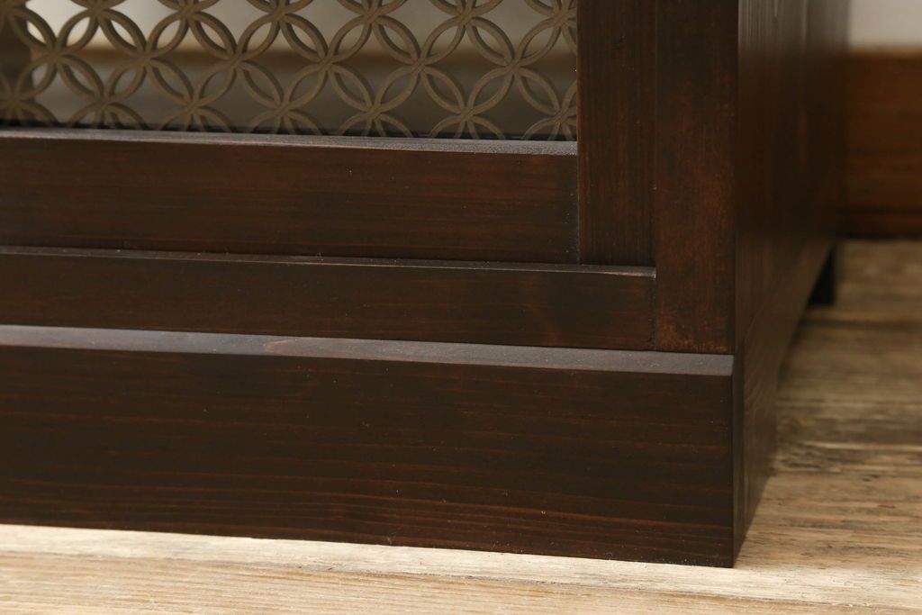 収納棚を新規製作!希望のデザイン・サイズにて。組子入りの建具、棚板、台輪を製作し取り付け。指定箇所に配線用の穴あけ加工。同時製作の箪笥ローボードと横並びに使用する事を想定した着色仕上げ。(収納棚、戸棚、キャビネット)