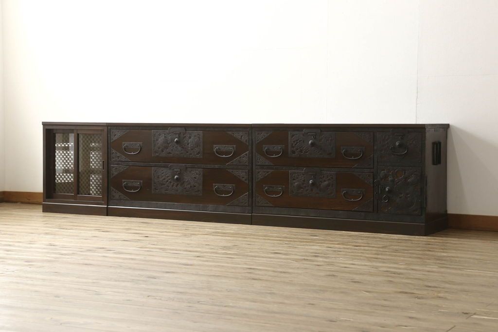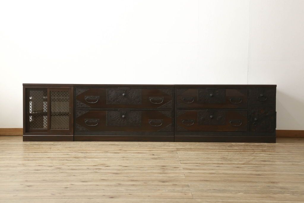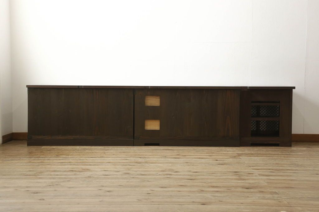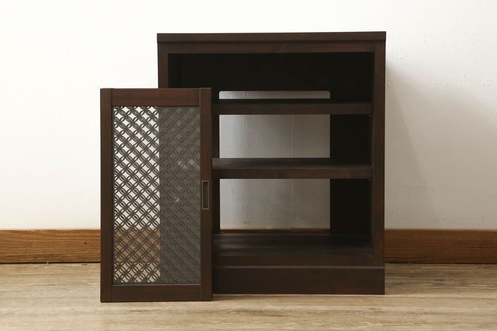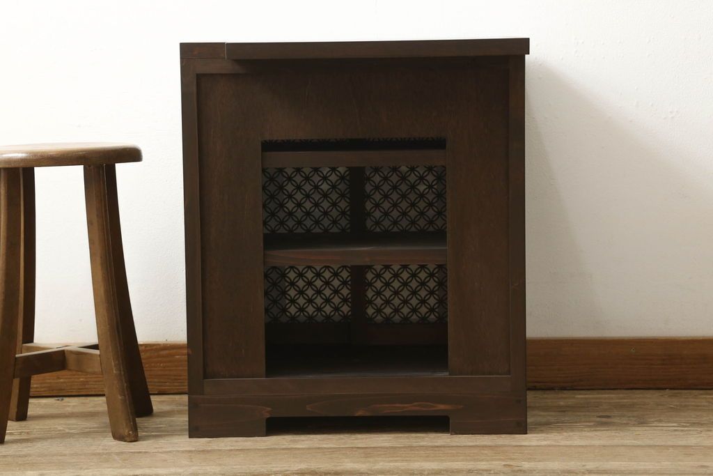収納棚を新規製作!希望のデザイン・サイズにて。組子入りの建具、棚板、台輪を製作し取り付け。指定箇所に配線用の穴あけ加工。同時製作の箪笥ローボードと横並びに使用する事を想定した着色仕上げ。(収納棚、戸棚、キャビネット)