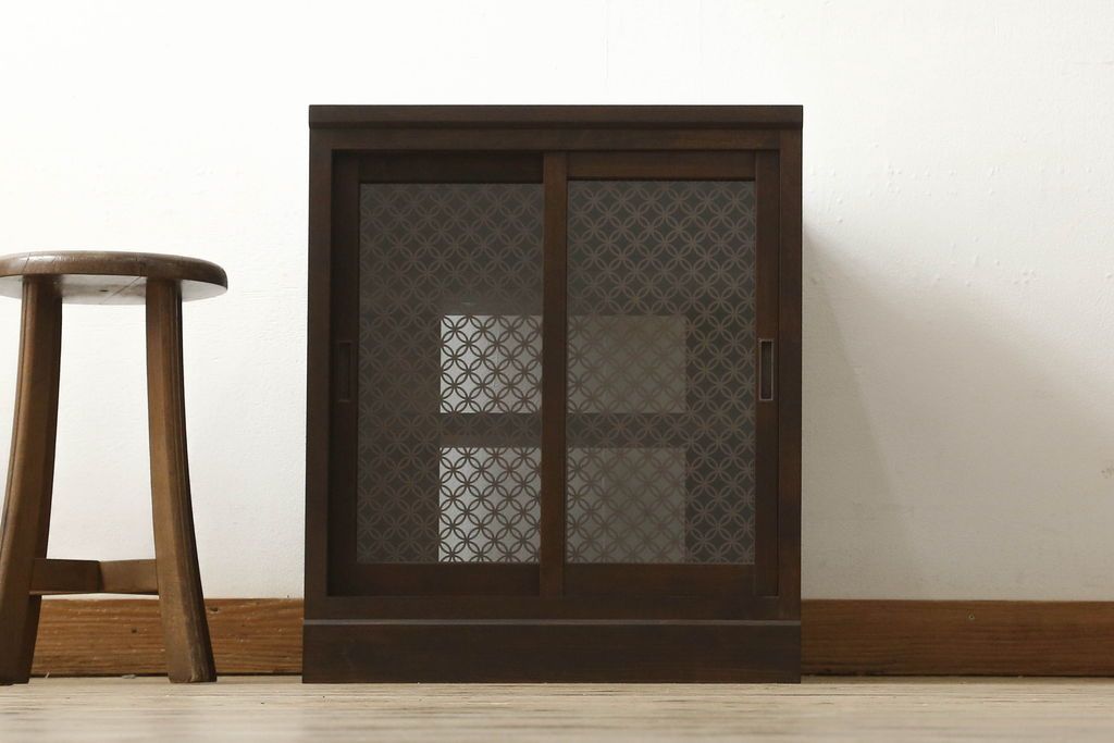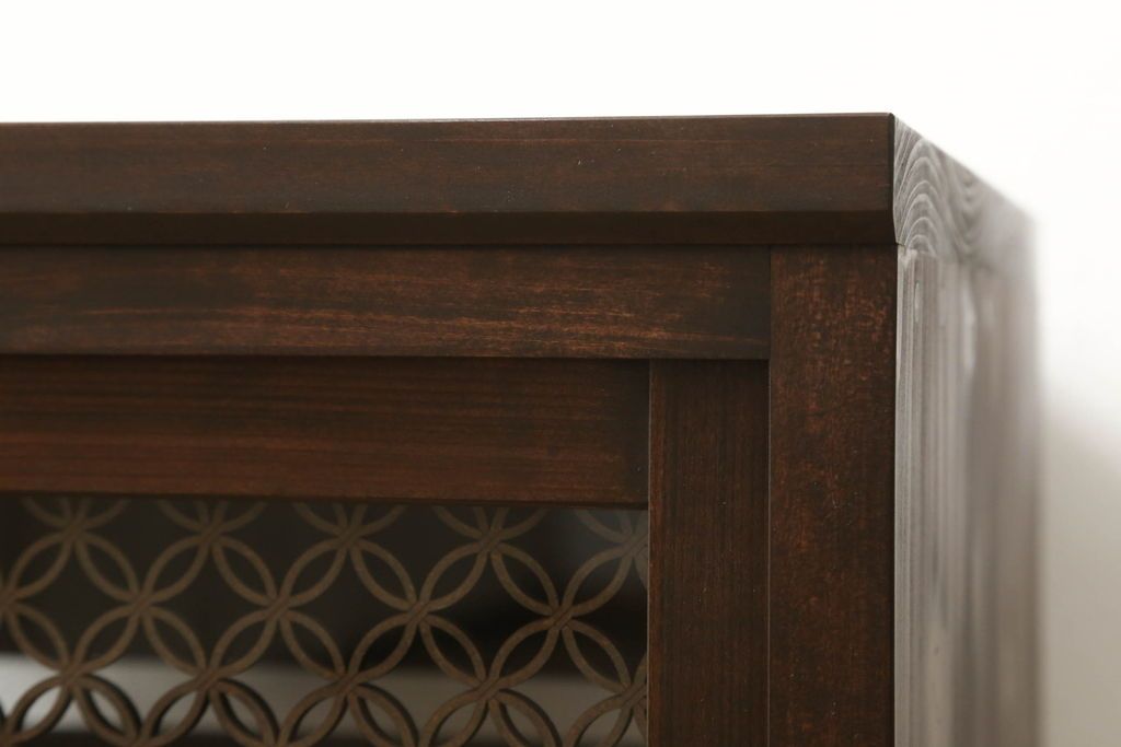 キャビネット・戸棚 > 収納棚を新規製作!希望のデザイン・サイズにて。組子入りの建具、棚板、台輪を製作し取り付け。指定箇所に配線用の穴あけ加工。同時製作の箪笥ローボードと横並びに使用する事を想定した着色仕上げ。(収納棚、戸棚、キャビネット)