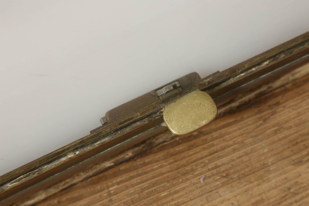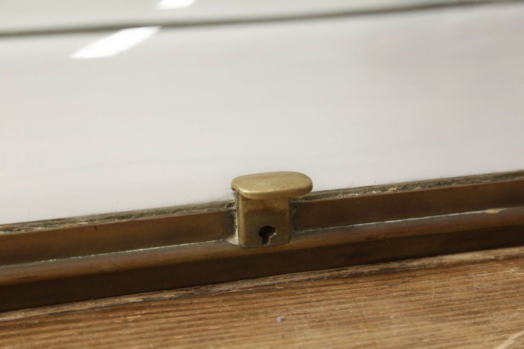 店舗什器 > ショーケースをリペア&カスタム!真鍮製のストッパーを当店商品を参考に職人が手作業で製作し取り付け。(ガラスケース、店舗什器)