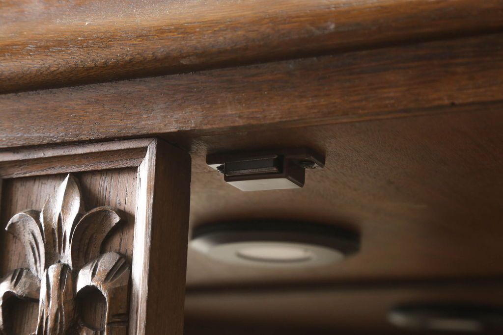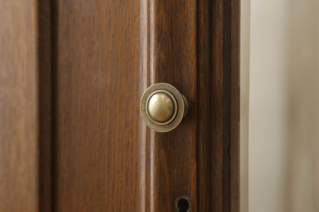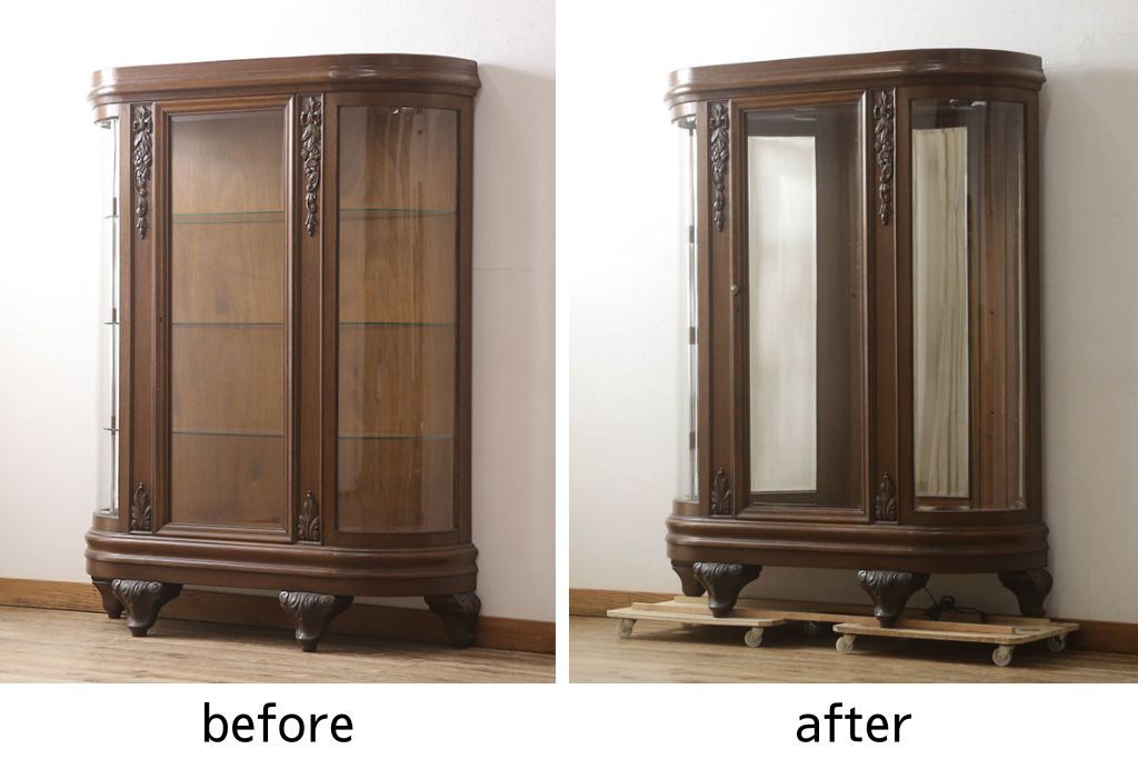 セミオーダー家具実績 > キャビネットをリペア&カスタム!背面の形状に合わせてミラーを取り付け、バランスを見てつまみも取り付け。内部天井にLEDライト、扉部分にマグネットキャッチ、脚裏にフェルトを取り付け。(ガラスケース、ショーケース、飾り棚、陳列棚、店舗什器)