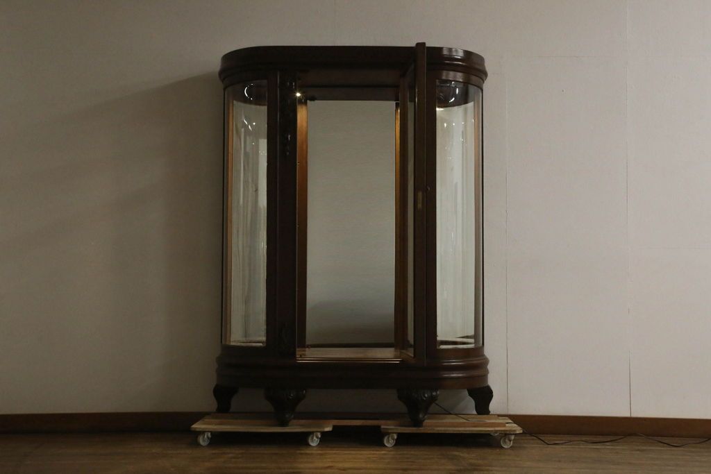 キャビネットをリペア&カスタム!背面の形状に合わせてミラーを取り付け、バランスを見てつまみも取り付け。内部天井にLEDライト、扉部分にマグネットキャッチ、脚裏にフェルトを取り付け。(ガラスケース、ショーケース、飾り棚、陳列棚、店舗什器)
