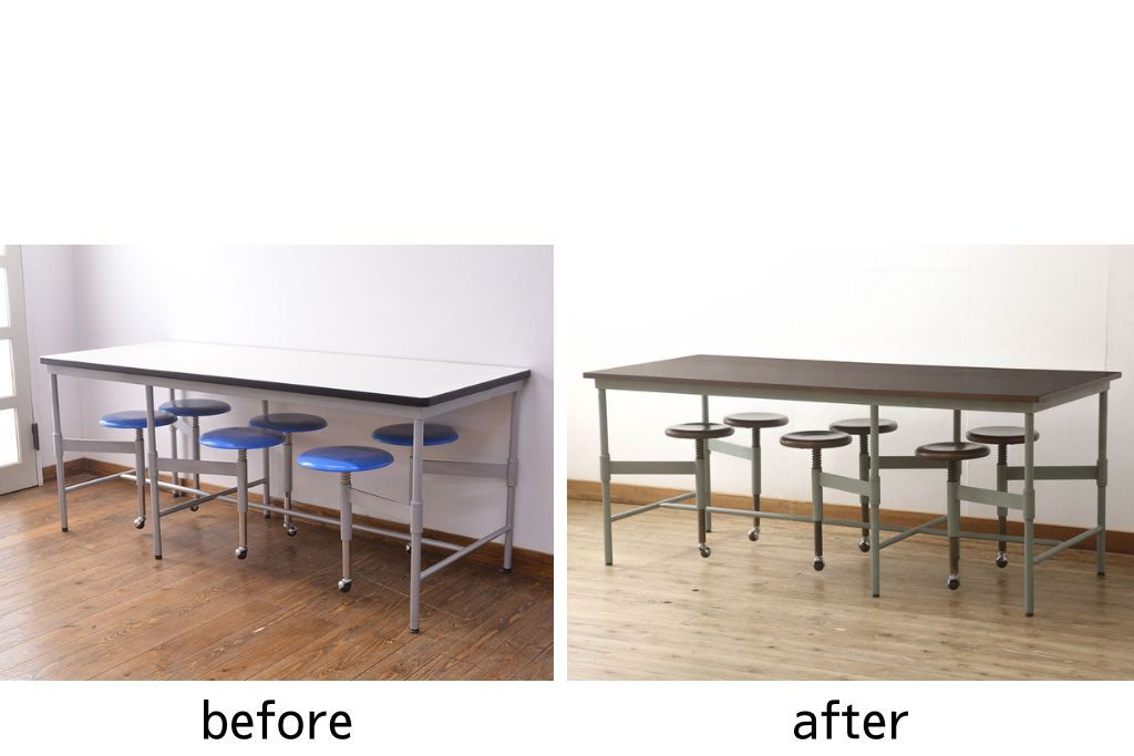 格納スツール6脚付きテーブルをリペア&カスタム!当店商品を参考に天板と座面を交換。天板、キャスターを着色して仕上げ。(6人用ダイニングテーブル、作業台)
