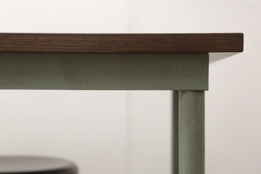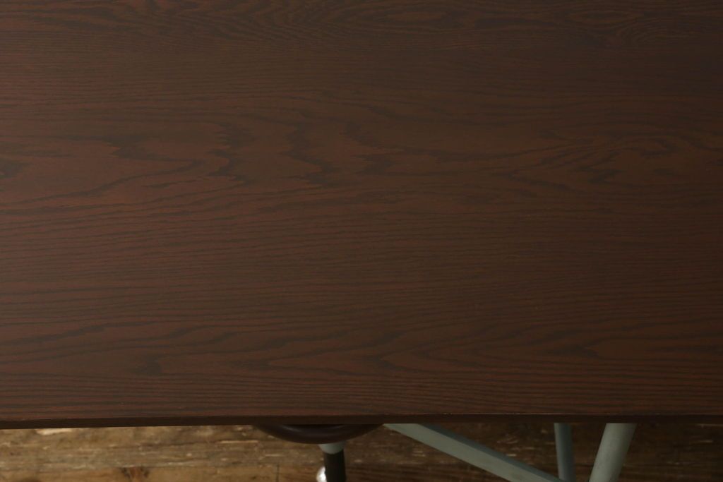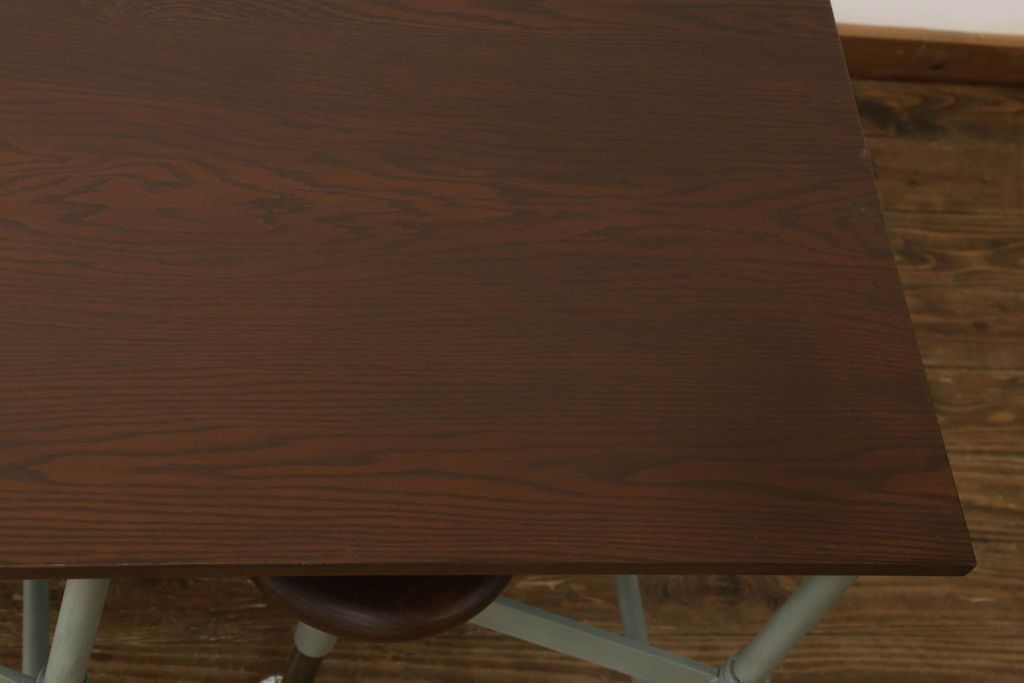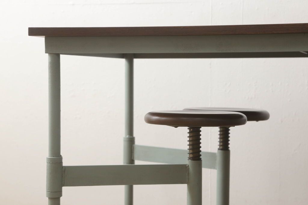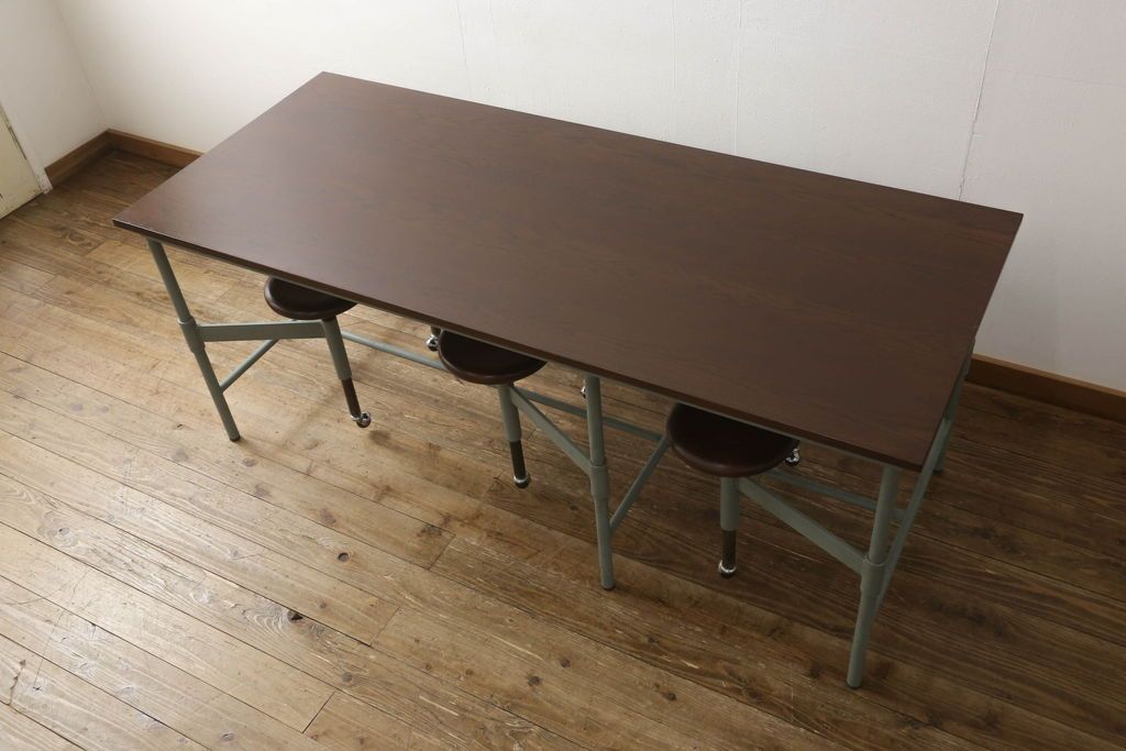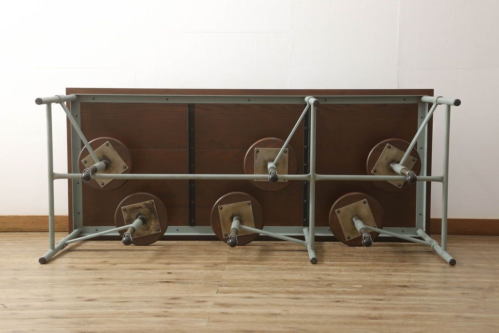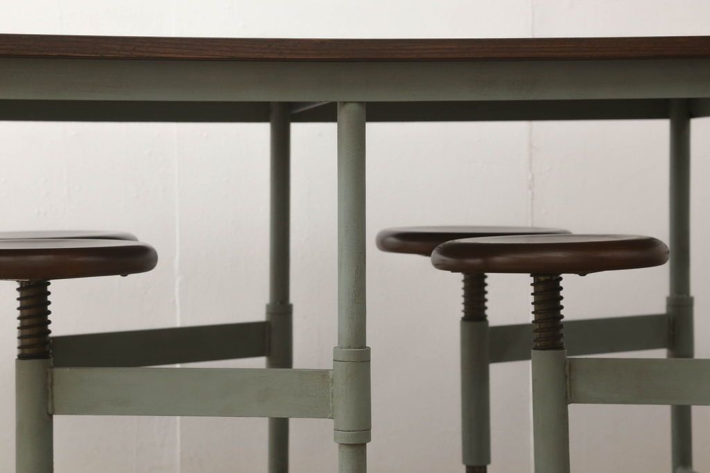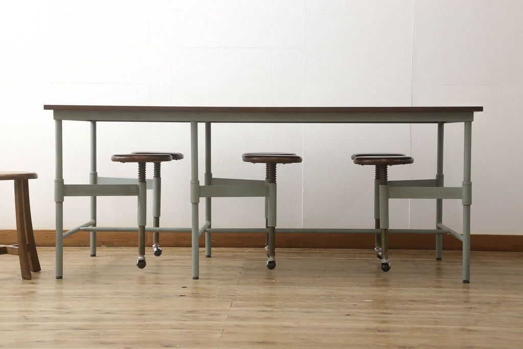 テーブル> 鉄脚テーブル > 格納スツール6脚付きテーブルをリペア&カスタム!当店商品を参考に天板と座面を交換。天板、キャスターを着色して仕上げ。(6人用ダイニングテーブル、作業台)