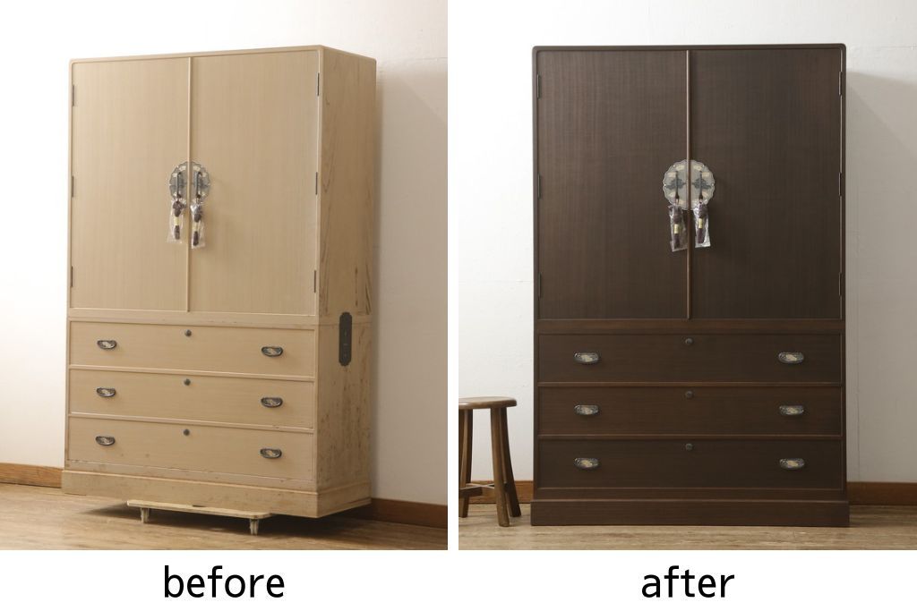 和箪笥 > 総桐箪笥をリペア&カスタム!色味は当店オーダー家具を参考にチェスナット系に着色。 (並厚、桐たんす、着物箪笥、和タンス、衣装箪笥、引き出し)