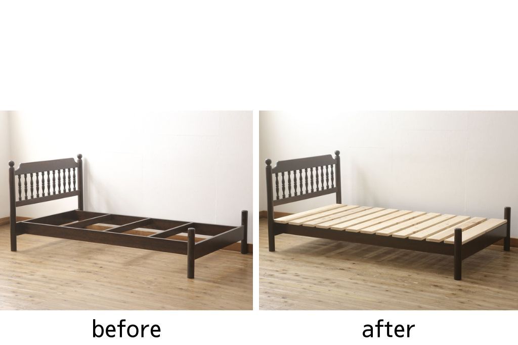 ベッド> シングル > ベッドフレームをリペア&カスタム!ベットフレームに合わせてすのこを製作。本体は現状をベースにして1トーン程落ち着いた色味に着色し、修繕箇所は本体と馴染むよう仕上げ。(シングル)