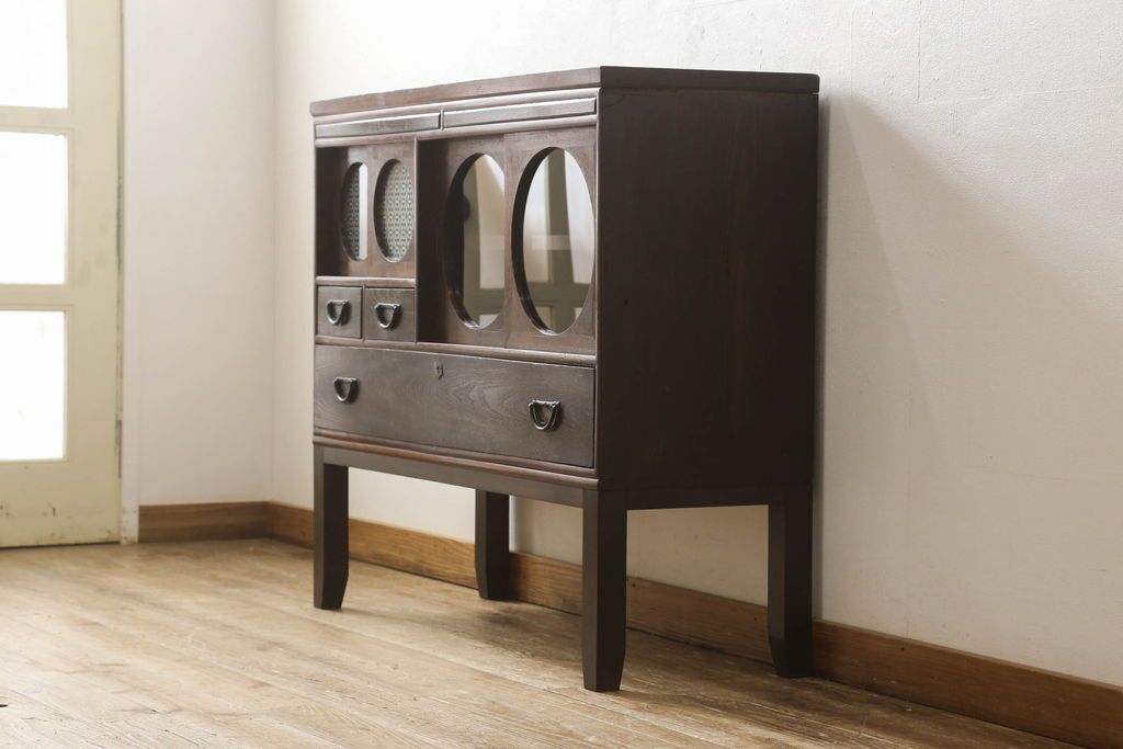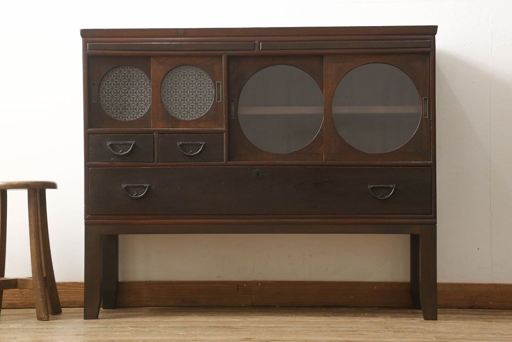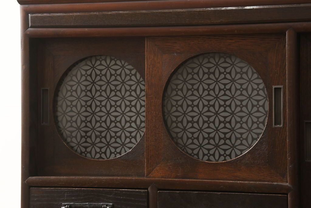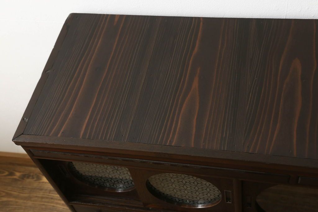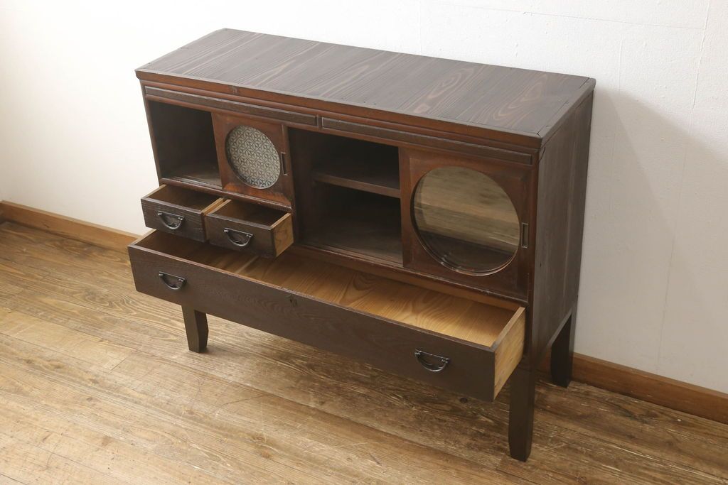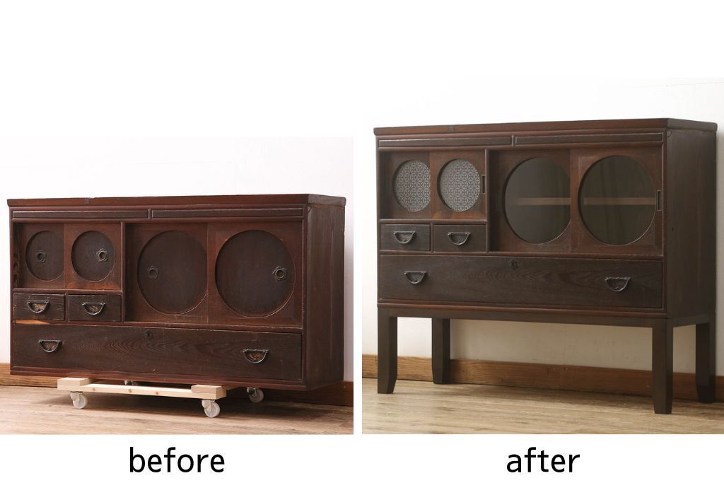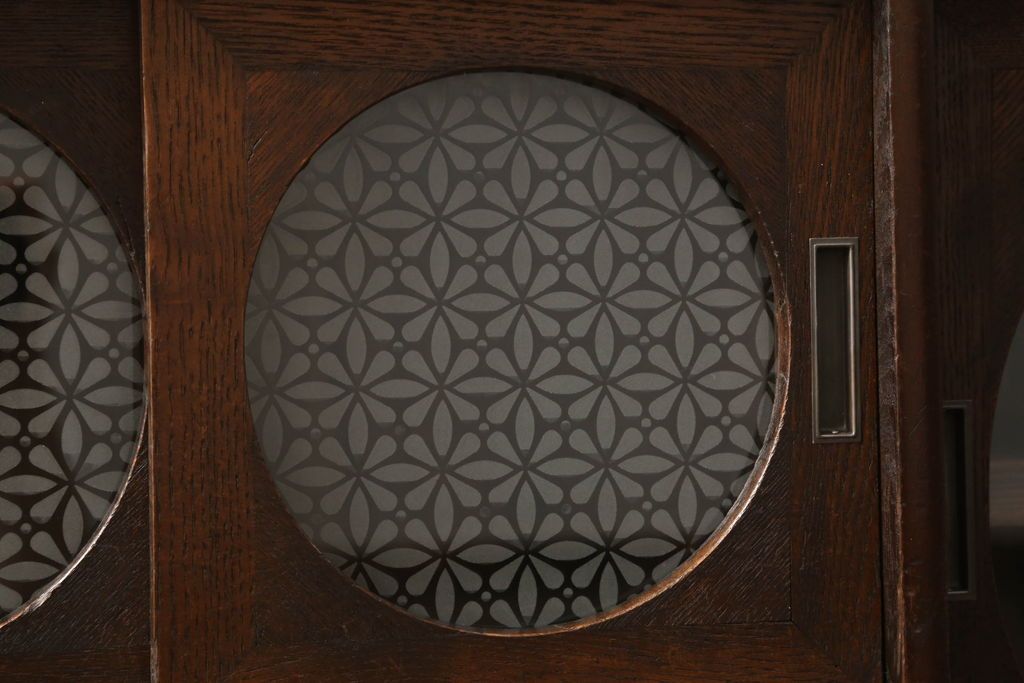 セミオーダー家具実績 > テレビ台をリペア&カスタム!大きい丸窓はクリアガラス、小さい丸窓は変わり花菱模様ガラスを取り付け。木製脚を取り付け、本体は現状をベースにして1トーン程落ち着いた色味に着色し、修繕箇所は本体と馴染むよう仕上げ。(テレビボード、サイドボード、ローボード、丸窓付き)