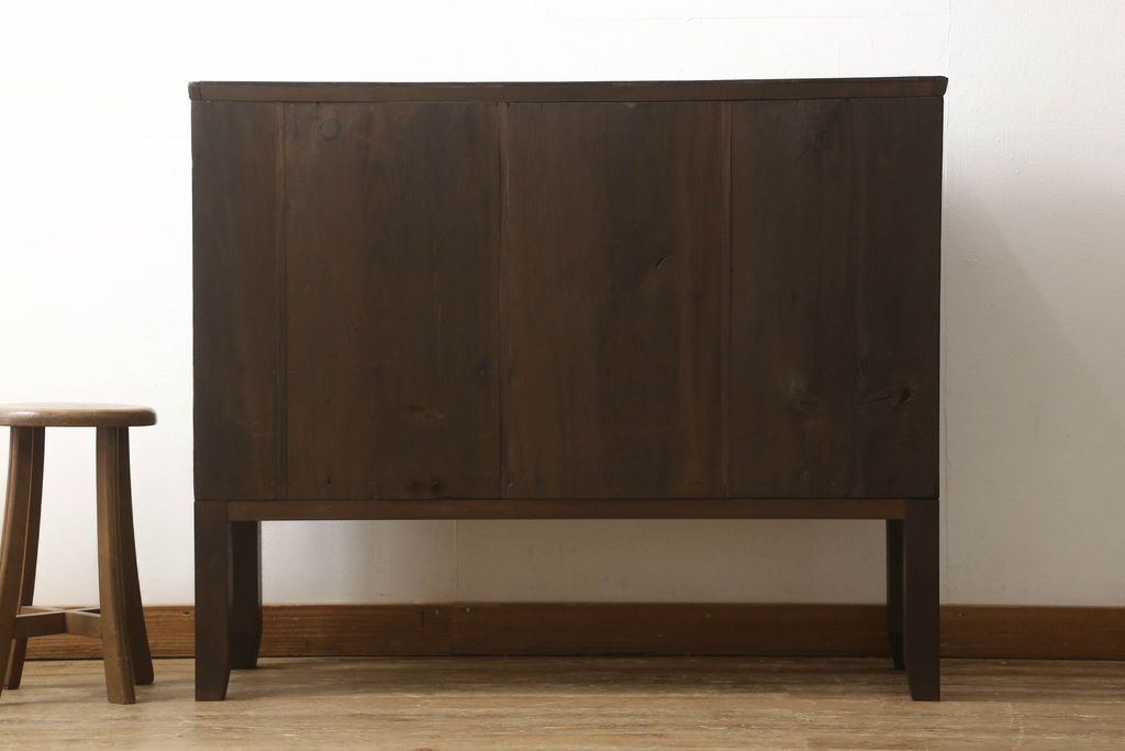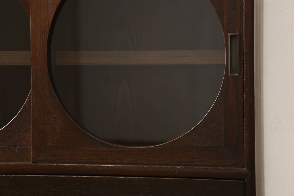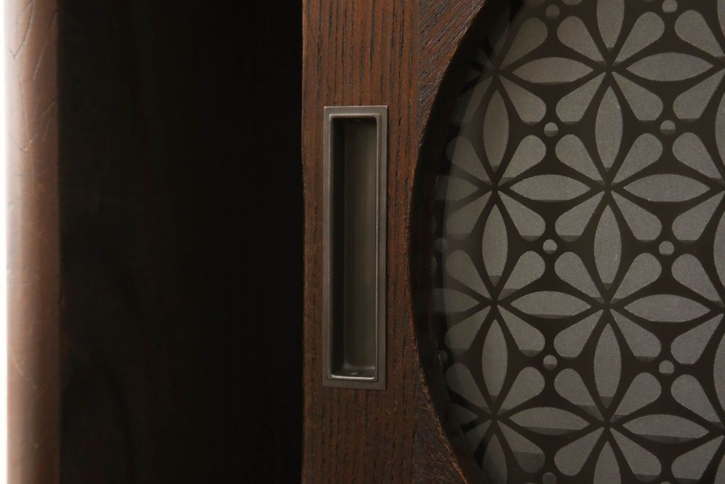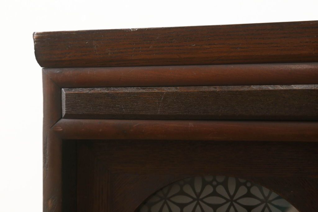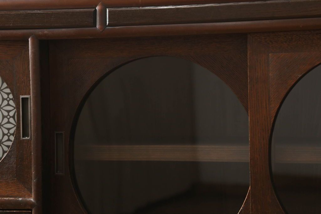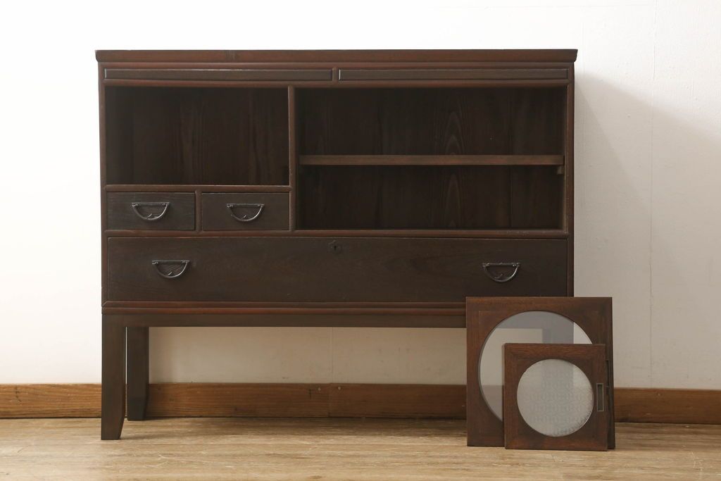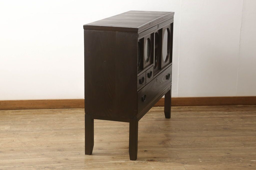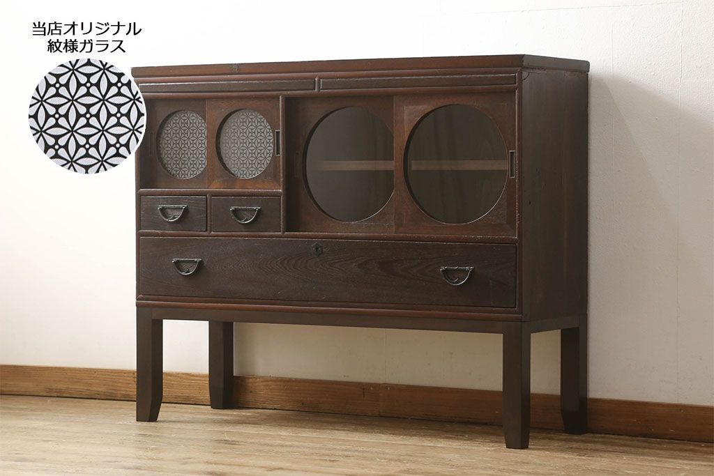 セミオーダー家具実績 > テレビ台をリペア&カスタム!大きい丸窓はクリアガラス、小さい丸窓は変わり花菱模様ガラスを取り付け。木製脚を取り付け、本体は現状をベースにして1トーン程落ち着いた色味に着色し、修繕箇所は本体と馴染むよう仕上げ。(テレビボード、サイドボード、ローボード、丸窓付き)
