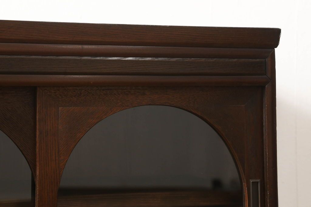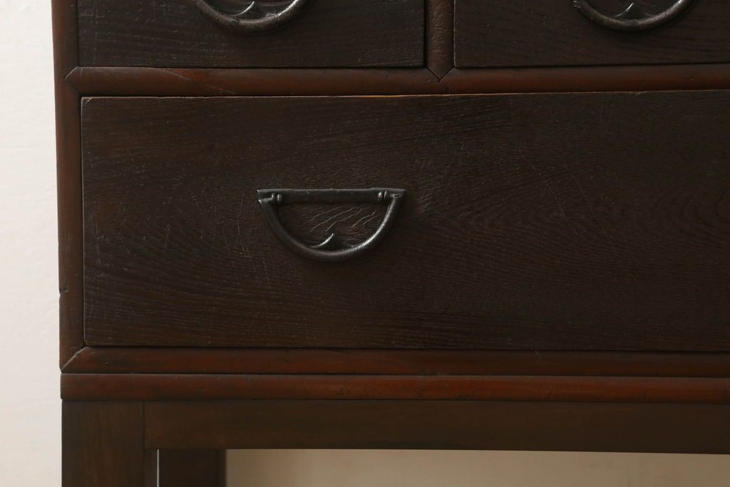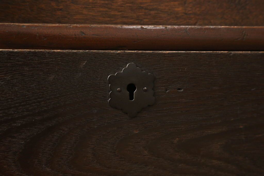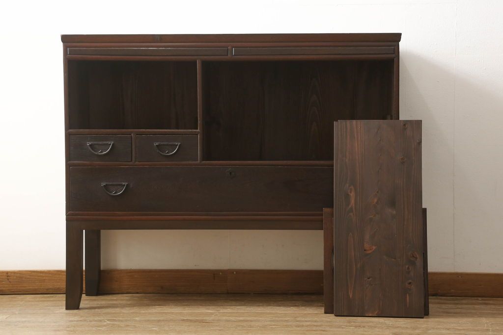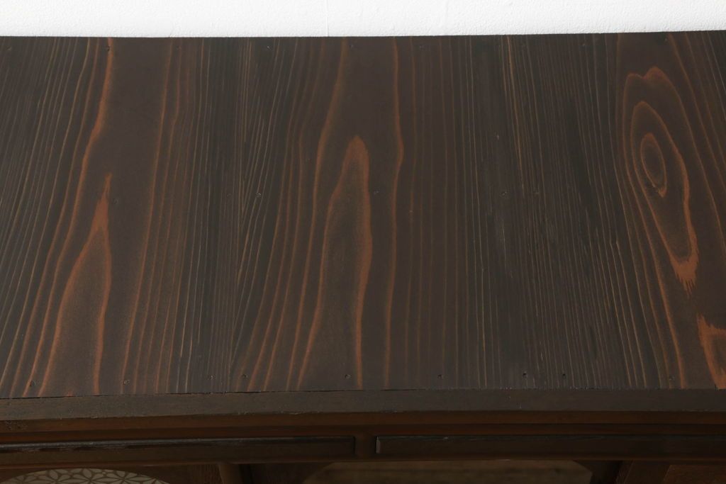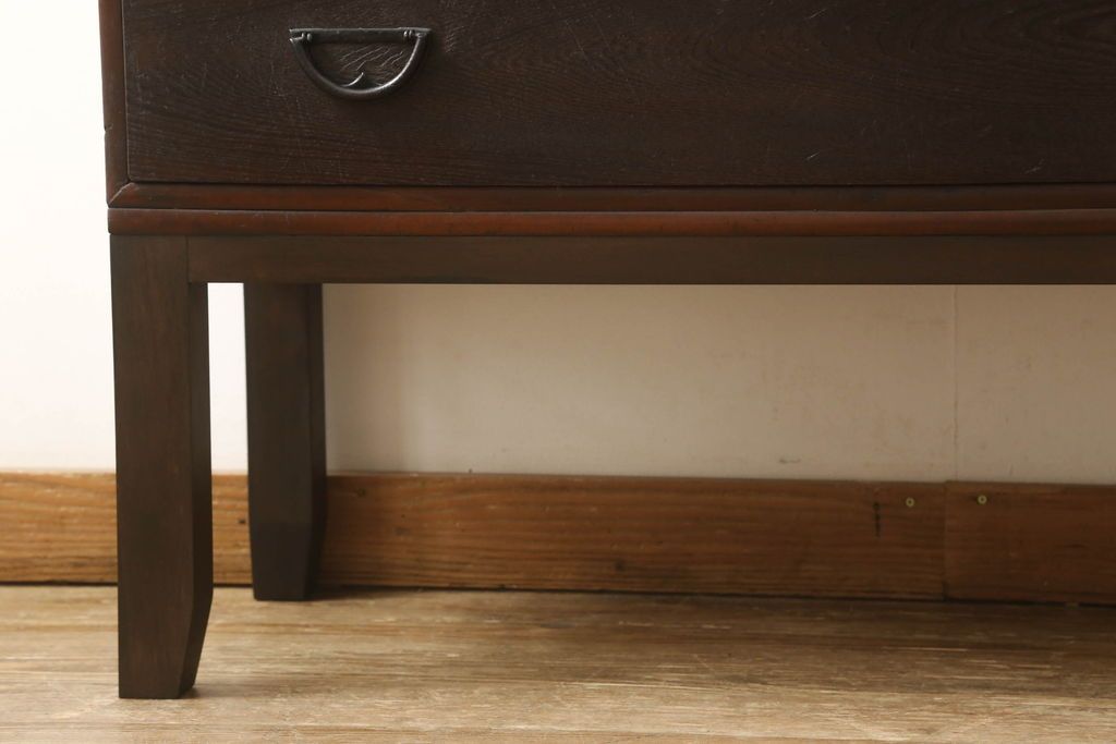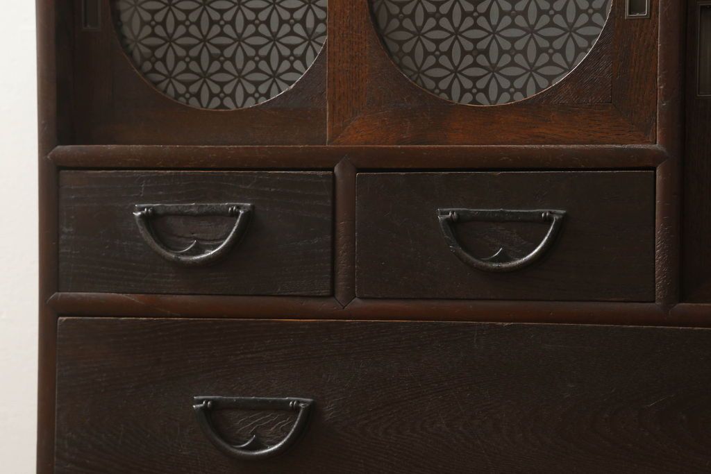 セミオーダー家具実績 > テレビ台をリペア&カスタム!大きい丸窓はクリアガラス、小さい丸窓は変わり花菱模様ガラスを取り付け。木製脚を取り付け、本体は現状をベースにして1トーン程落ち着いた色味に着色し、修繕箇所は本体と馴染むよう仕上げ。(テレビボード、サイドボード、ローボード、丸窓付き)
