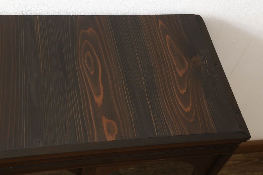 キャビネット・戸棚> テレビ台・ローボード > テレビ台をリペア&カスタム!大きい丸窓はクリアガラス、小さい丸窓は変わり花菱模様ガラスを取り付け。木製脚を取り付け、本体は現状をベースにして1トーン程落ち着いた色味に着色し、修繕箇所は本体と馴染むよう仕上げ。(テレビボード、サイドボード、ローボード、丸窓付き)