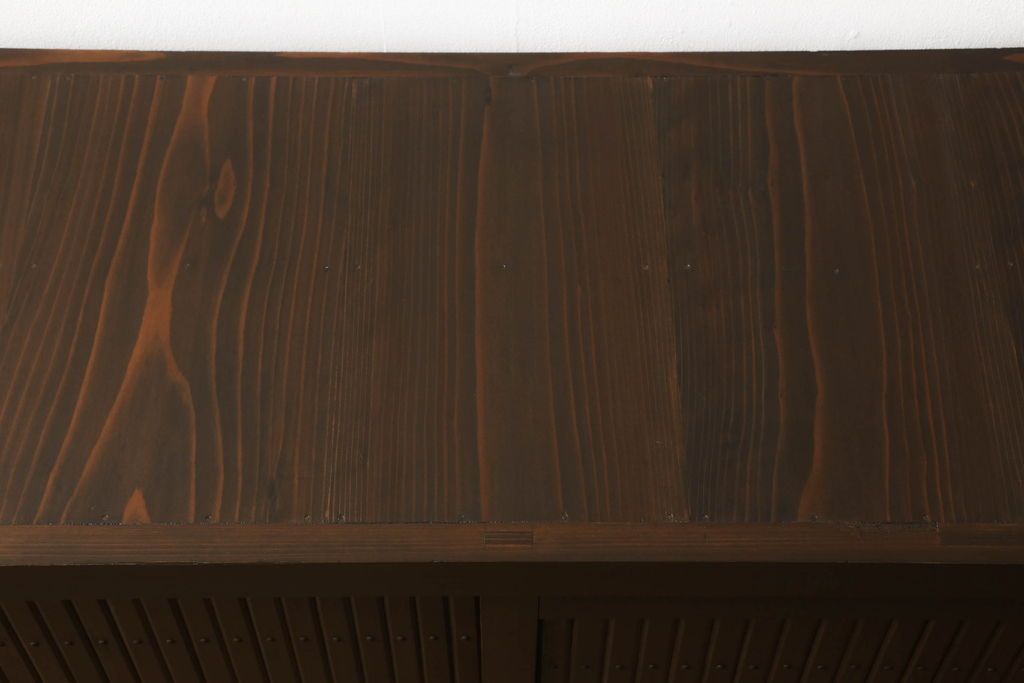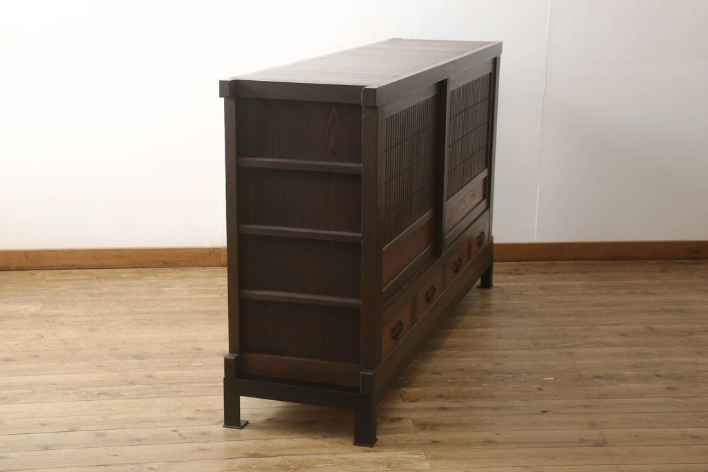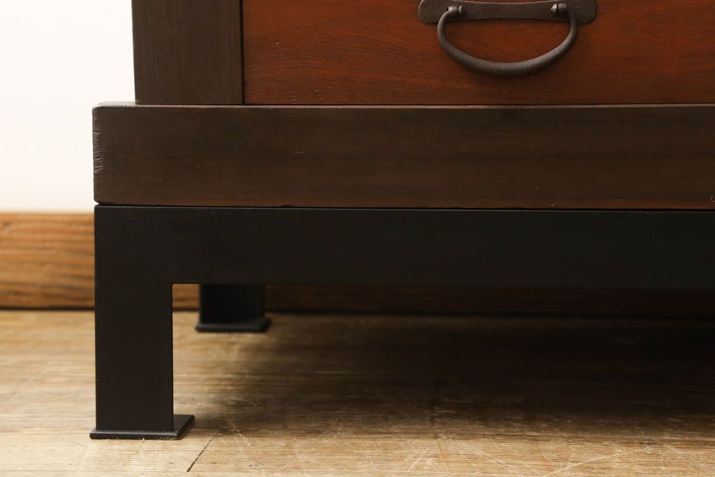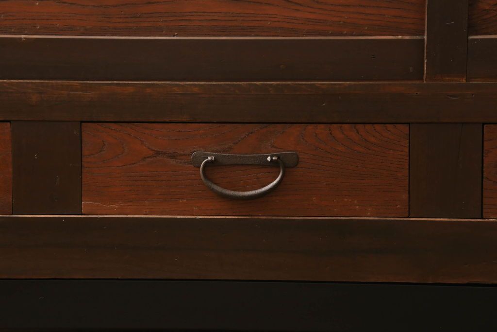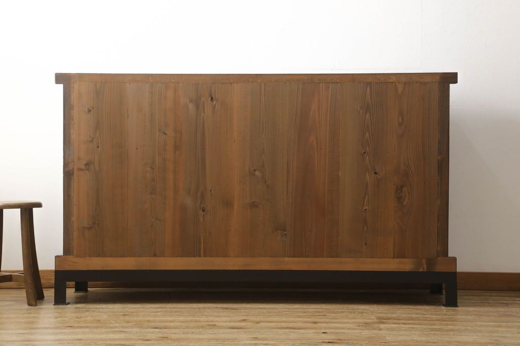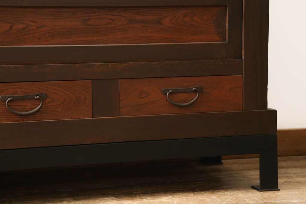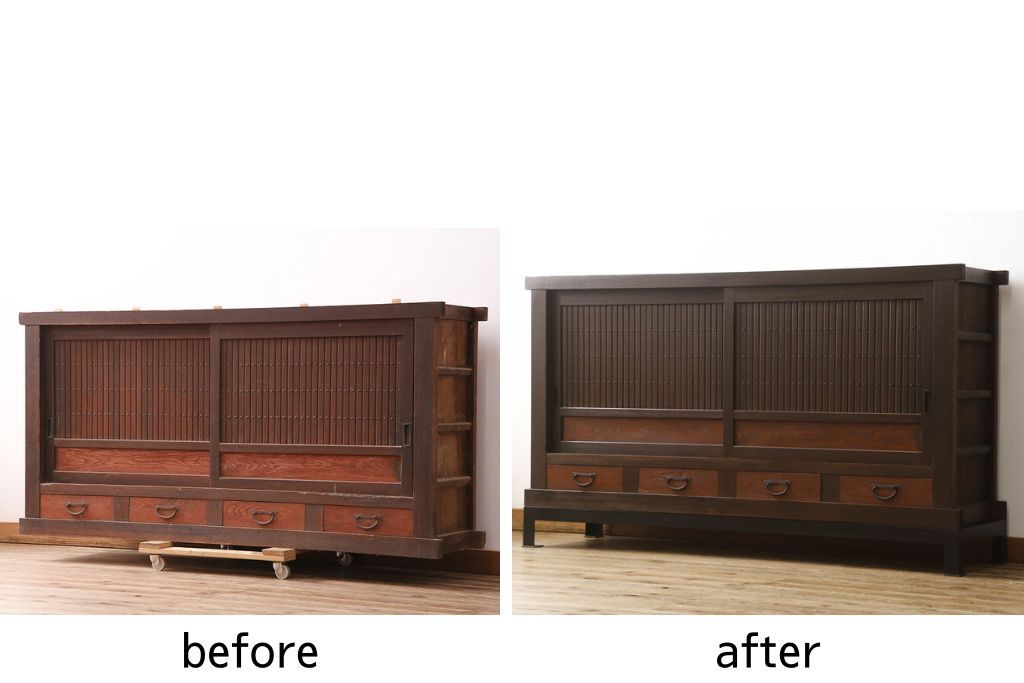 和箪笥> 水屋箪笥 > サイドボードをリペア&カスタム!当店の商品を参考に鉄脚を製作し取り付け。木部は現状の品物に合わせて1トーン程落ち着いた色に着色し、修繕箇所は本体と馴染むよう仕上げ。(水屋箪笥、収納棚、戸棚、サイドボード)