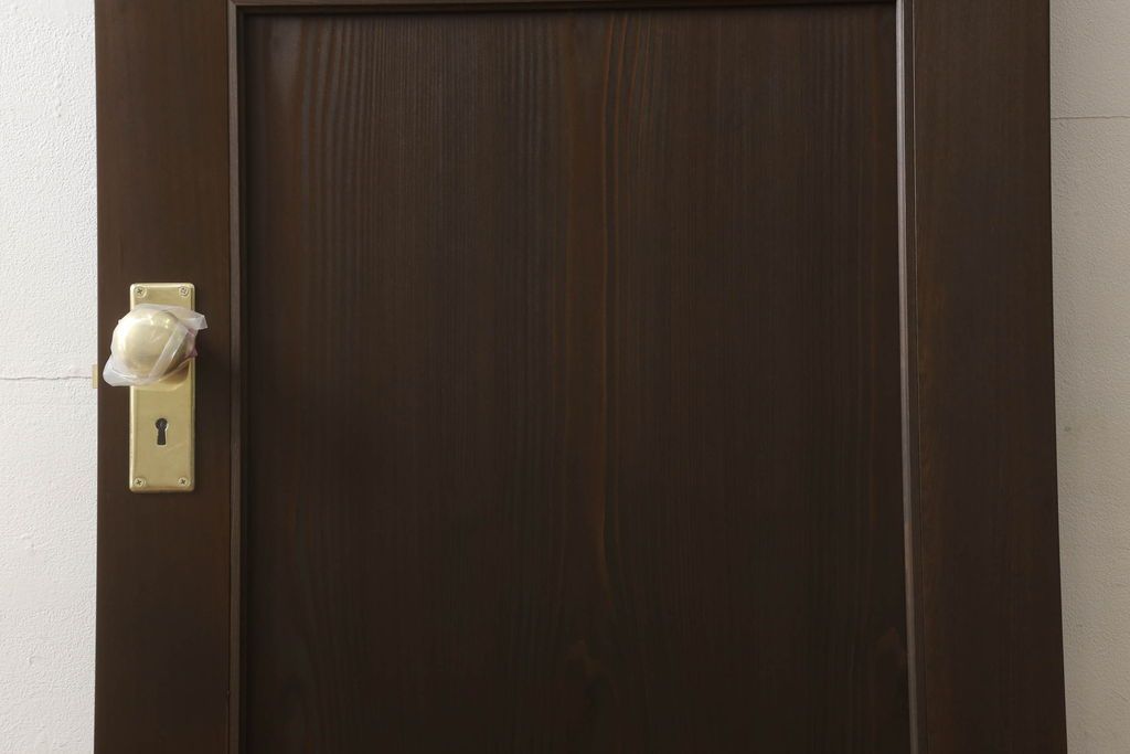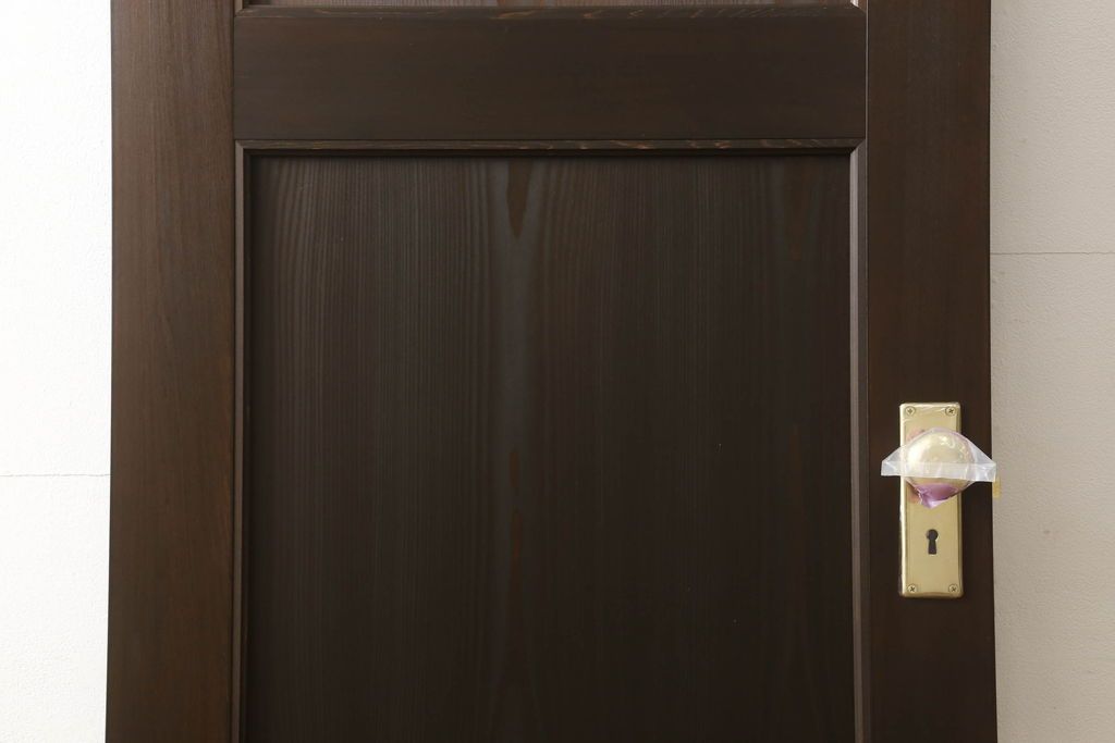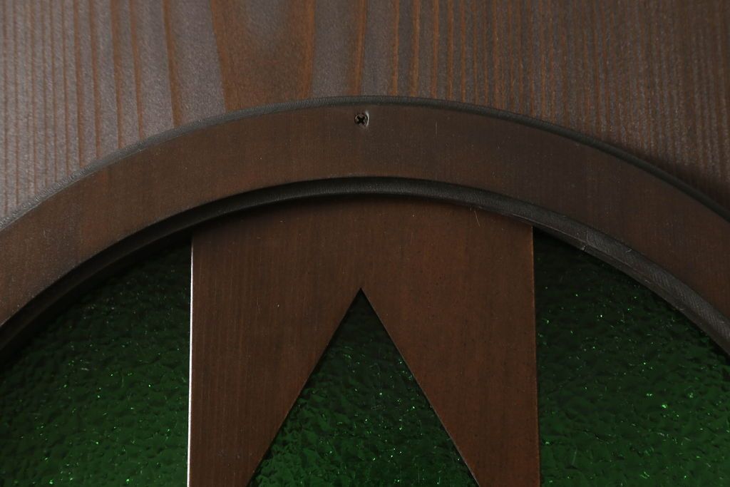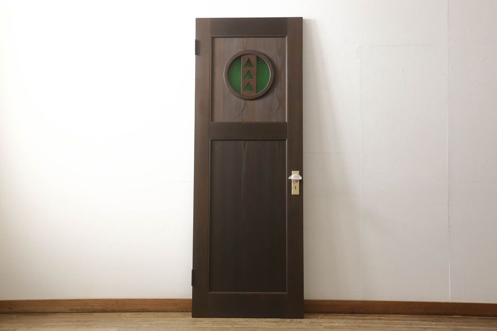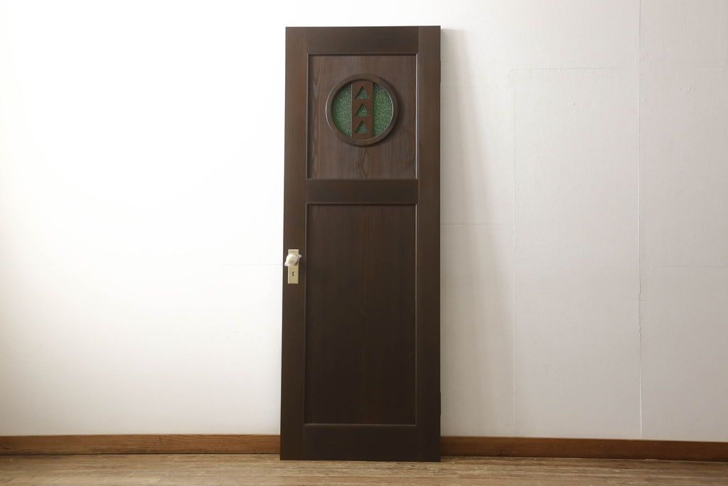 ドア・建具> ガラス戸 > ドアを新規製作!丸窓デザインで、透かし彫りに緑のダイヤガラス入り。支給のドアノブを取り付け、本体の色味は当店商品を参考に着色。(木製扉、ガラス扉)