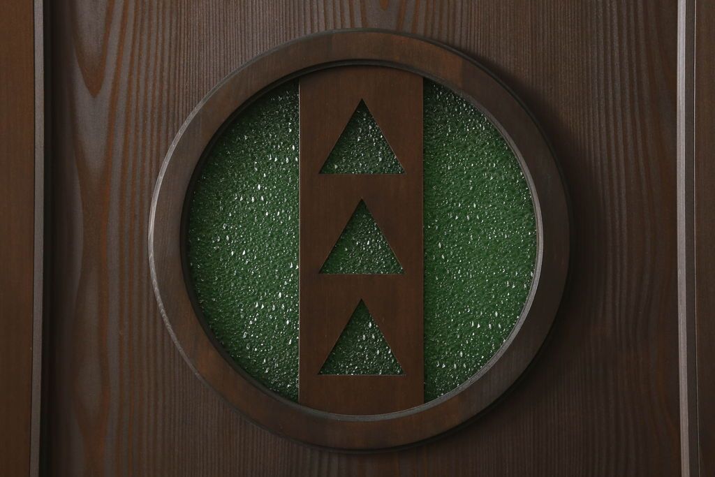 ドア・建具> 色ガラス・ステンド入り建具 > ドアを新規製作!丸窓デザインで、透かし彫りに緑のダイヤガラス入り。支給のドアノブを取り付け、本体の色味は当店商品を参考に着色。(木製扉、ガラス扉)