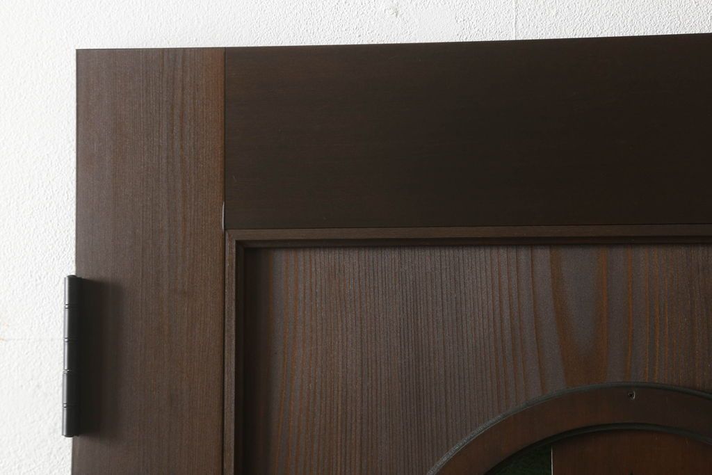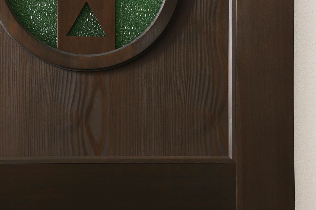 ドア・建具> ドア・扉 > ドアを新規製作!丸窓デザインで、透かし彫りに緑のダイヤガラス入り。支給のドアノブを取り付け、本体の色味は当店商品を参考に着色。(木製扉、ガラス扉)