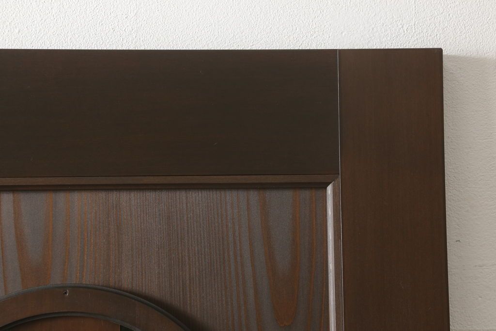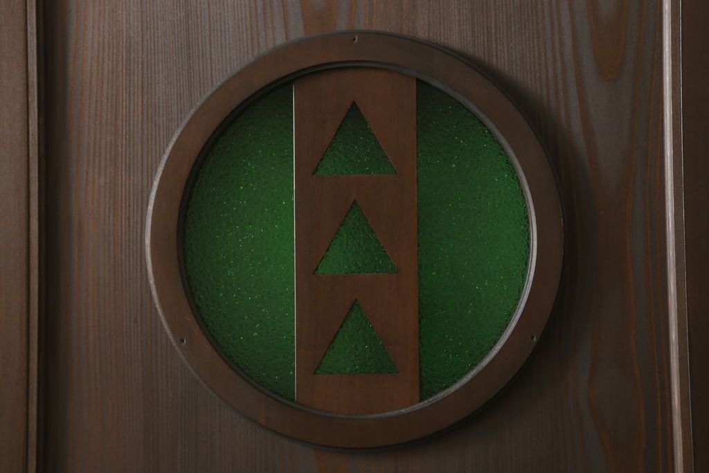 フルオーダー家具実績 > ドアを新規製作!丸窓デザインで、透かし彫りに緑のダイヤガラス入り。支給のドアノブを取り付け、本体の色味は当店商品を参考に着色。(木製扉、ガラス扉)