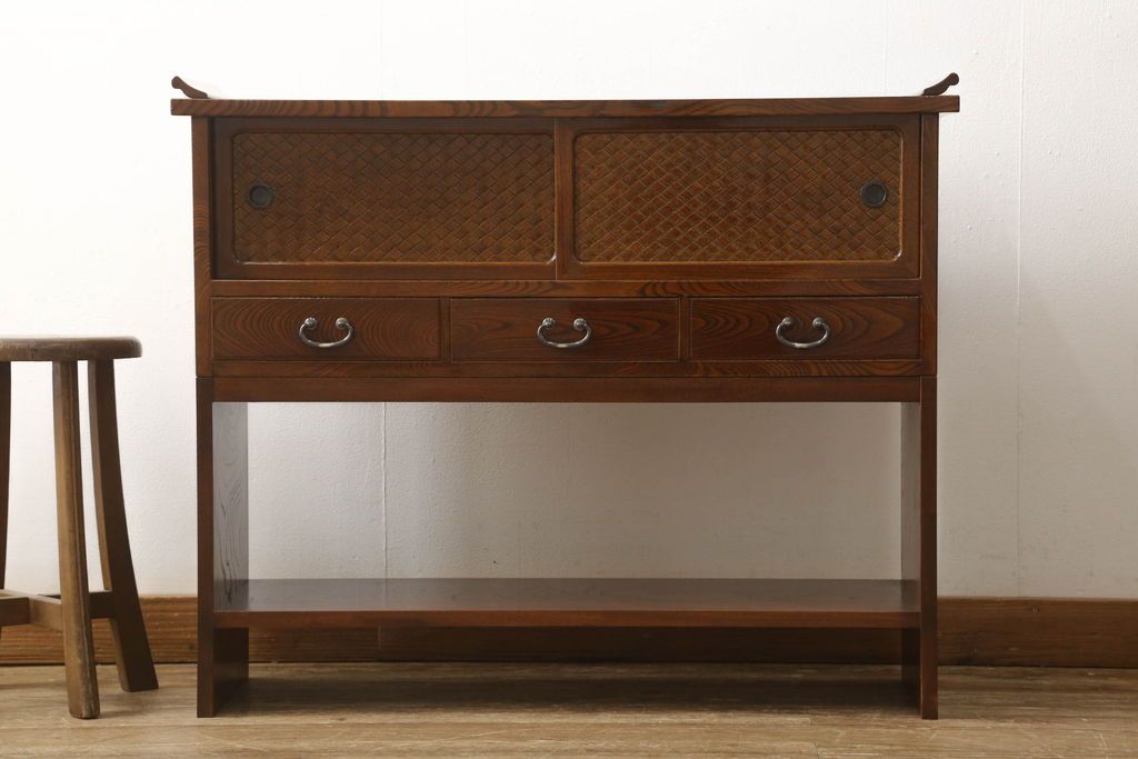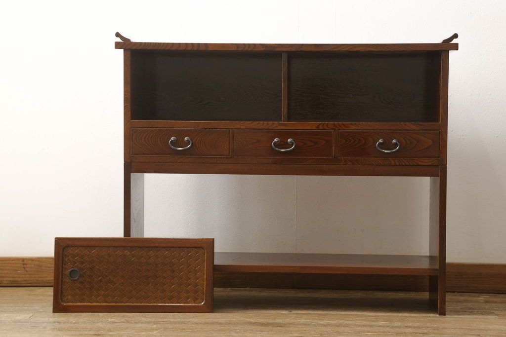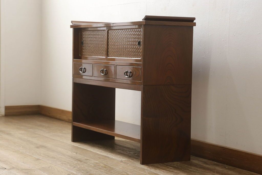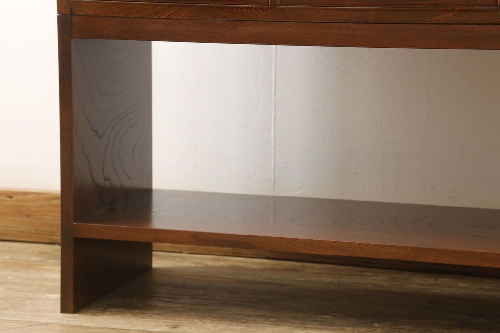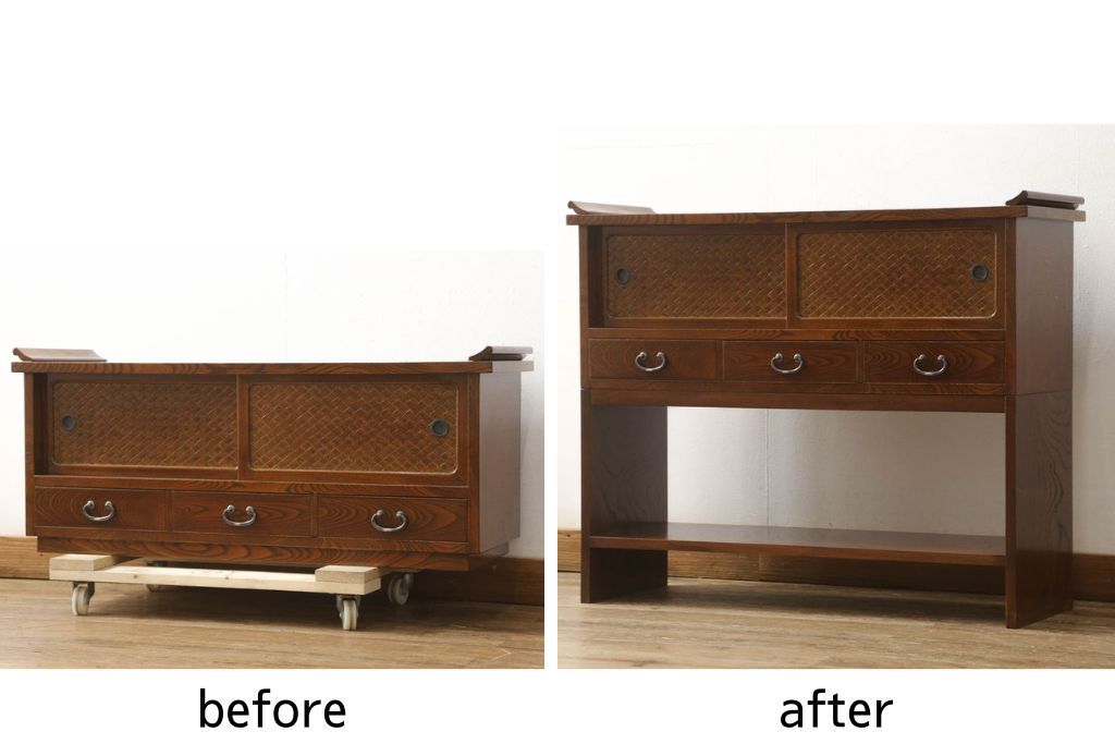 民芸家具 > 置き床をリペア&カスタム!お客様ご希望のデザインを参考に脚を製作し取り付け。色味はカシュー漆にて仕上げ。 (ローボード、テレビ台、戸棚、収納棚、飾り台)
