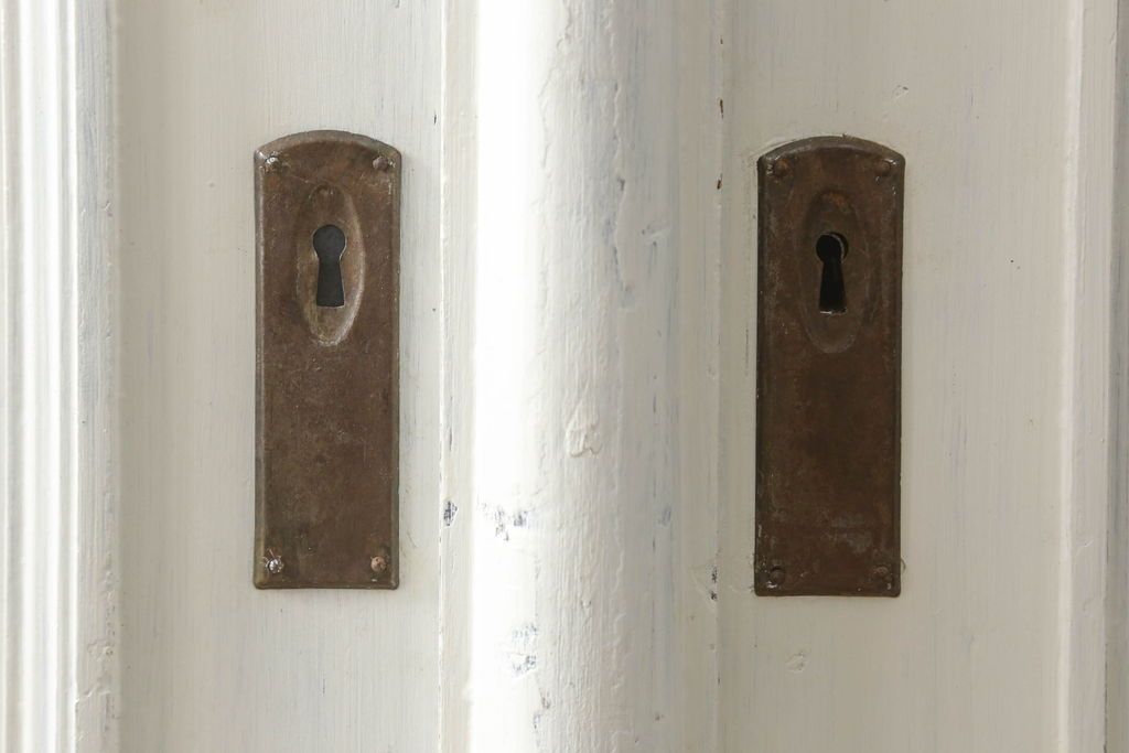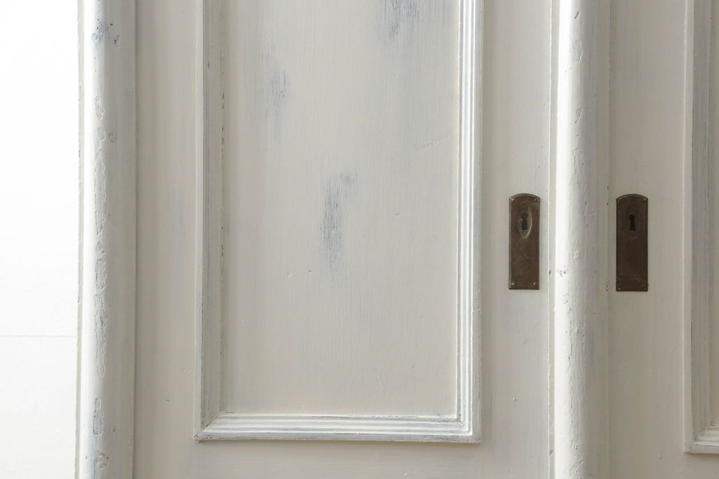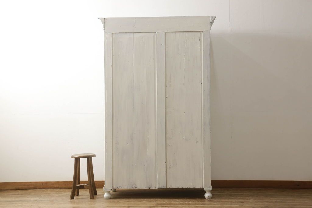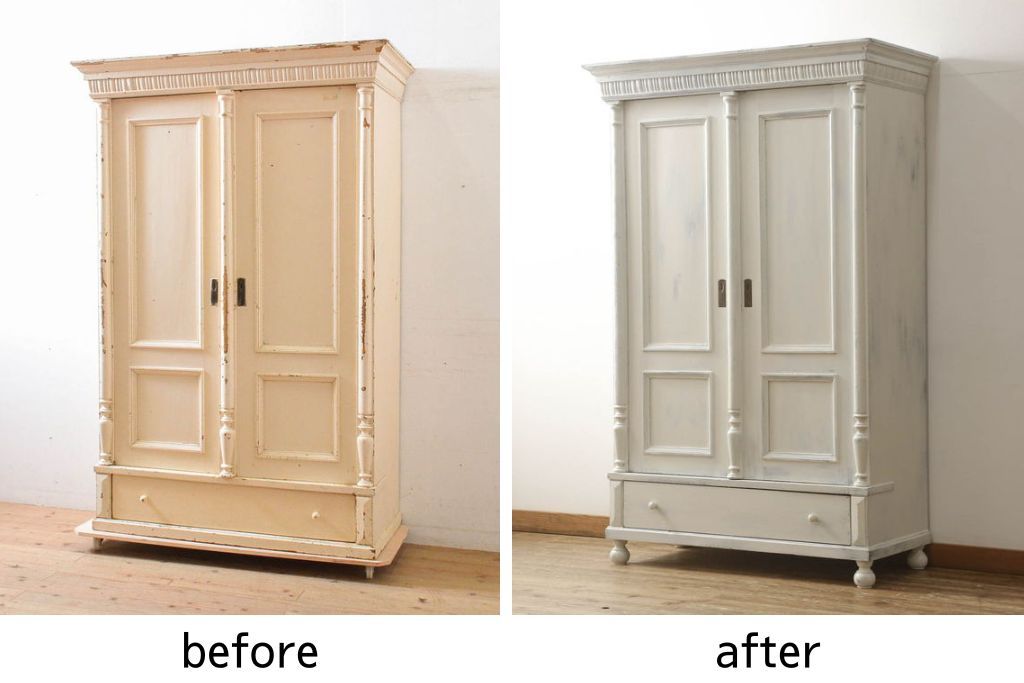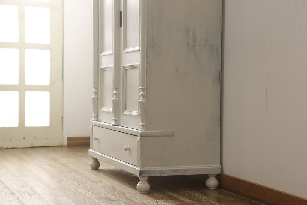 ワードローブをリペア&カスタム!木製脚 ・ハンガーポールを取り付け、開閉用の鍵を製作。既存の棚板は近しい色味で再着色し、本体はアンティークホワイトにペイント。(洋服タンス、収納棚、キャビネット、引き出し)