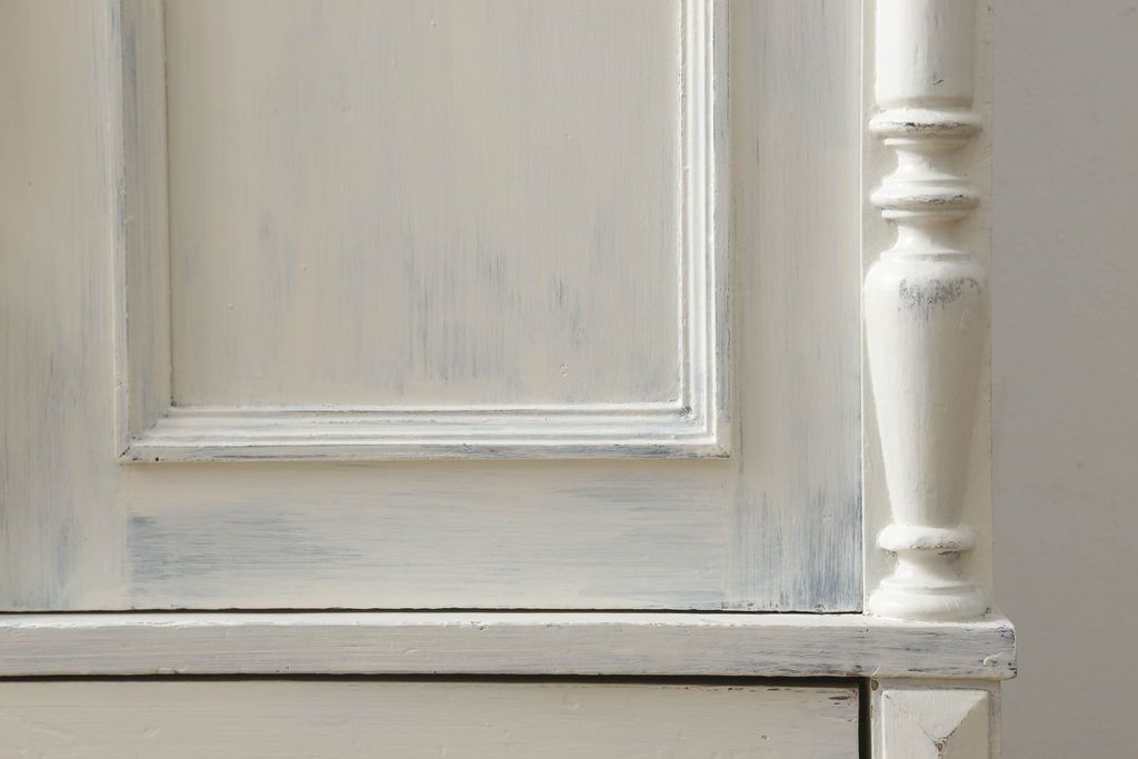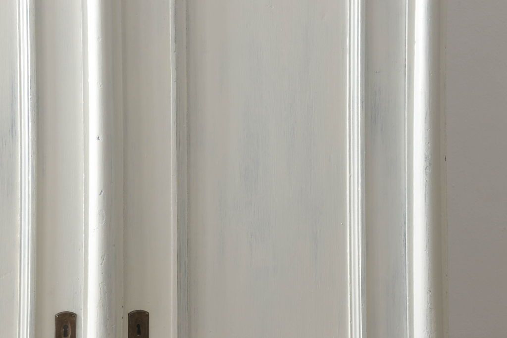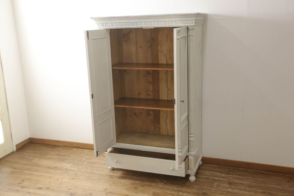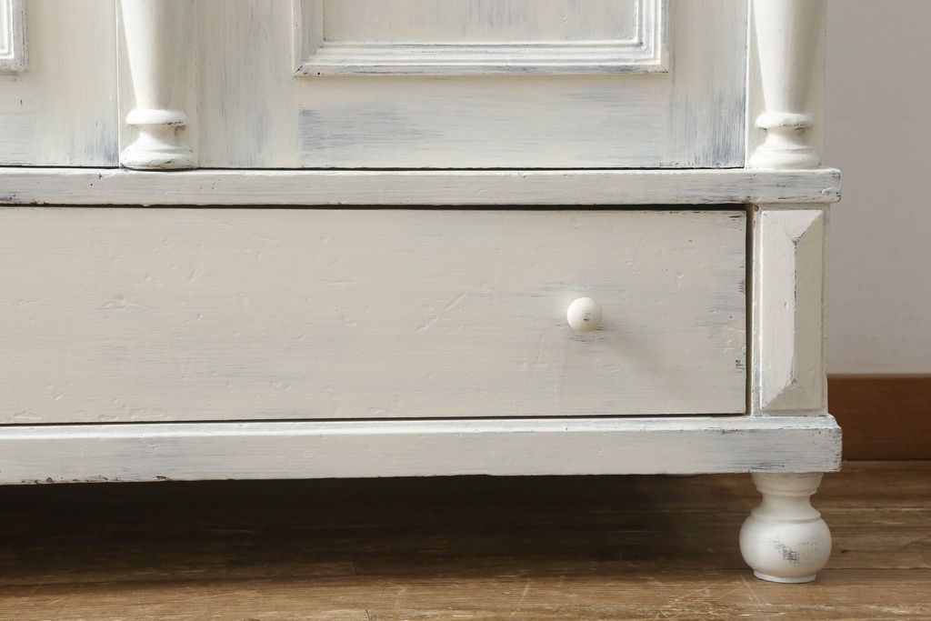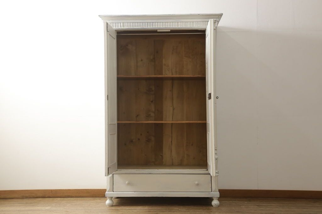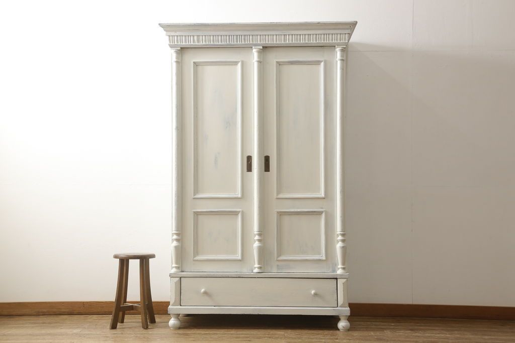 セミオーダー家具実績 > ワードローブをリペア&カスタム!木製脚 ・ハンガーポールを取り付け、開閉用の鍵を製作。既存の棚板は近しい色味で再着色し、本体はアンティークホワイトにペイント。(洋服タンス、収納棚、キャビネット、引き出し)